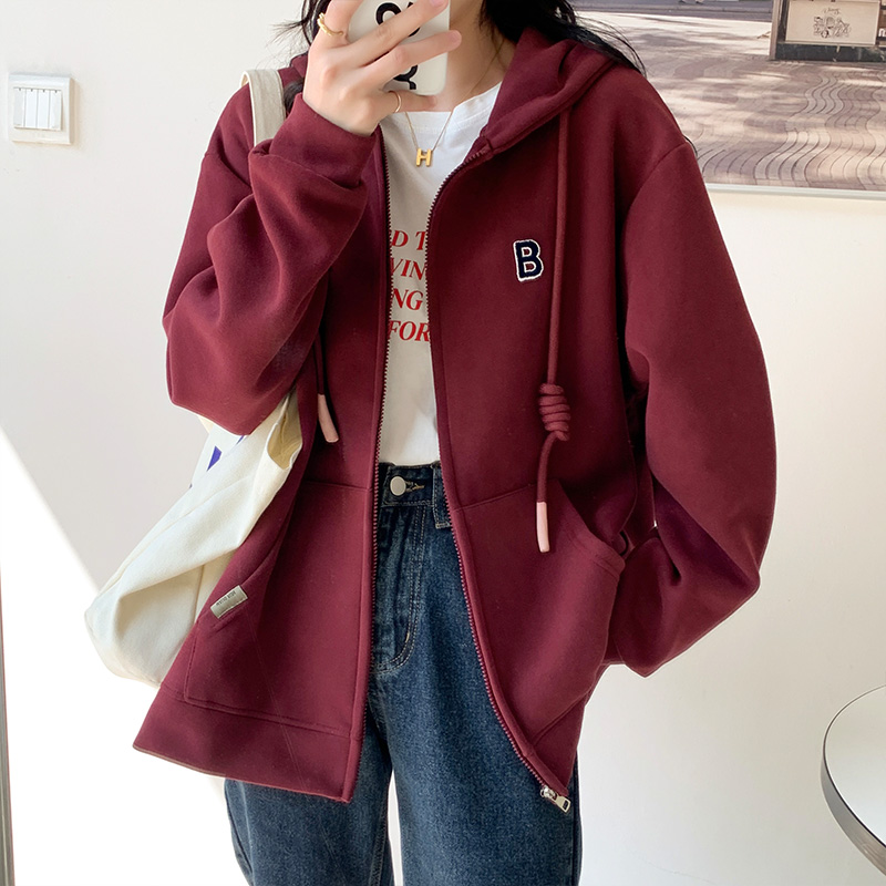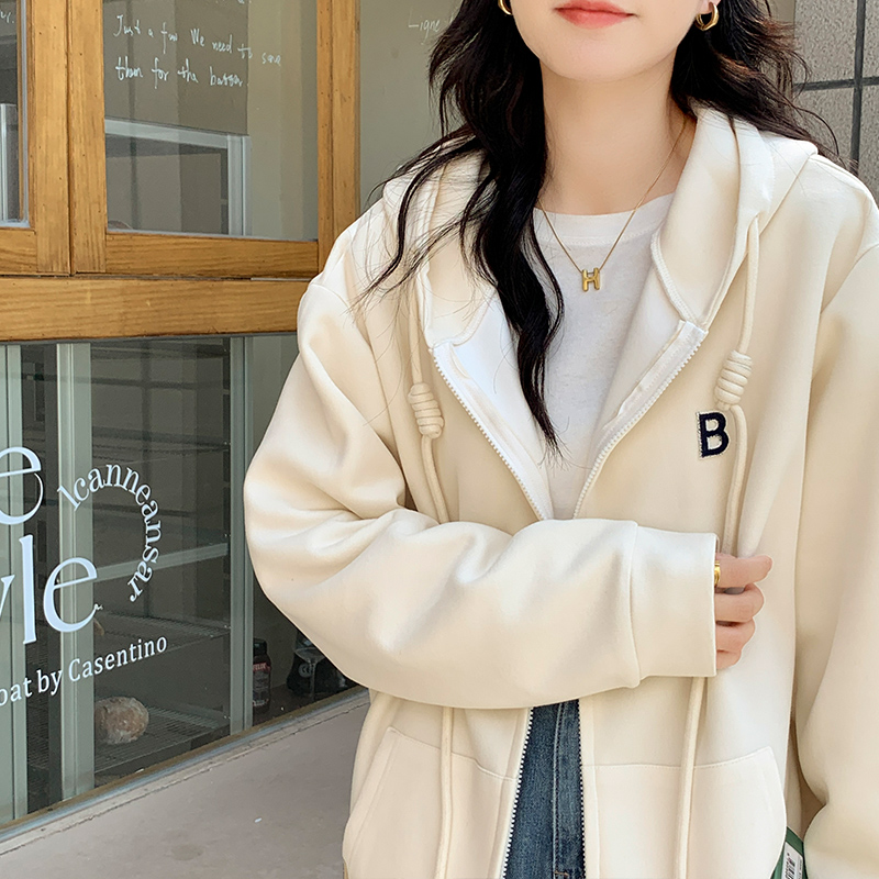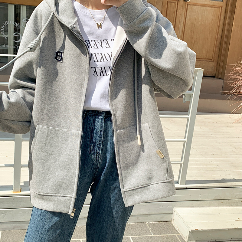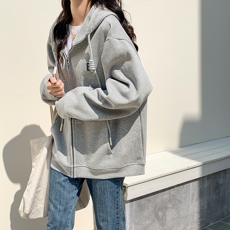 拉鍊連帽運動衫女春秋2023新款灰色字母開衫時尚百搭加絨寬鬆外套女