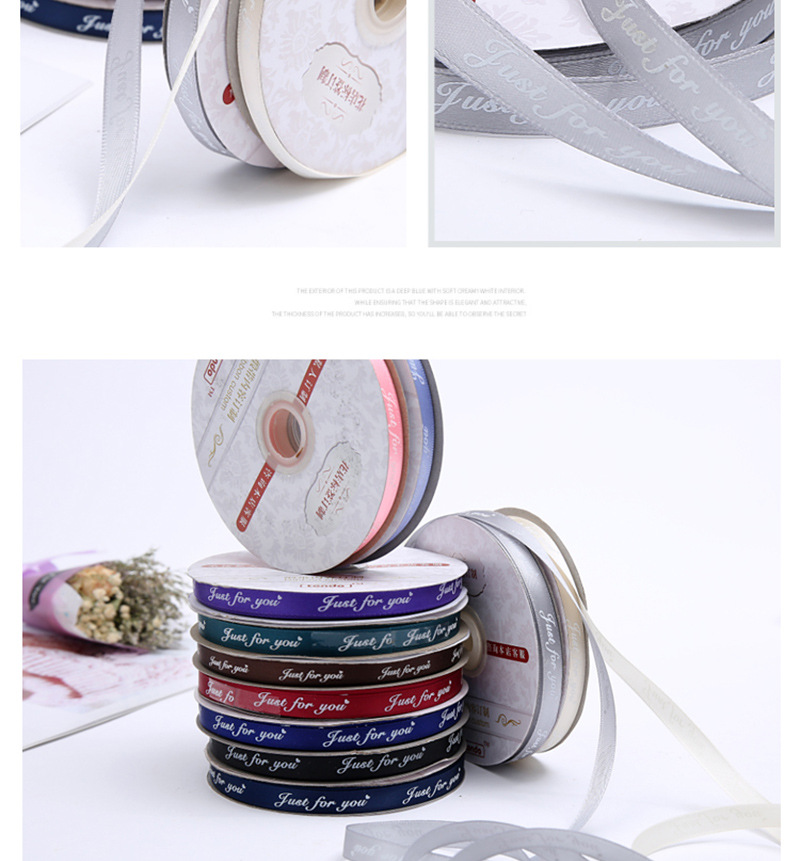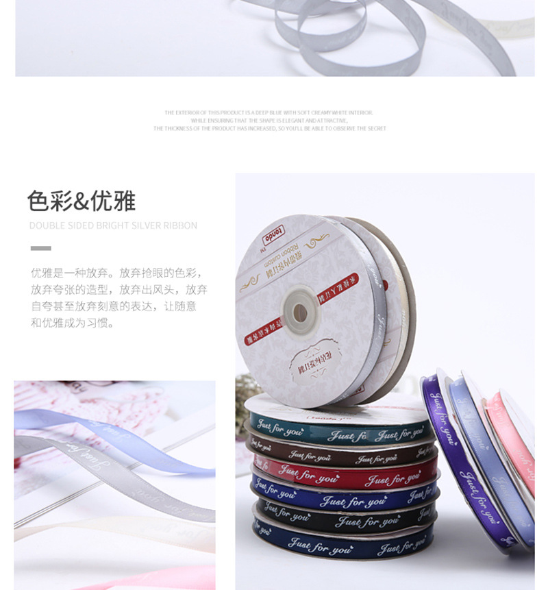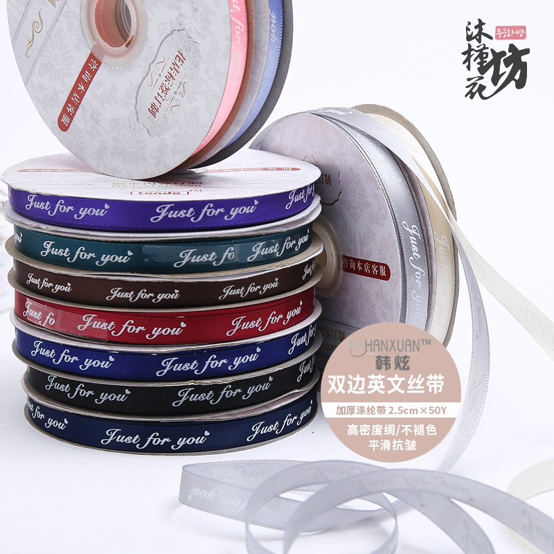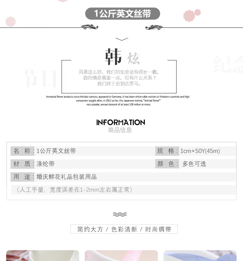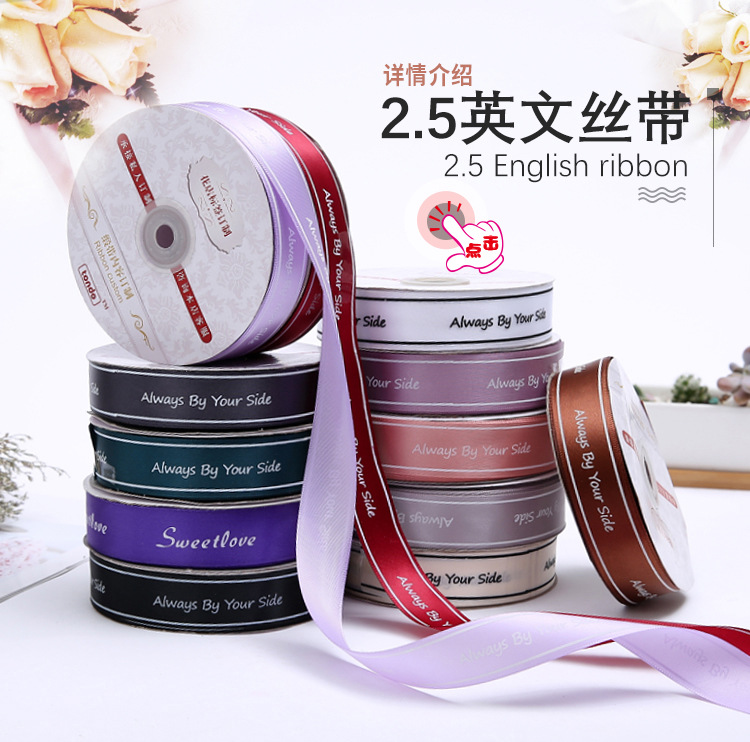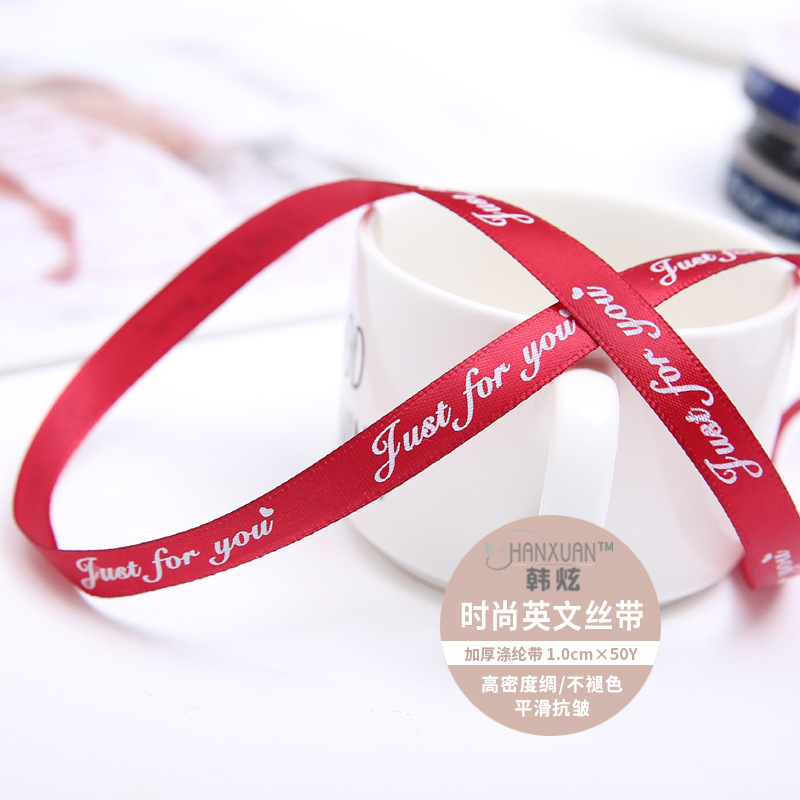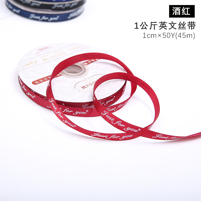 1公分英文丝带 涤纶带-只有你织带  【规格】1厘米*50码 印花丝带 【特点】无论是包鲜花还是礼品都是百搭不会出错的,颜色精心挑选,质感和色泽都很好的一款  【用途】可用于鲜花花束、礼品、蛋糕盒等包装