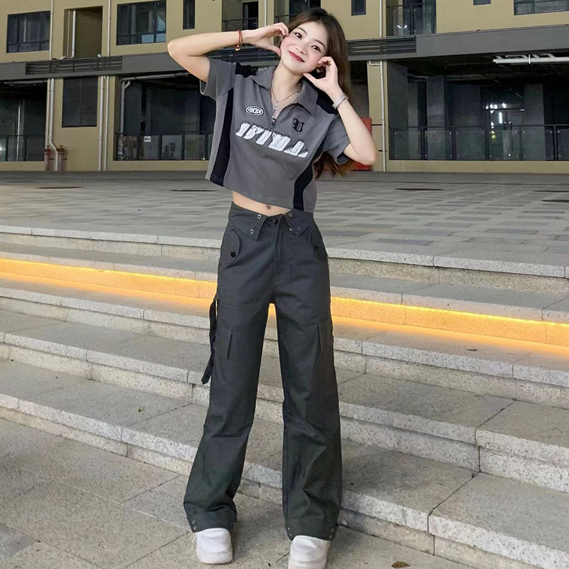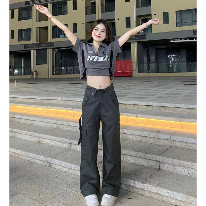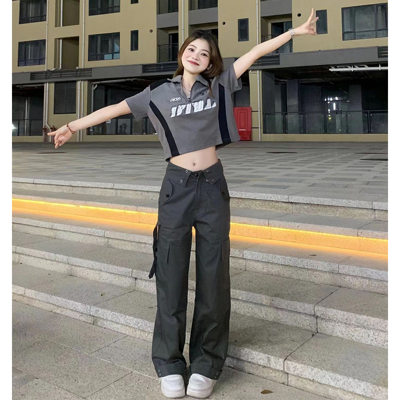 深灰翻腰美式高街工裝褲口袋寬鬆運動褲女男高腰顯瘦闊腿褲子秋潮