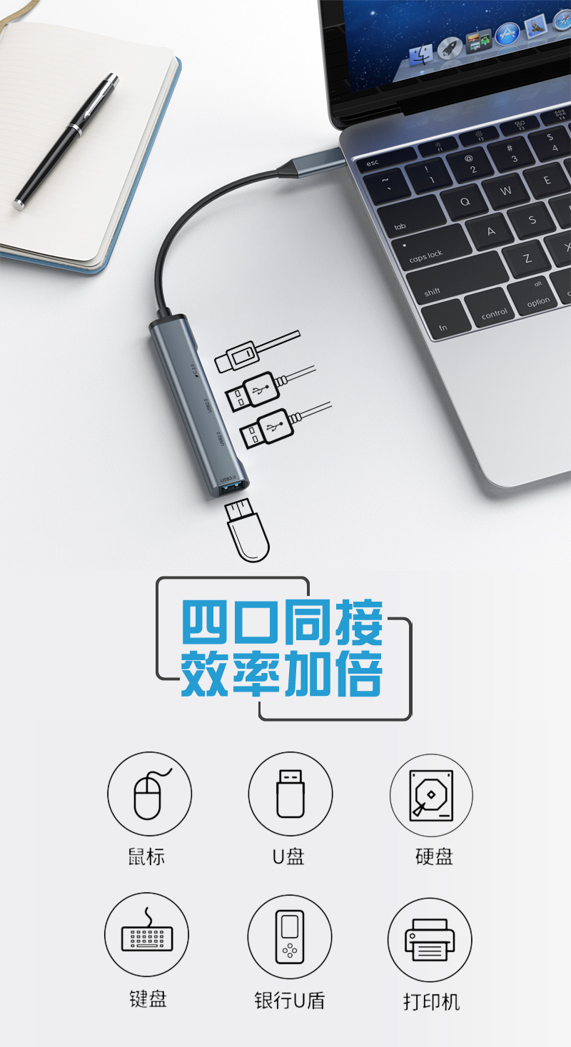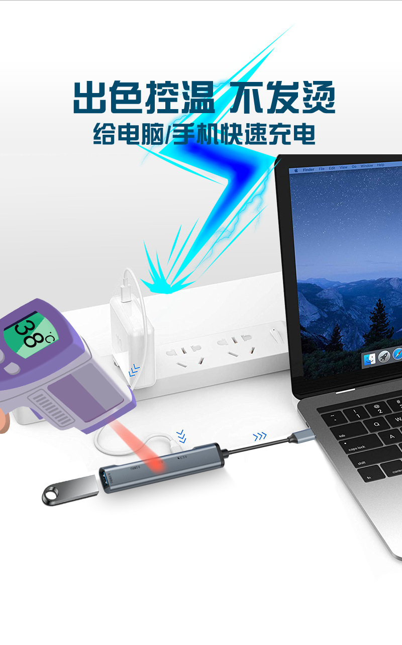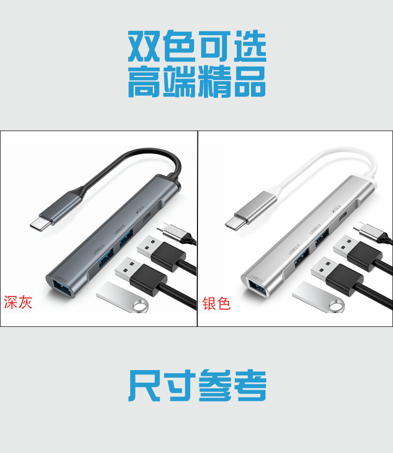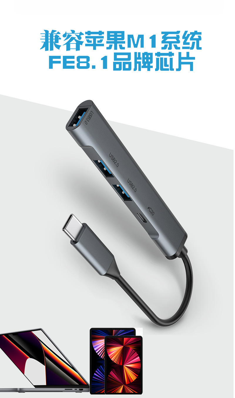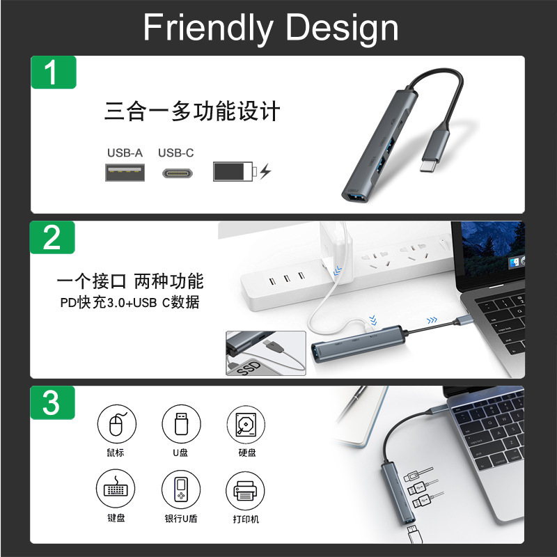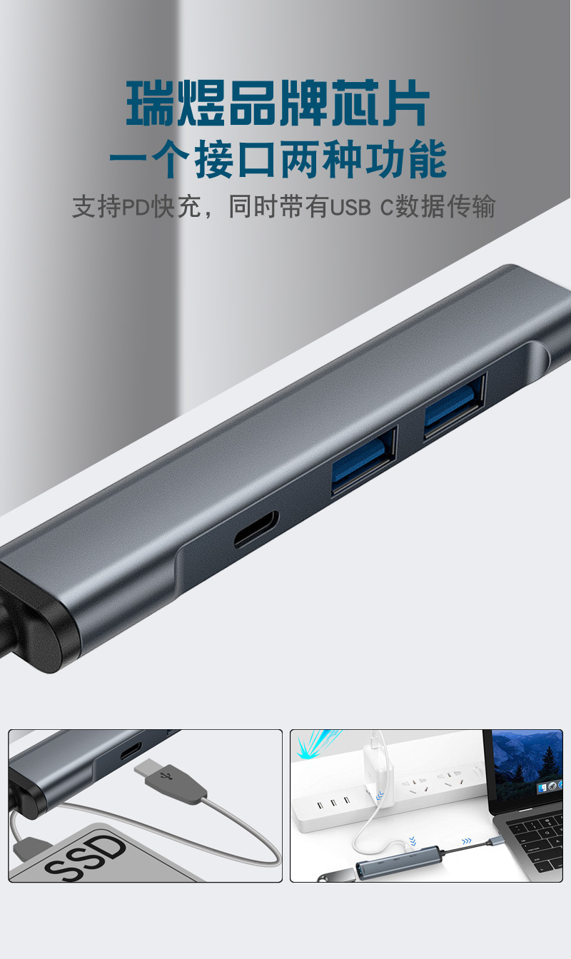 USB HUB扩展器真PD快充电手机集分线器四口兼M1笔记本TypeC拓展坞