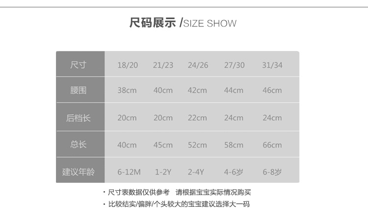 童袜尺码 18/20码6-12个月,21/23码1-2岁,24/26码2-4岁,27/30码4-6岁,31/34码6-8岁