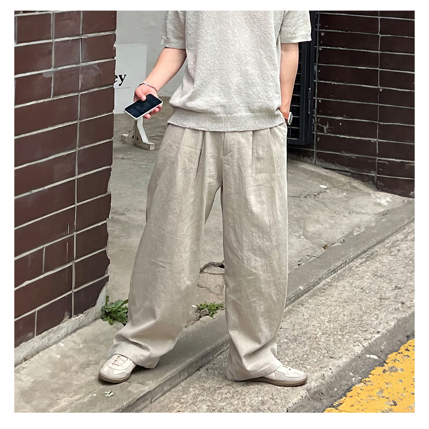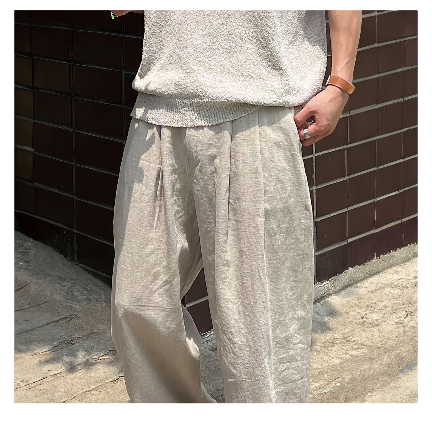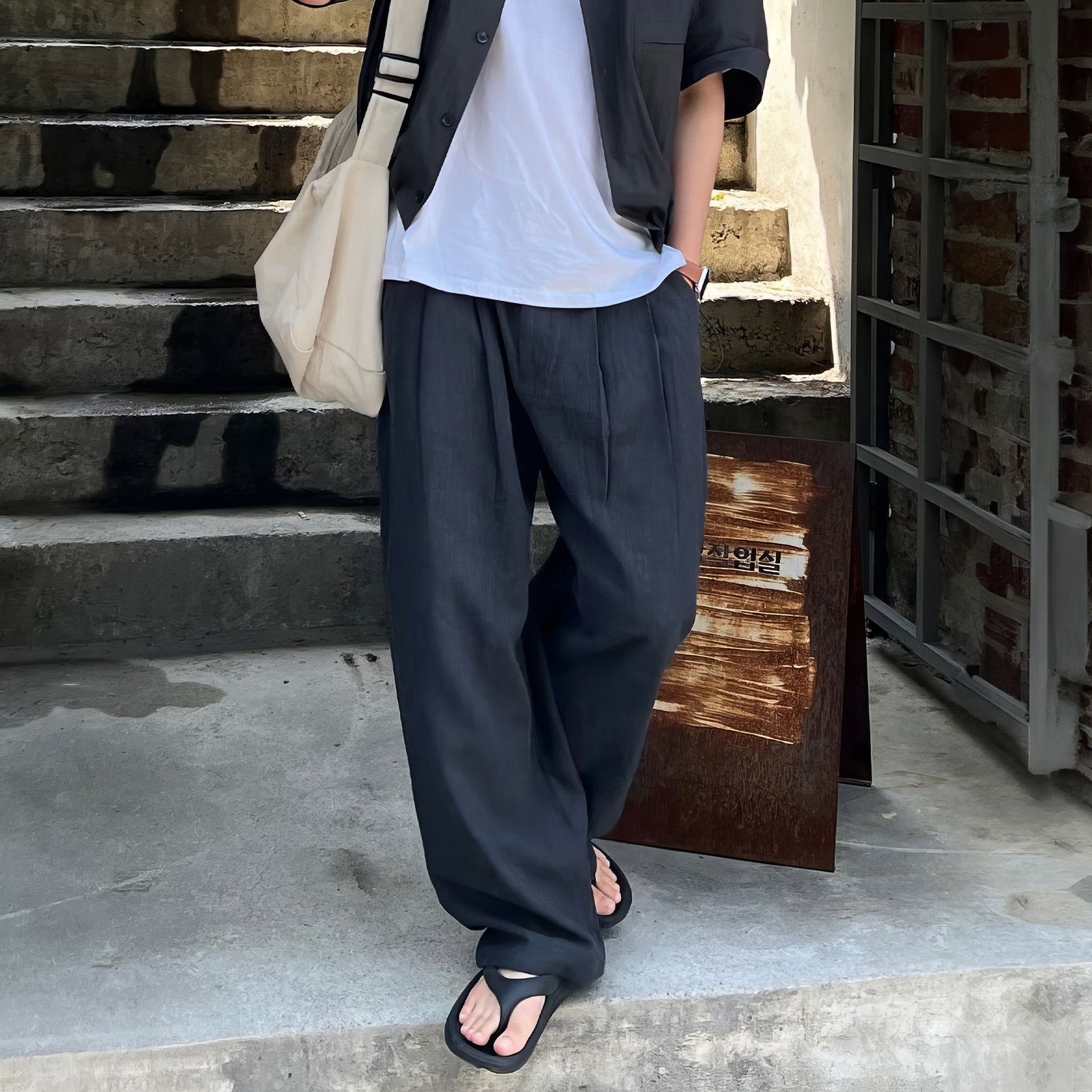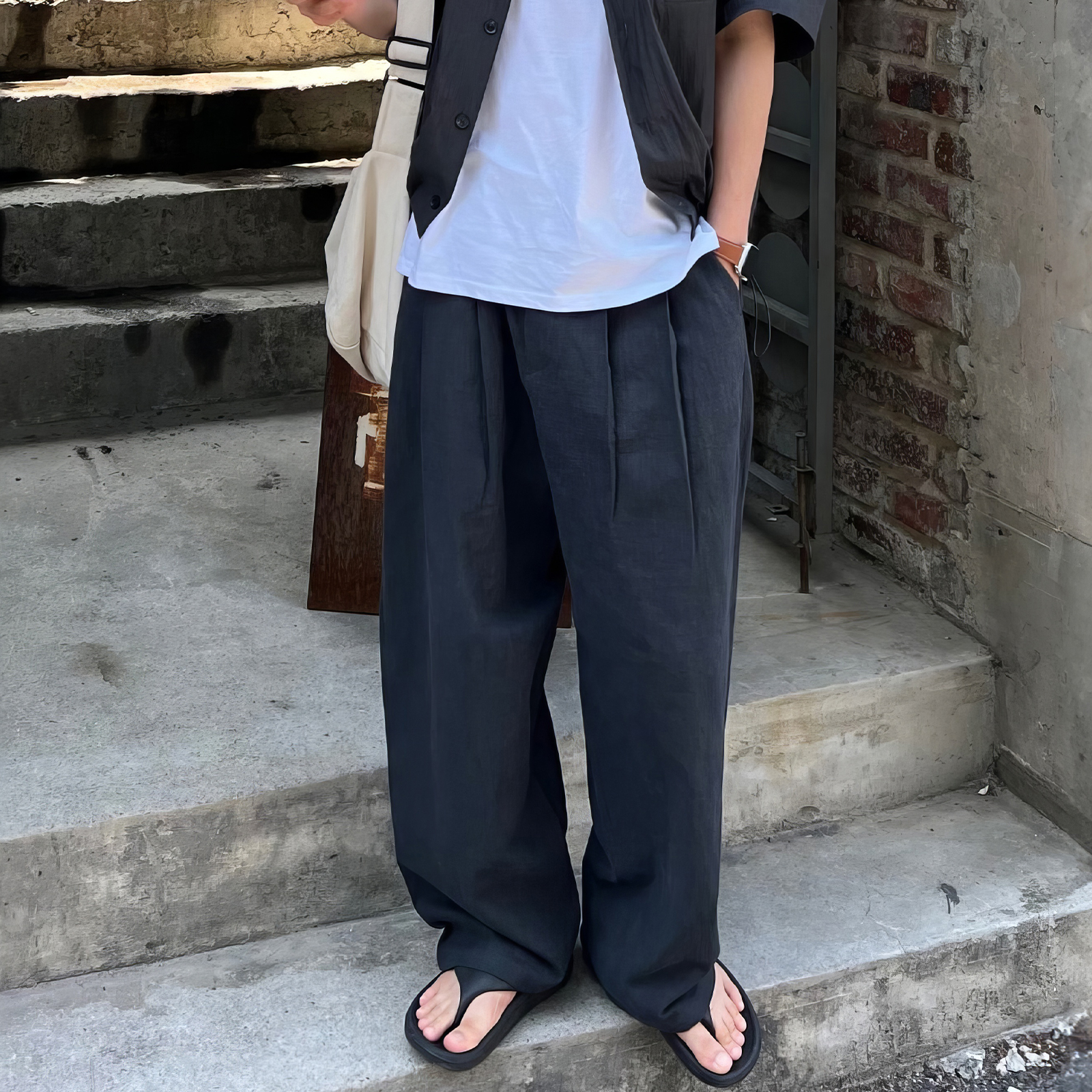 純色休閒直筒褲男士夏季日系復古個性痞帥長褲小眾垂感寬鬆闊腿褲