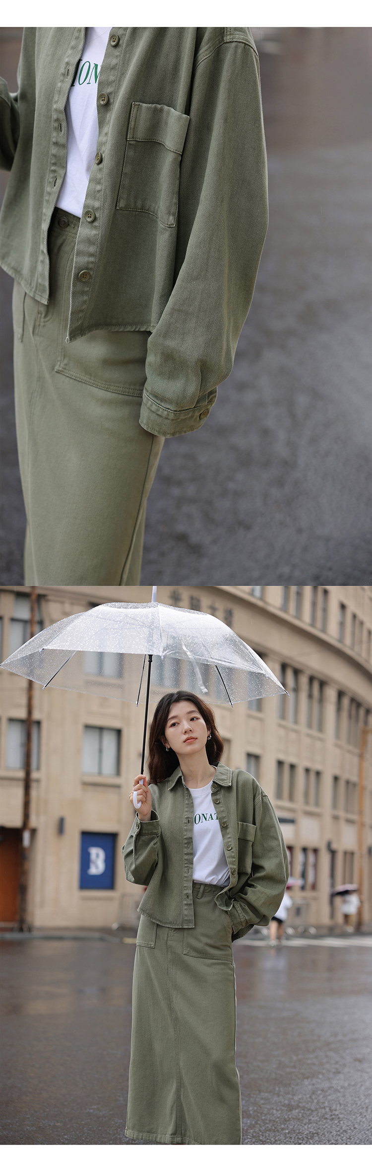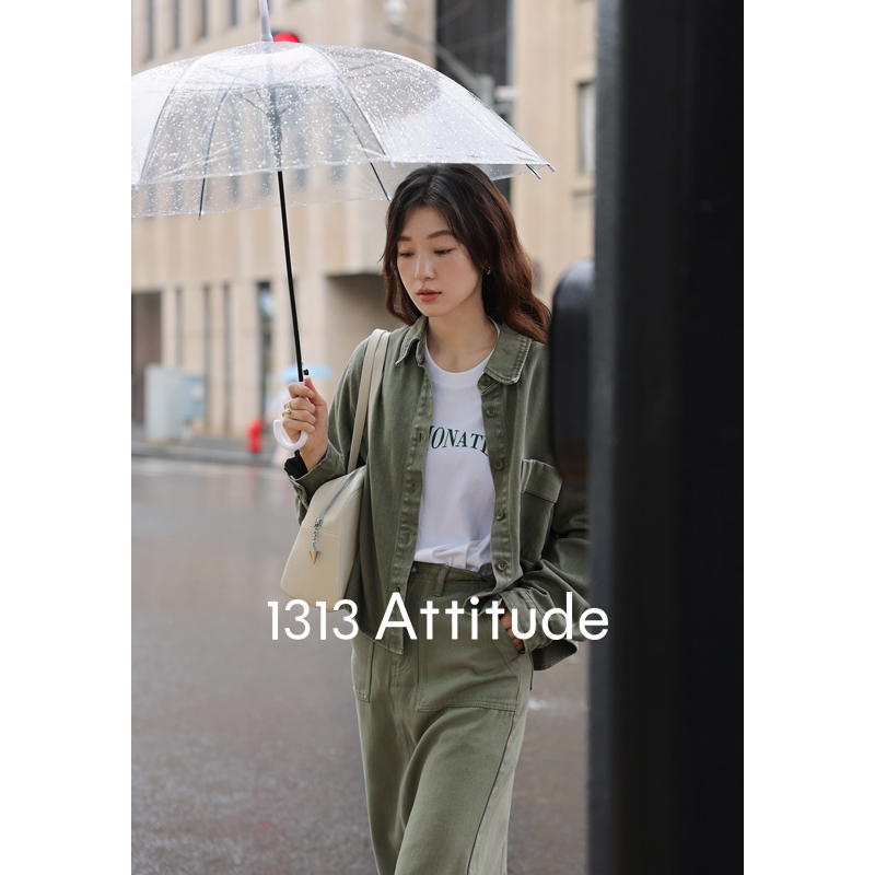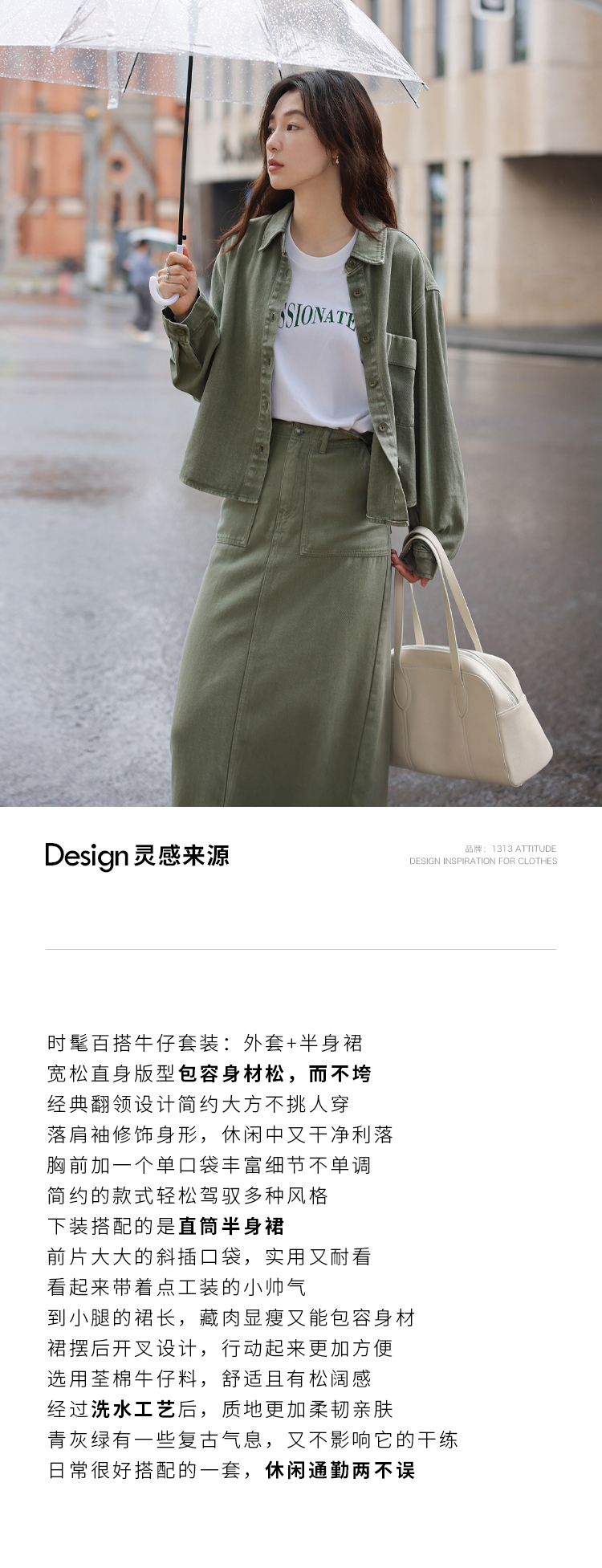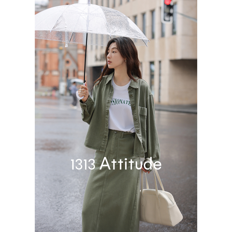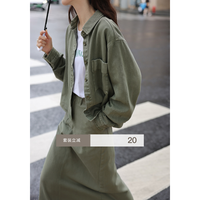 1313小眾復古青灰綠廓形牛仔秋女套裝:長袖夾克外套+顯瘦半身裙