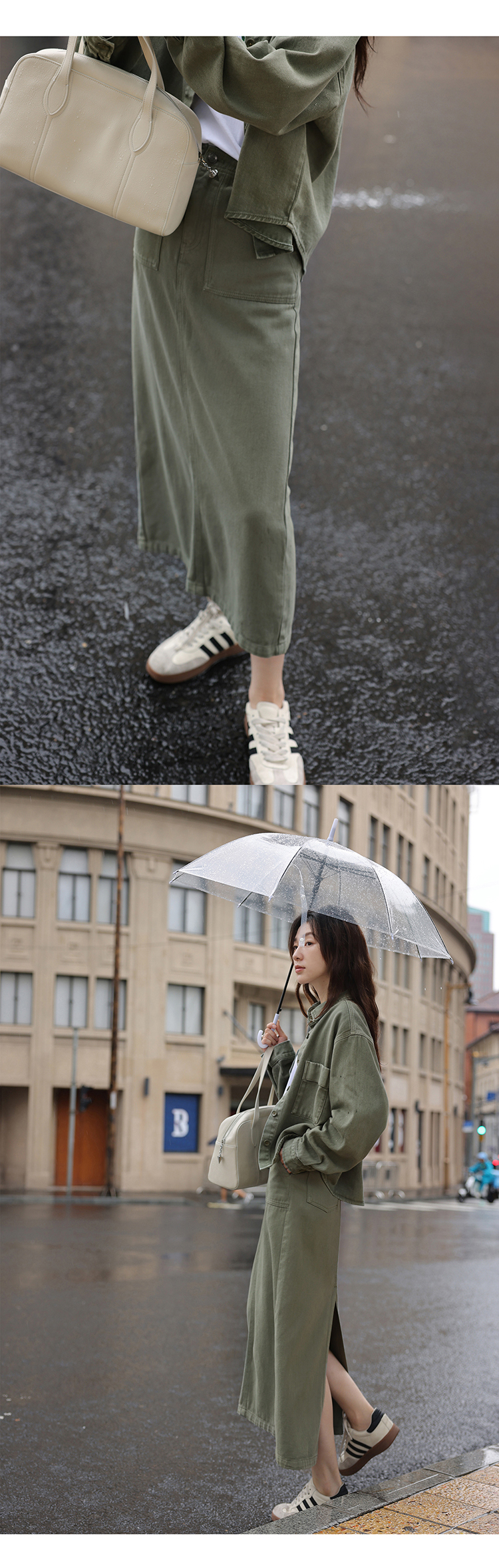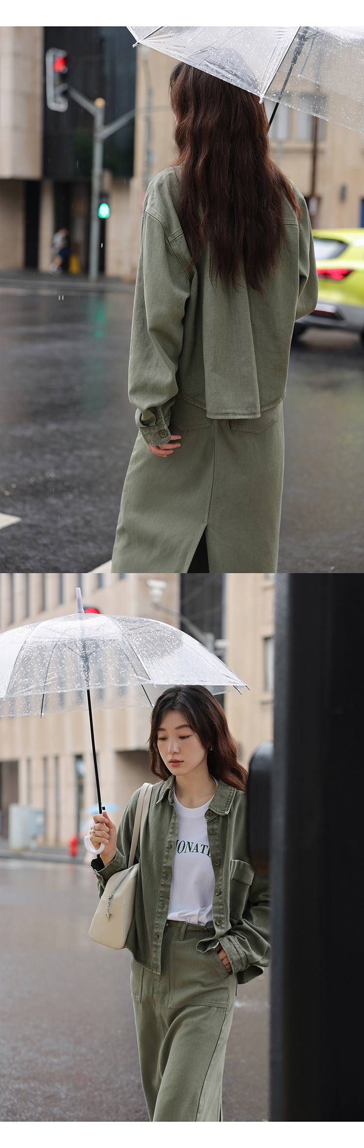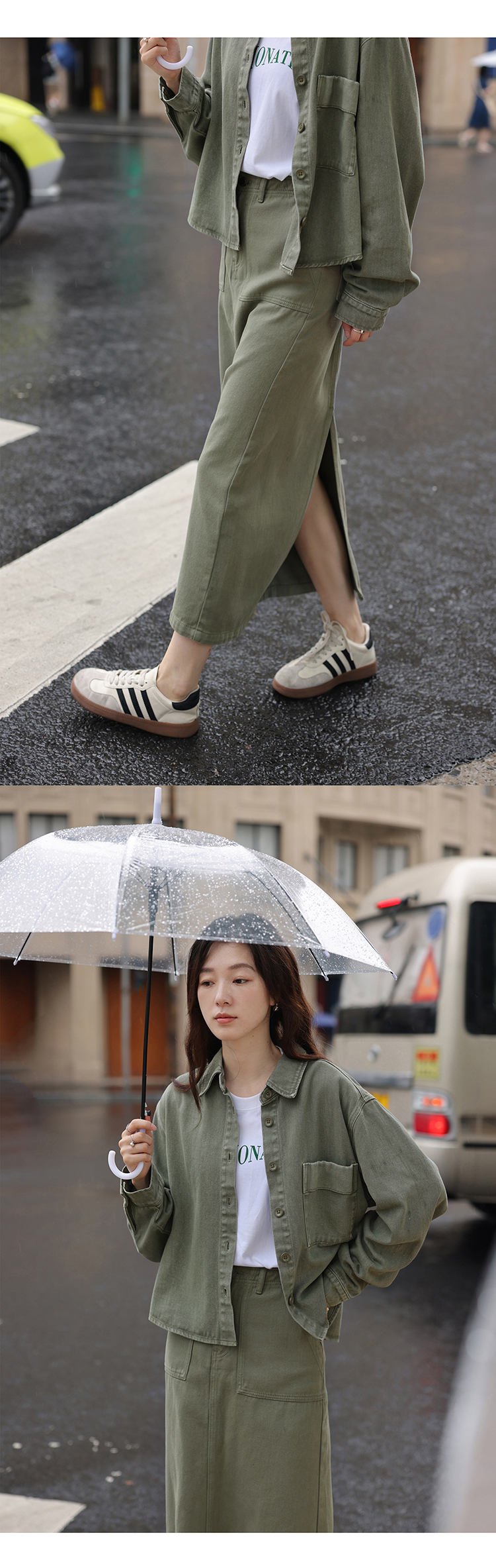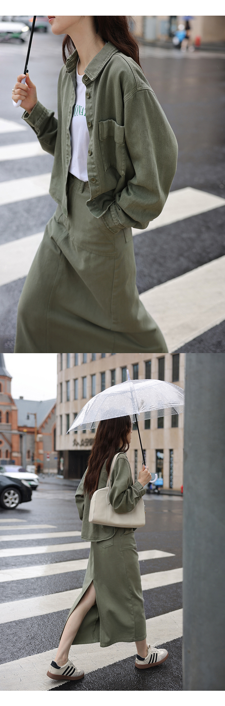 1313小眾復古青灰綠廓形牛仔秋女套裝:長袖夾克外套+顯瘦半身裙