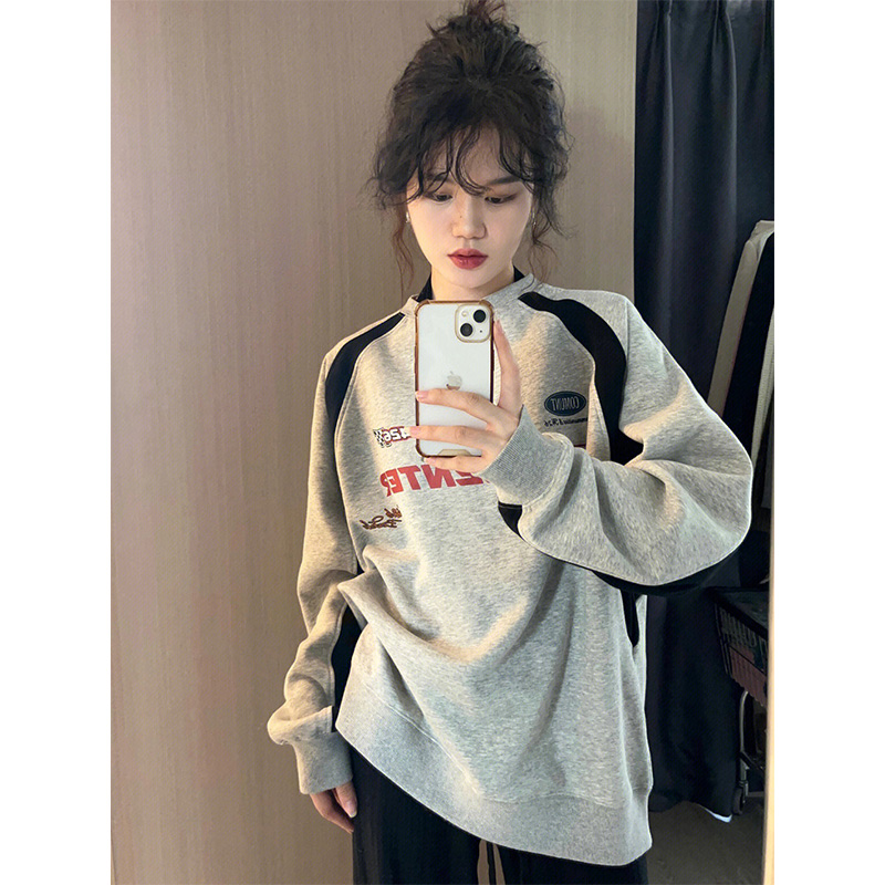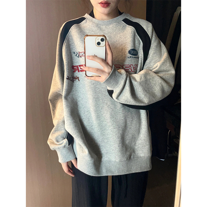 國潮美式撞色字母印花厚棉T女春秋潮牌高街小眾設計感情侶長袖上衣