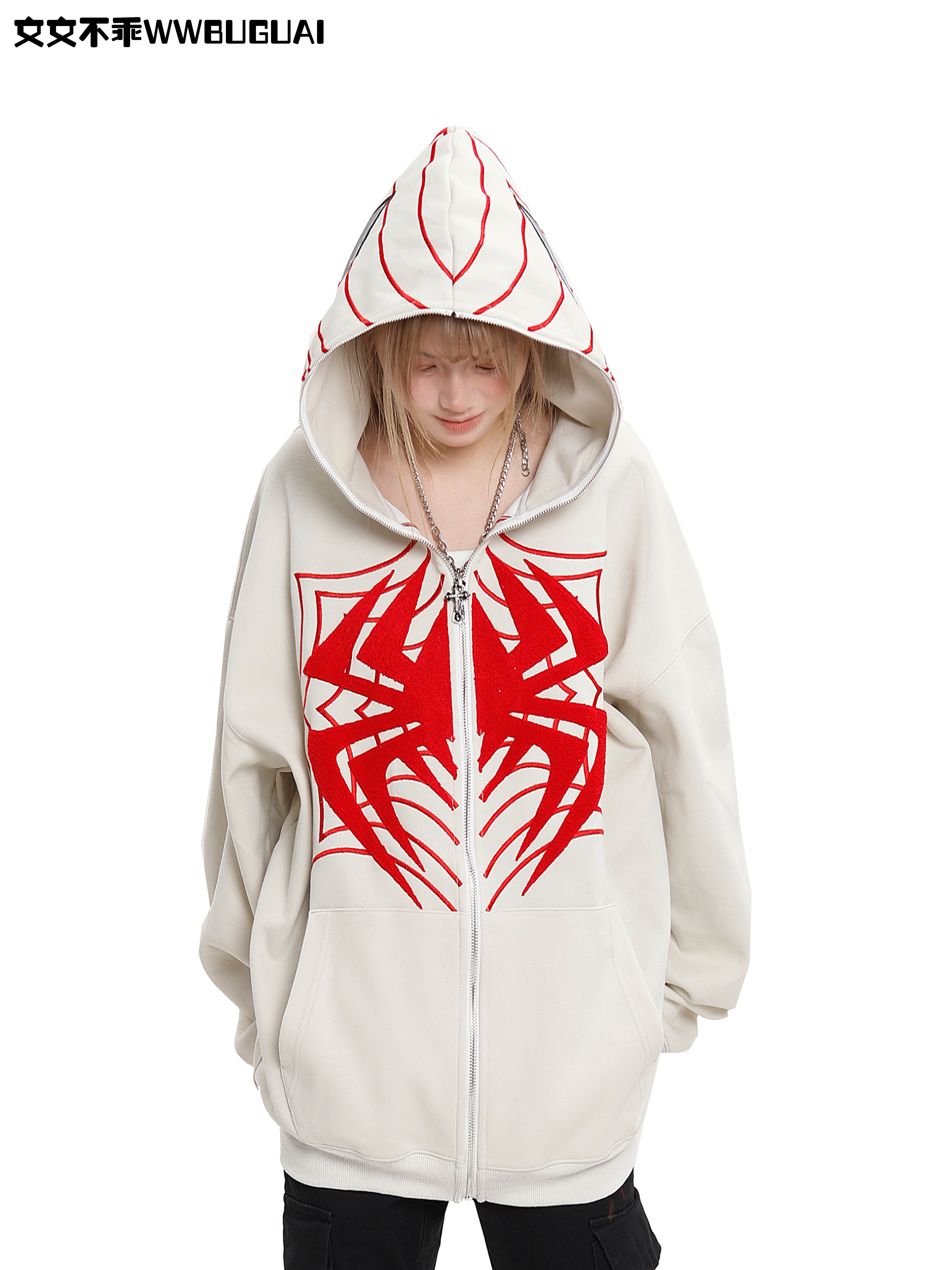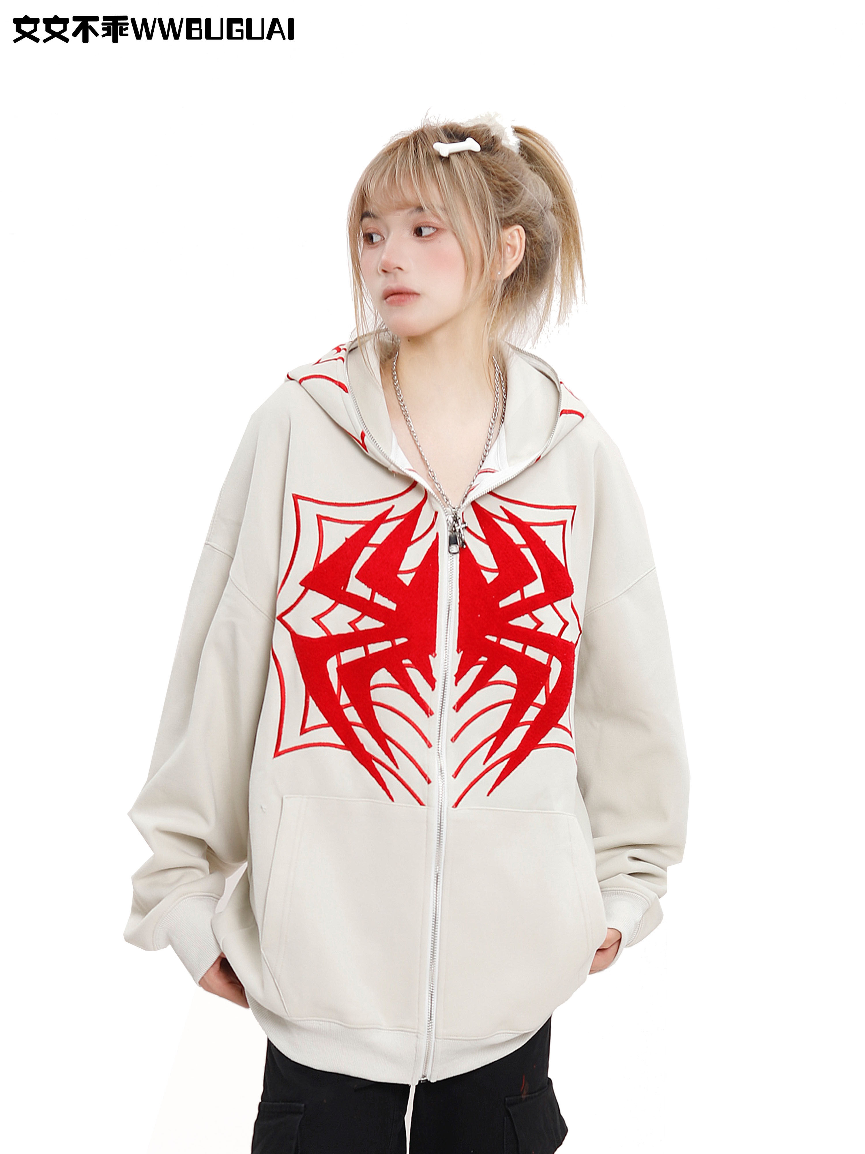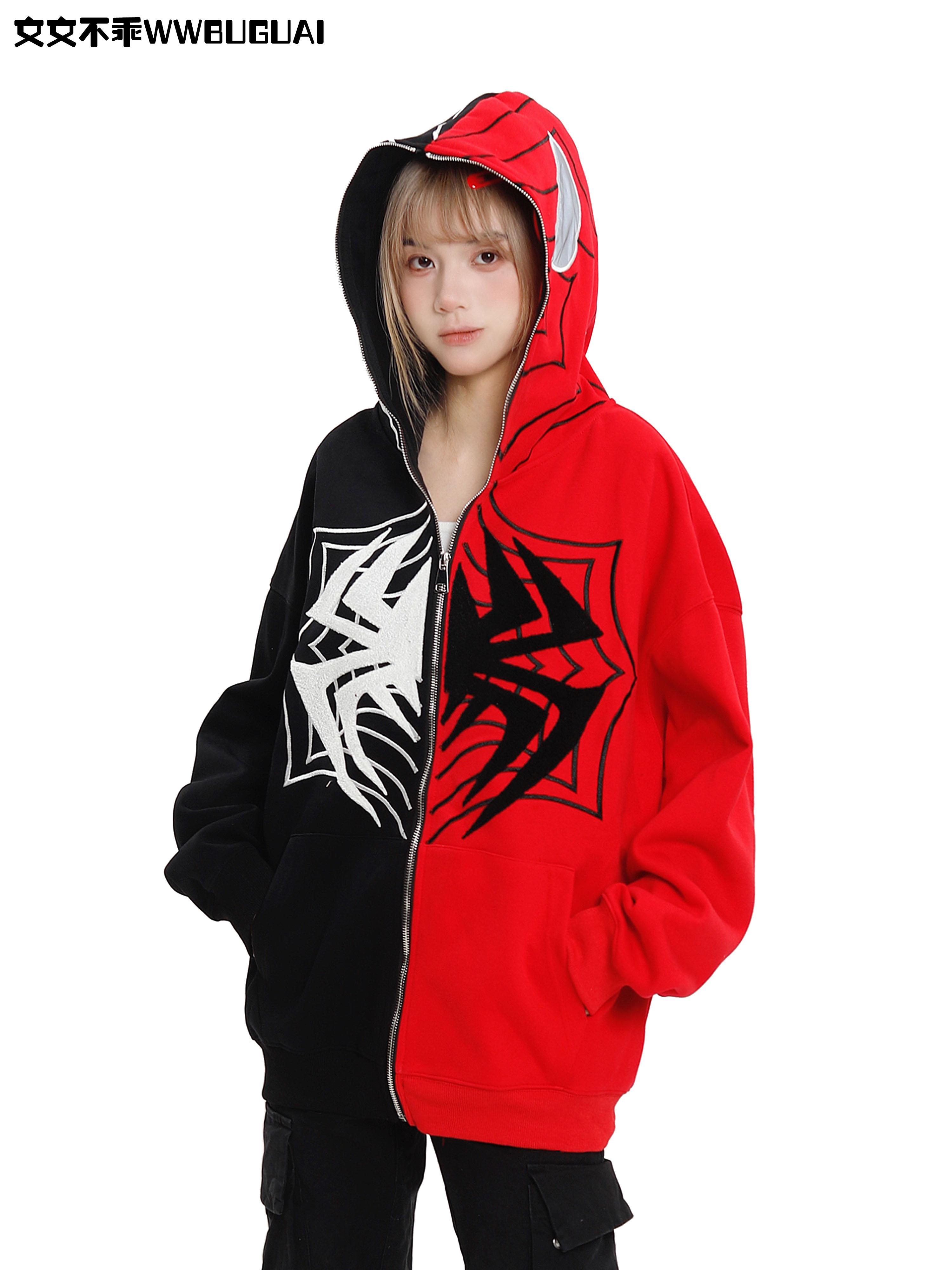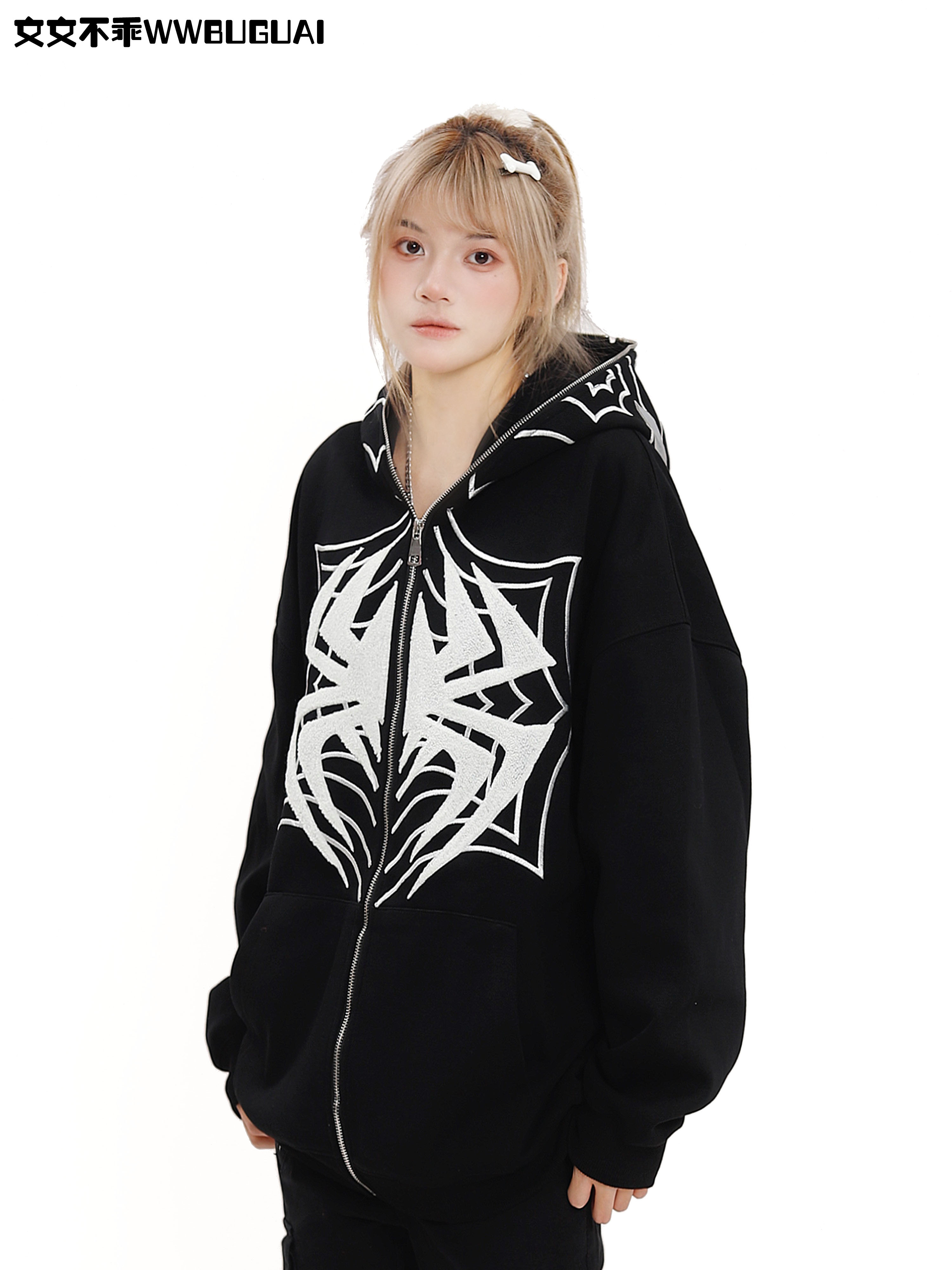 文文不乖美式復古蜘蛛印花連帽開衫衛衣女春秋季寬鬆情侶休閒上衣