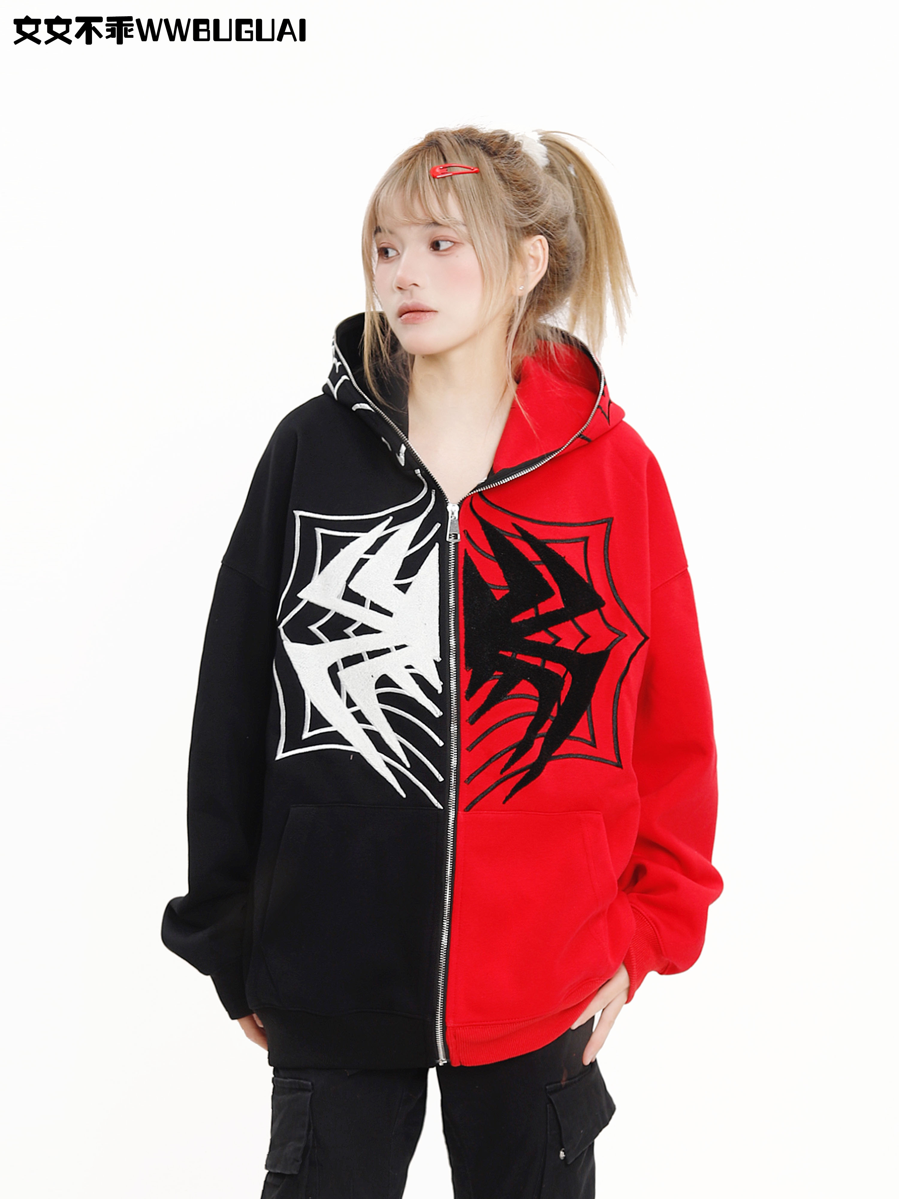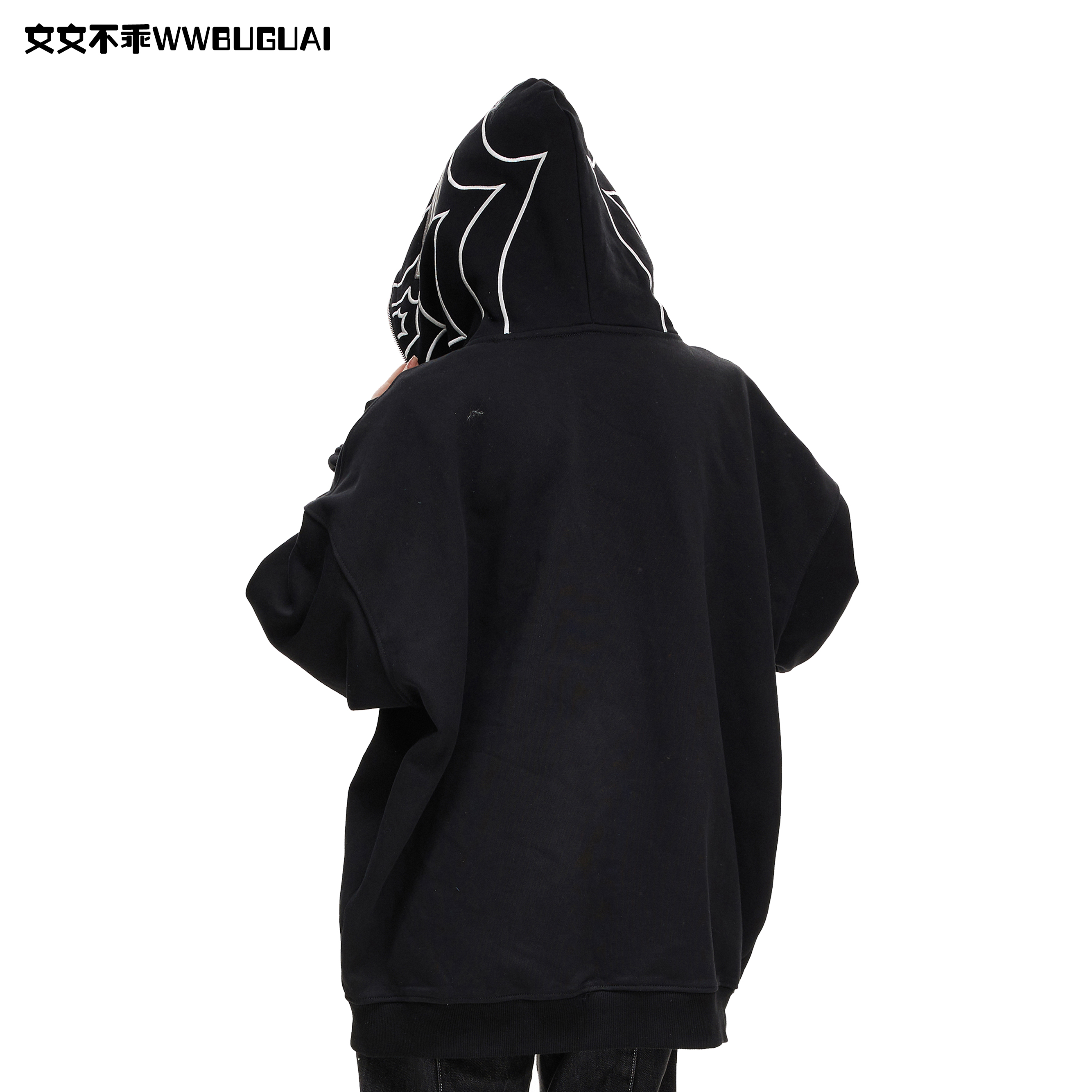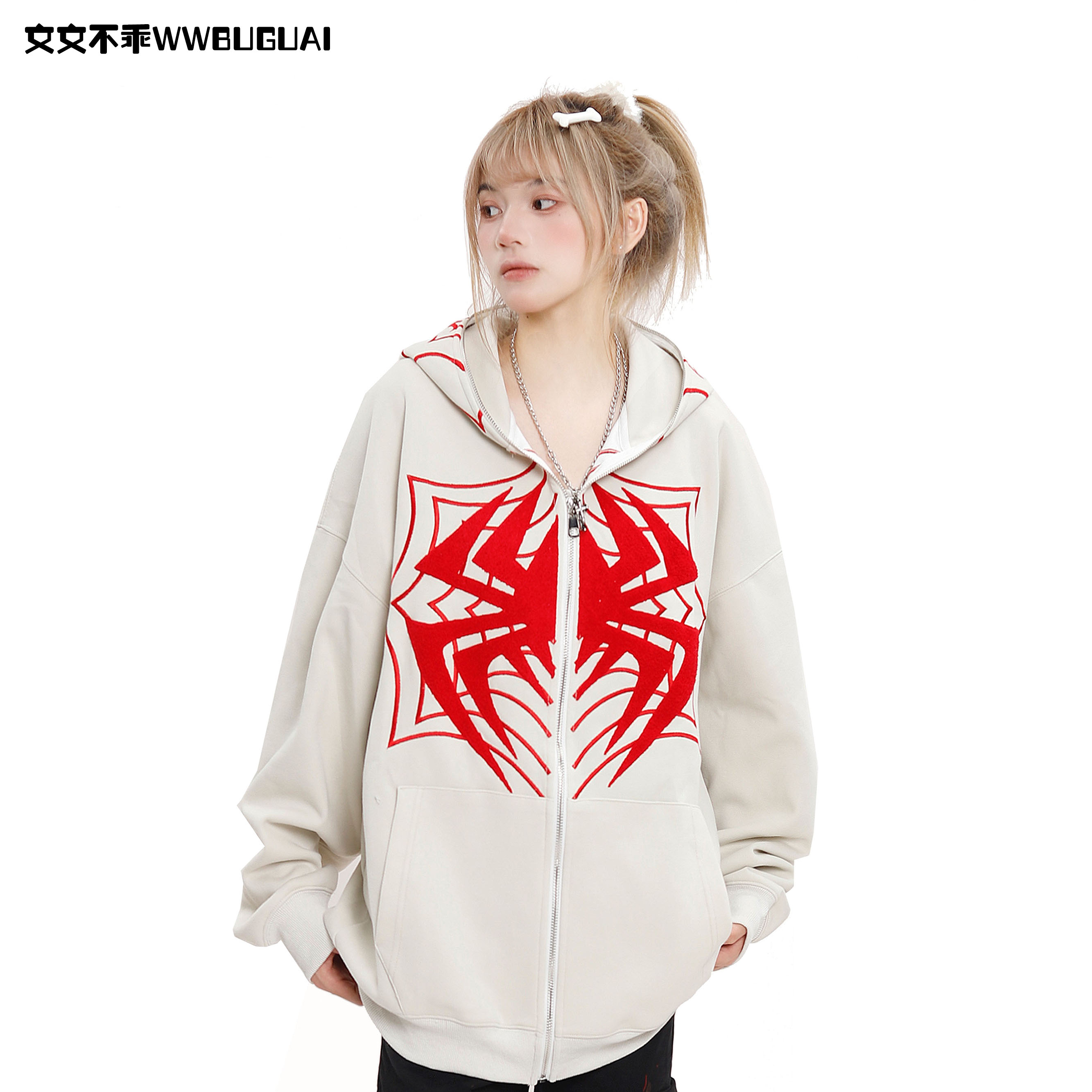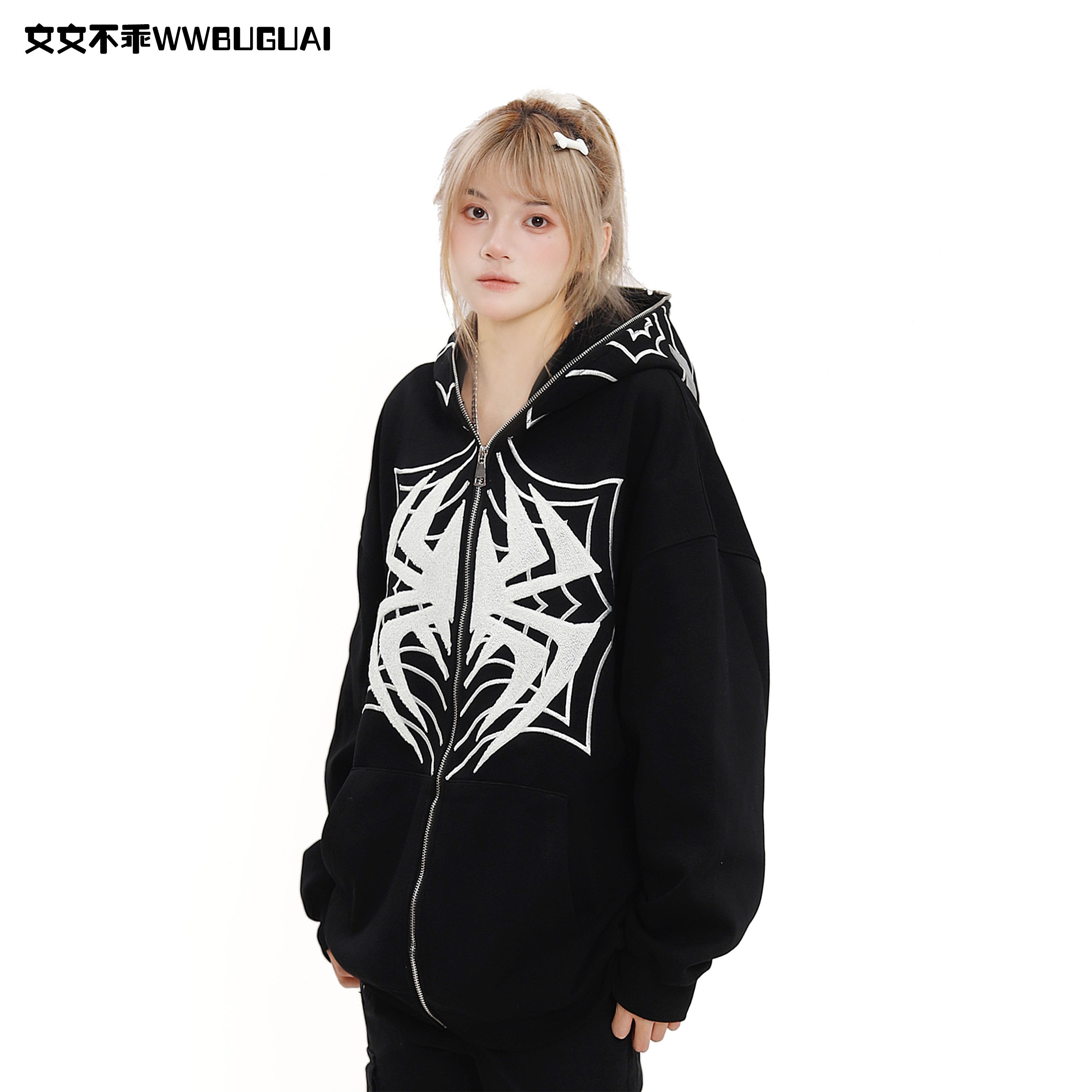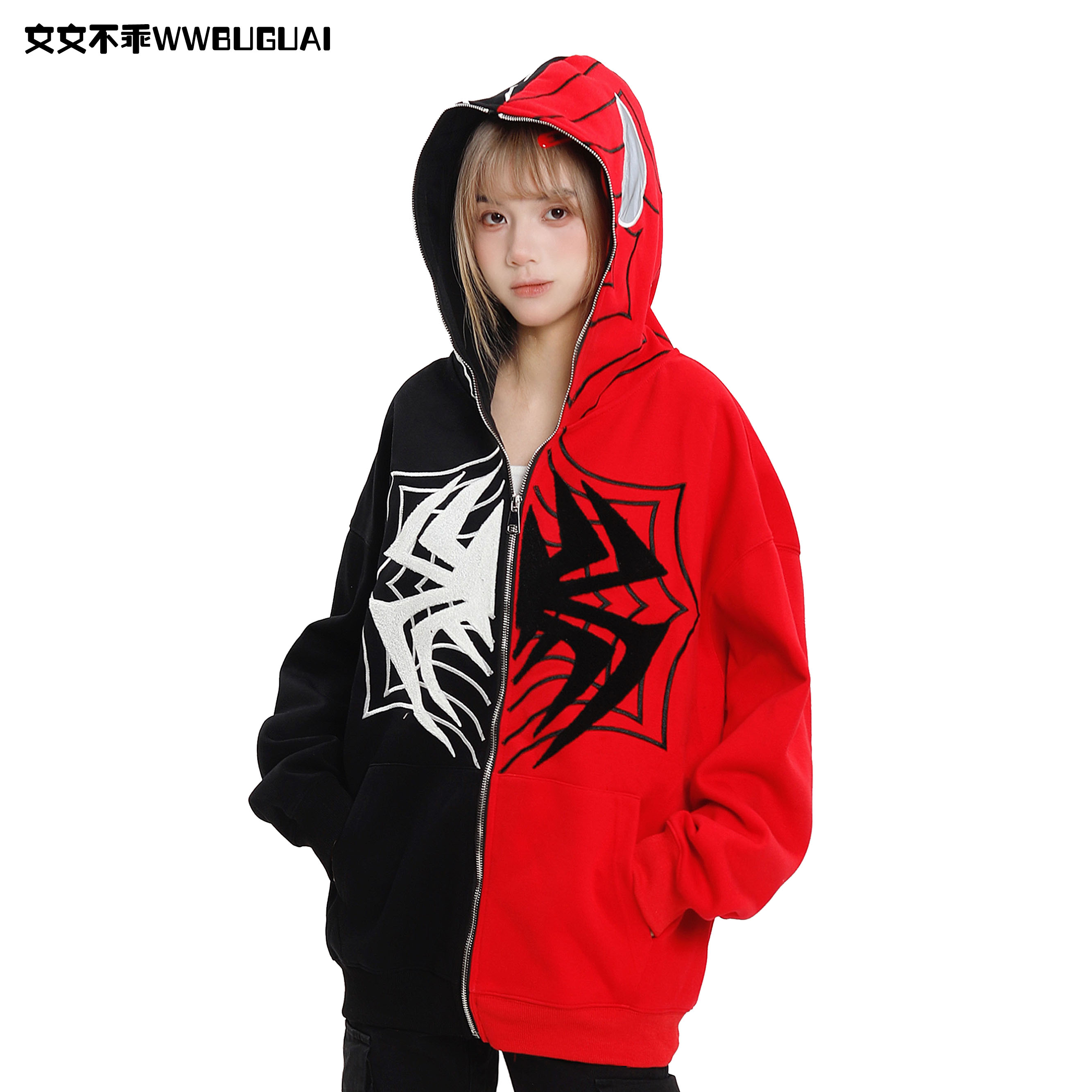 文文不乖美式復古蜘蛛印花連帽開衫衛衣女春秋季寬鬆情侶休閒上衣