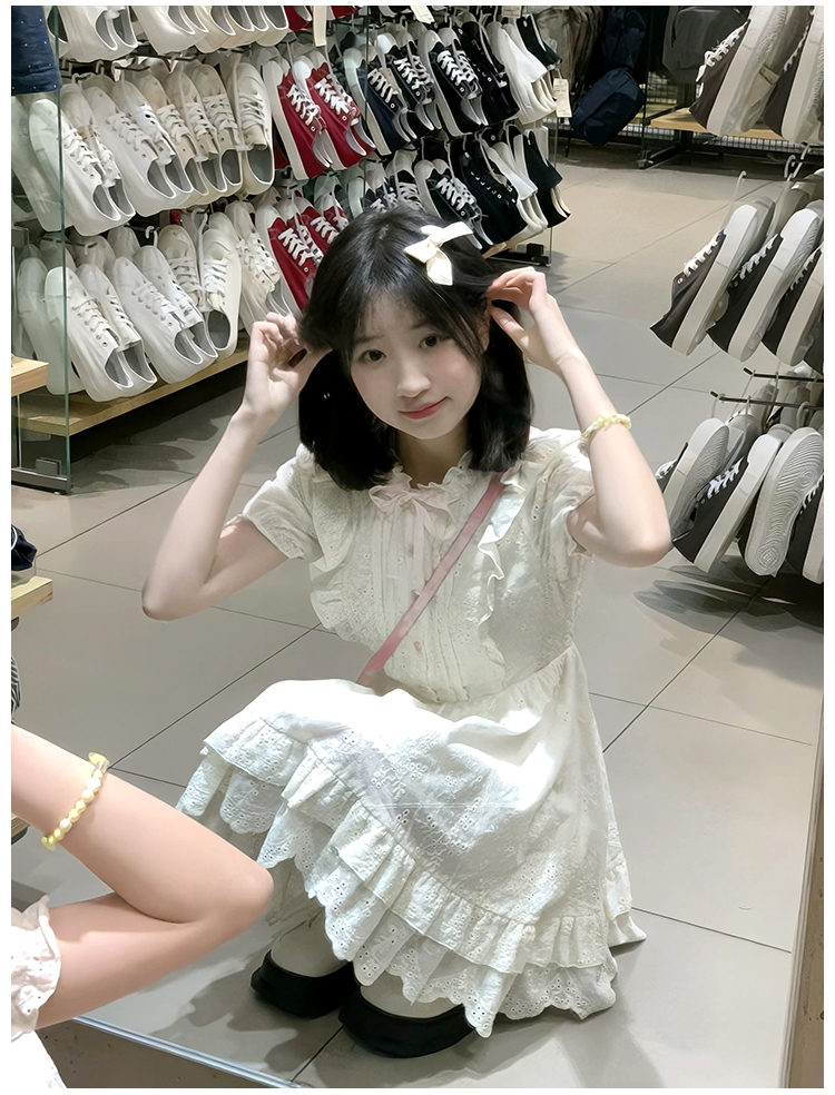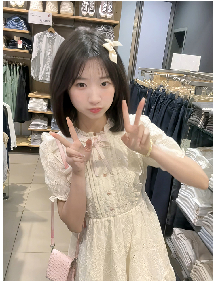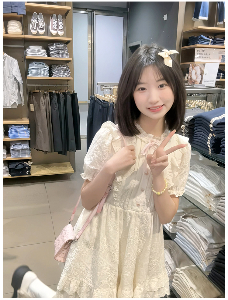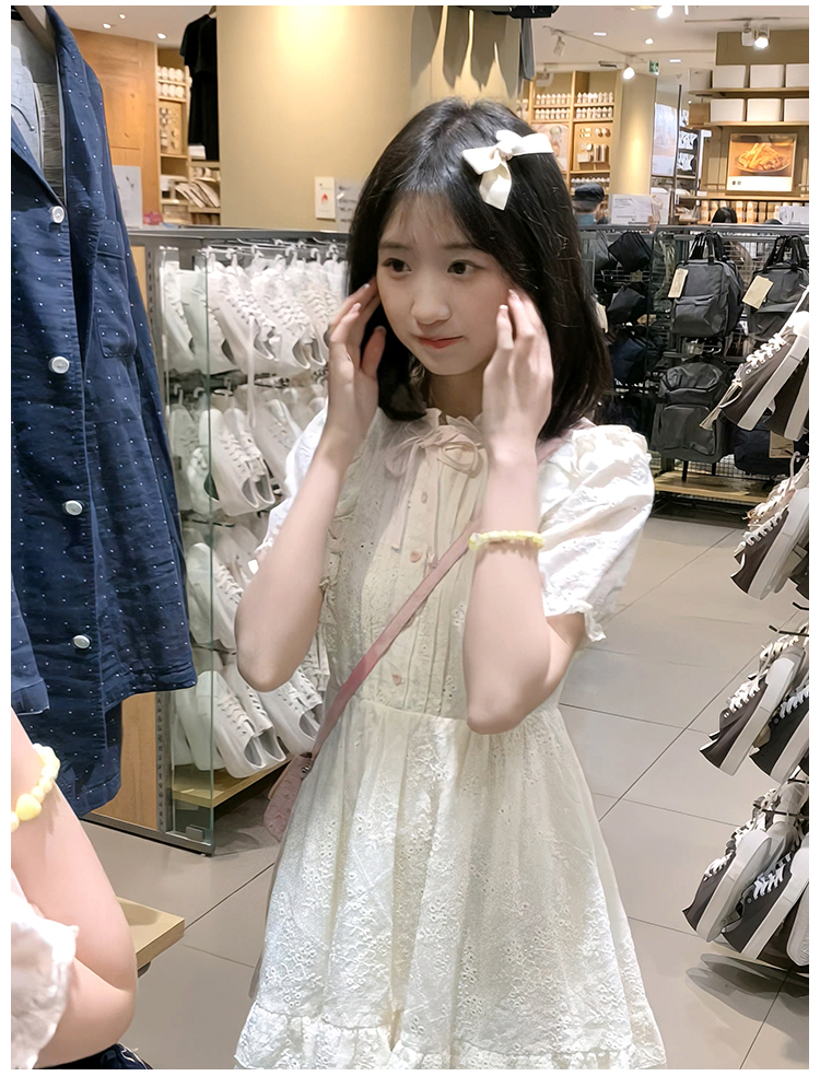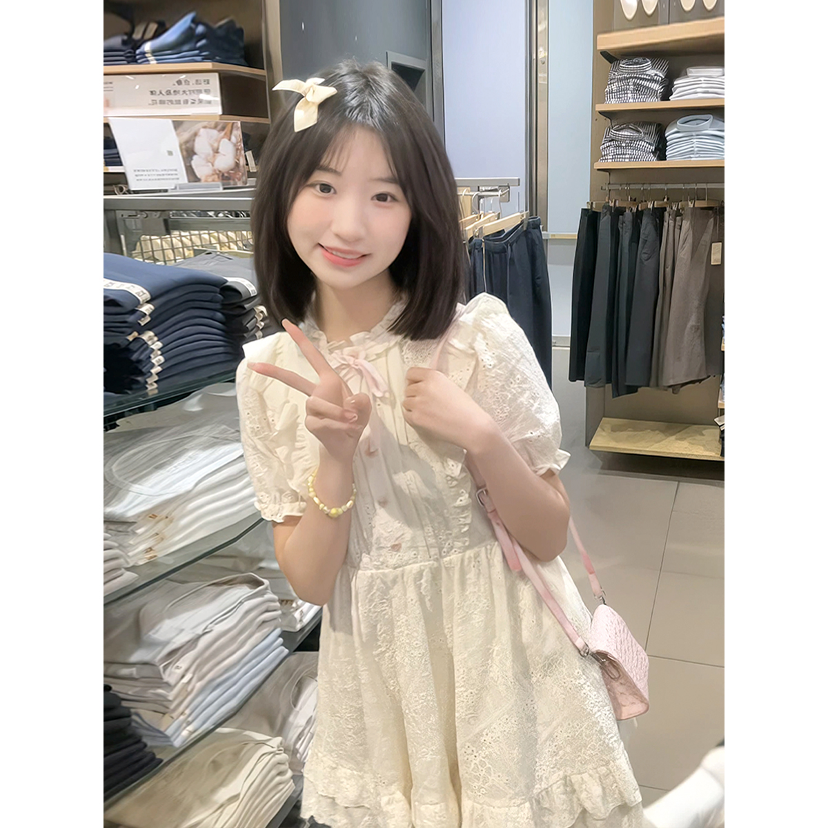 花邊領白色襯衫洋裝女夏季2023新款收腰顯瘦泡泡袖A字短裙裙子