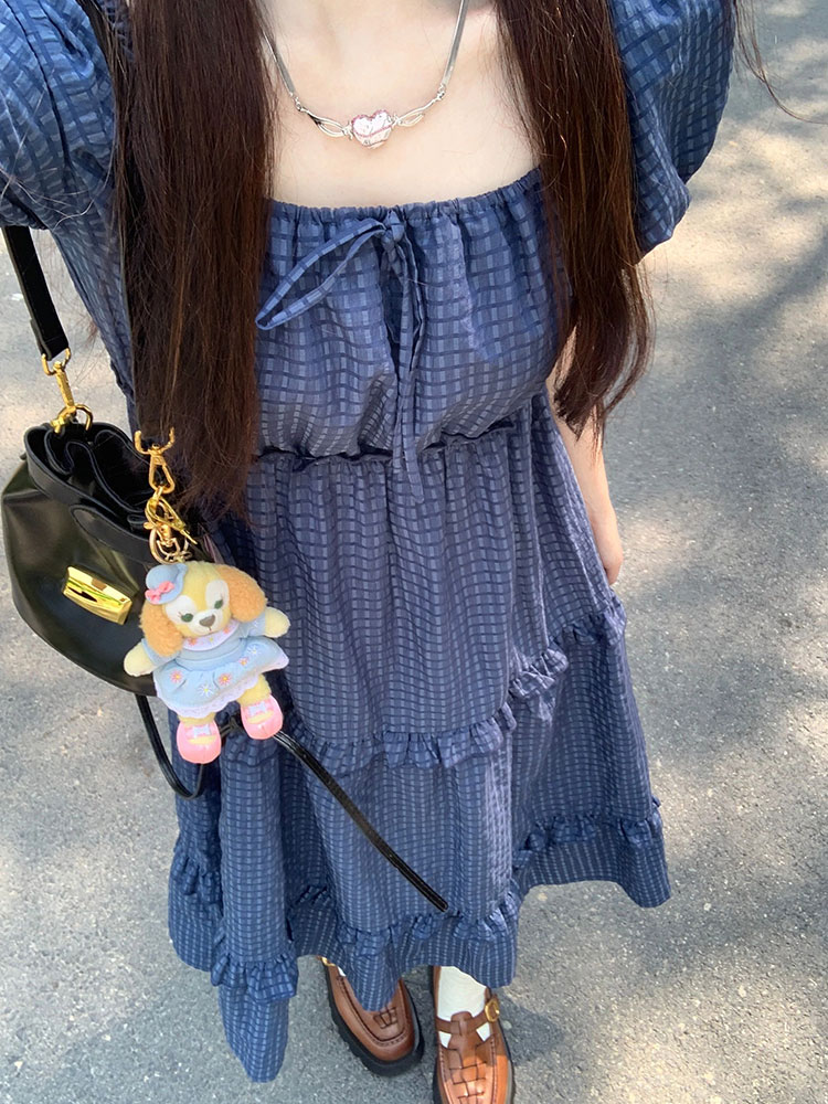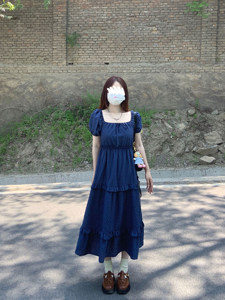 顯白韓版設計感方領泡泡袖洋裝女休閒寬鬆通勤顯瘦短袖a字長裙