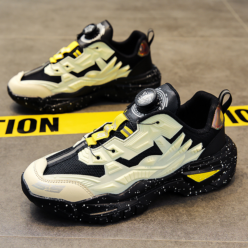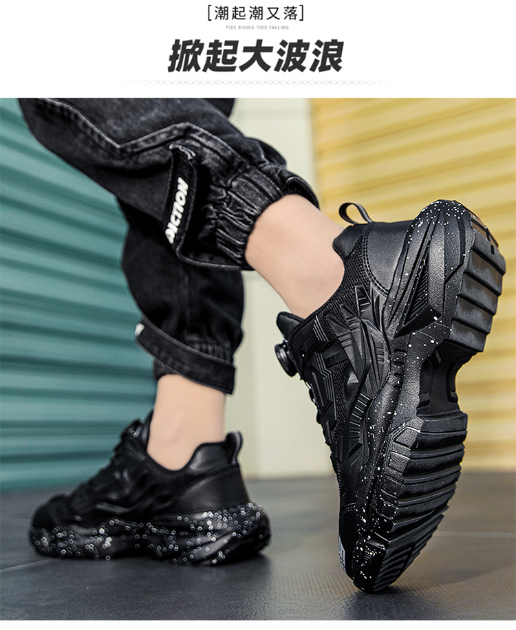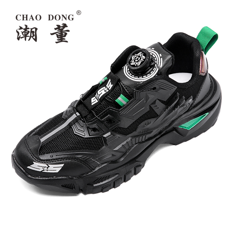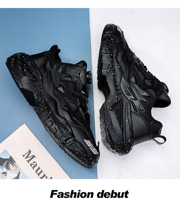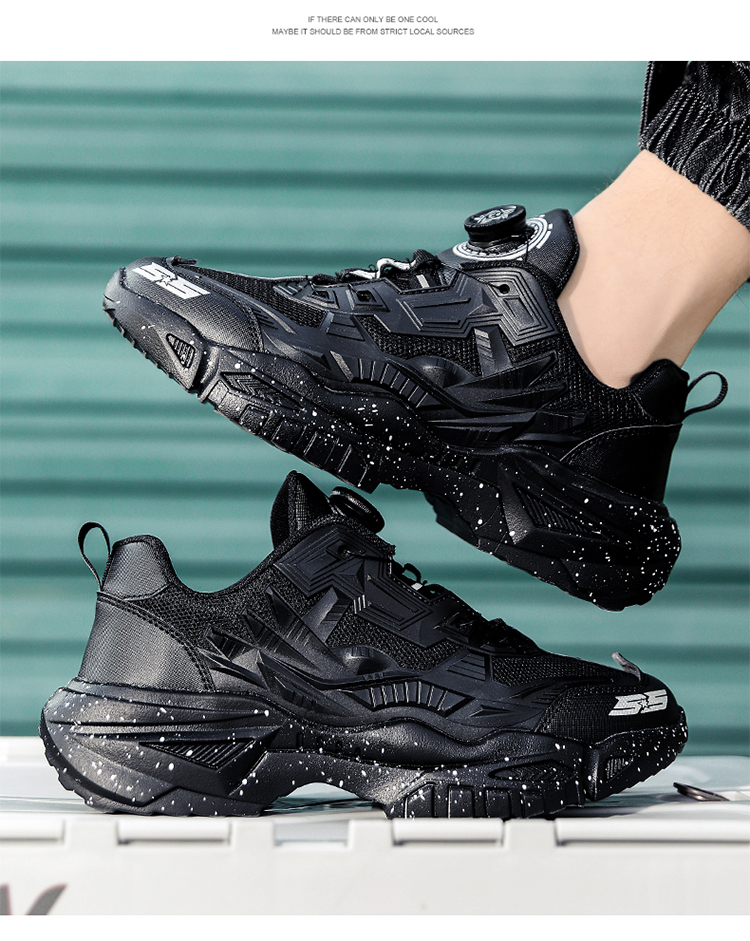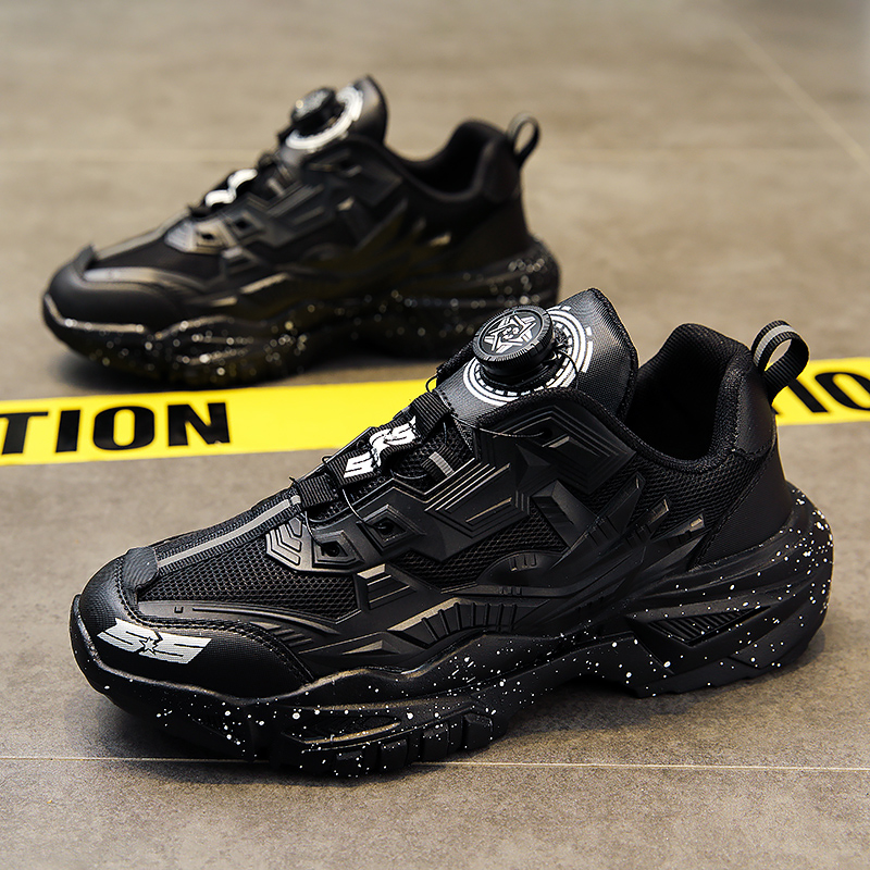 黑色男鞋秋季透氣網面休閒運動鞋旋轉鈕釦機甲免繫帶增高老爹潮鞋