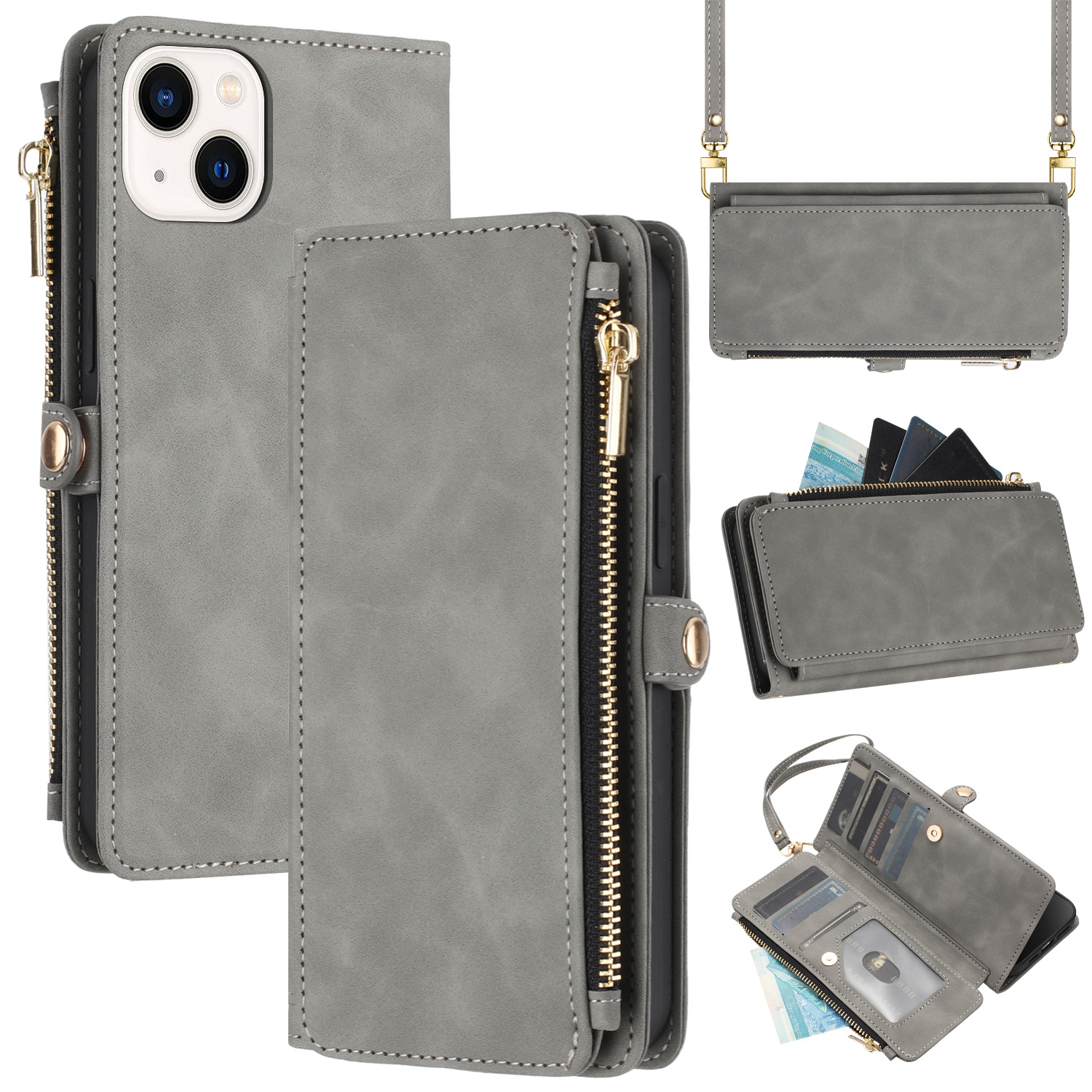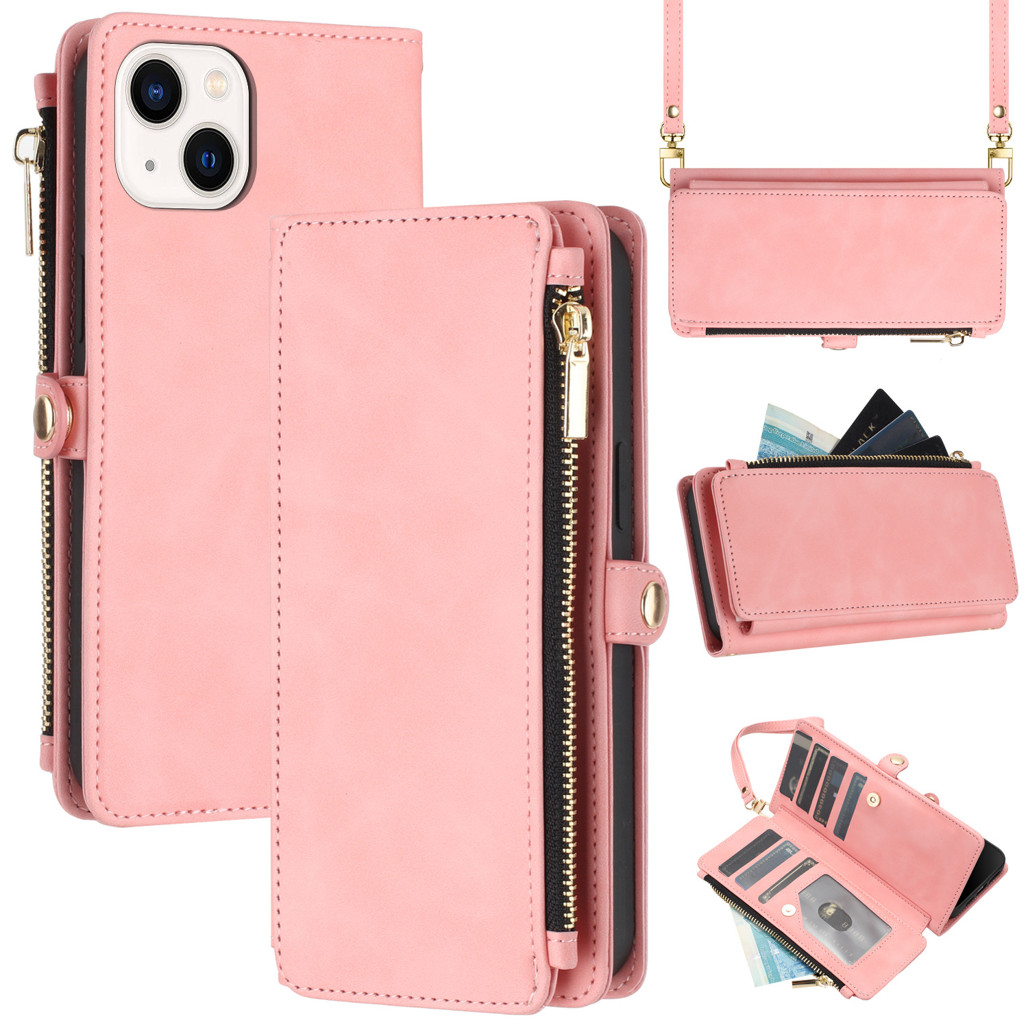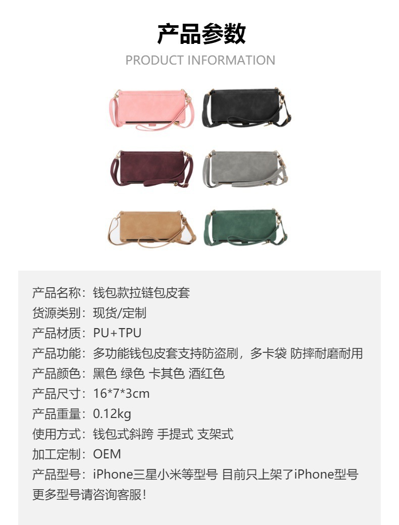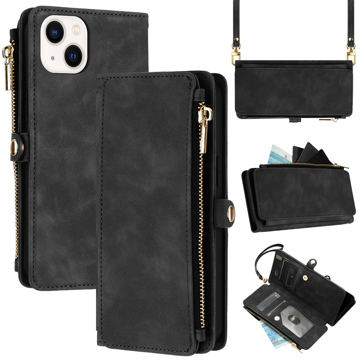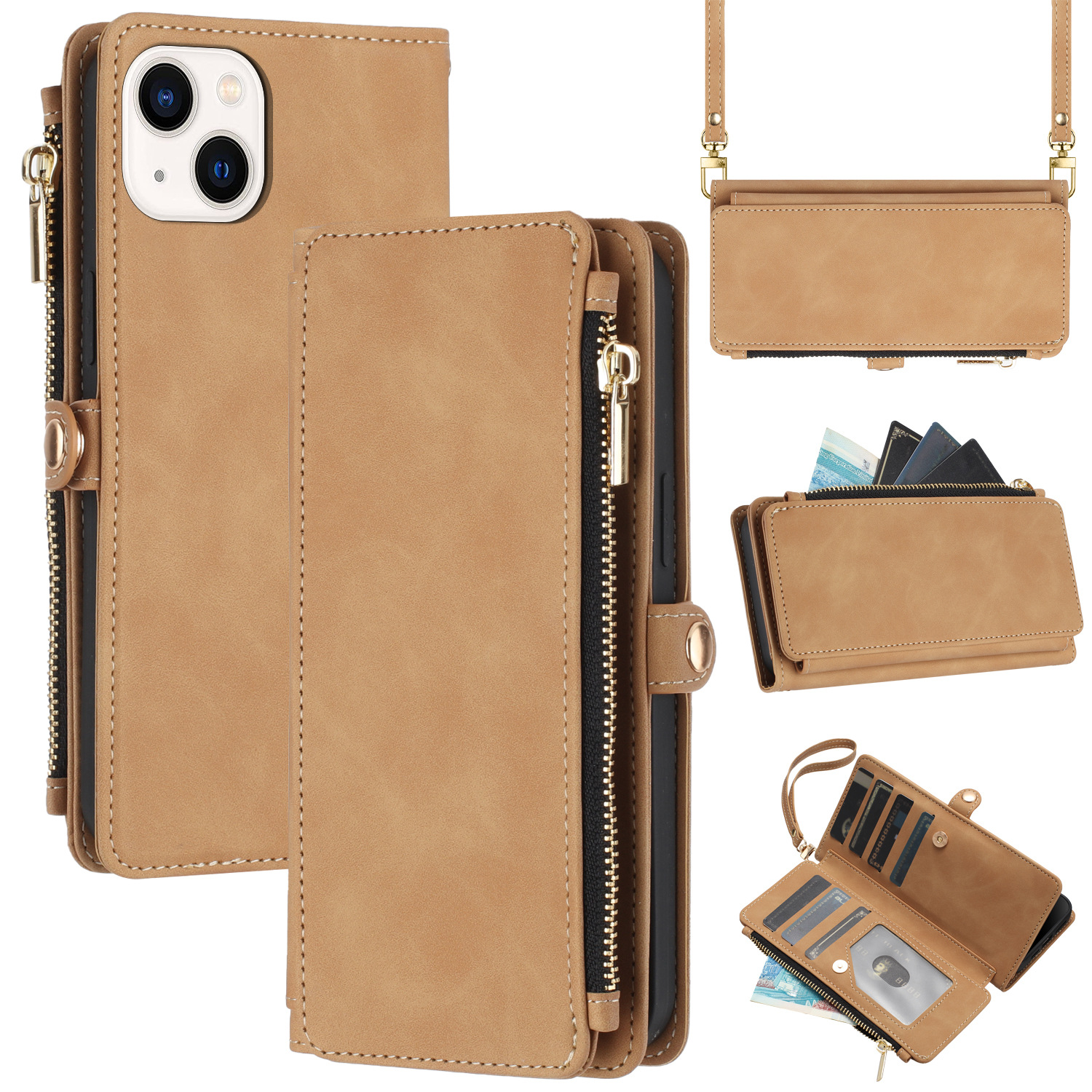 适用iPhone15Pro钱包手机壳批发苹果14Pro斜跨拉链包皮套case跨境