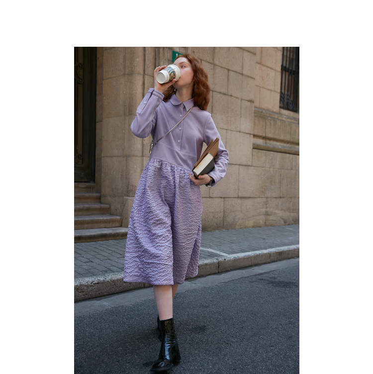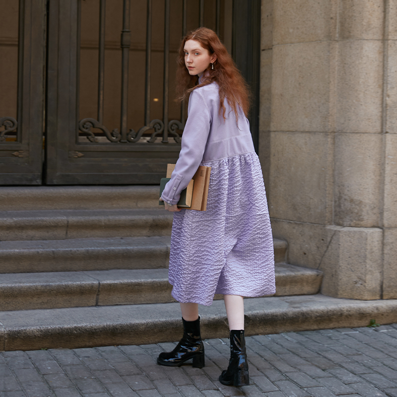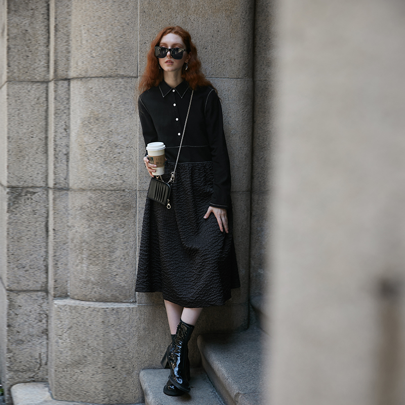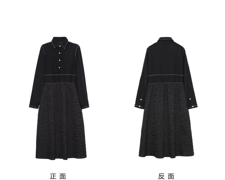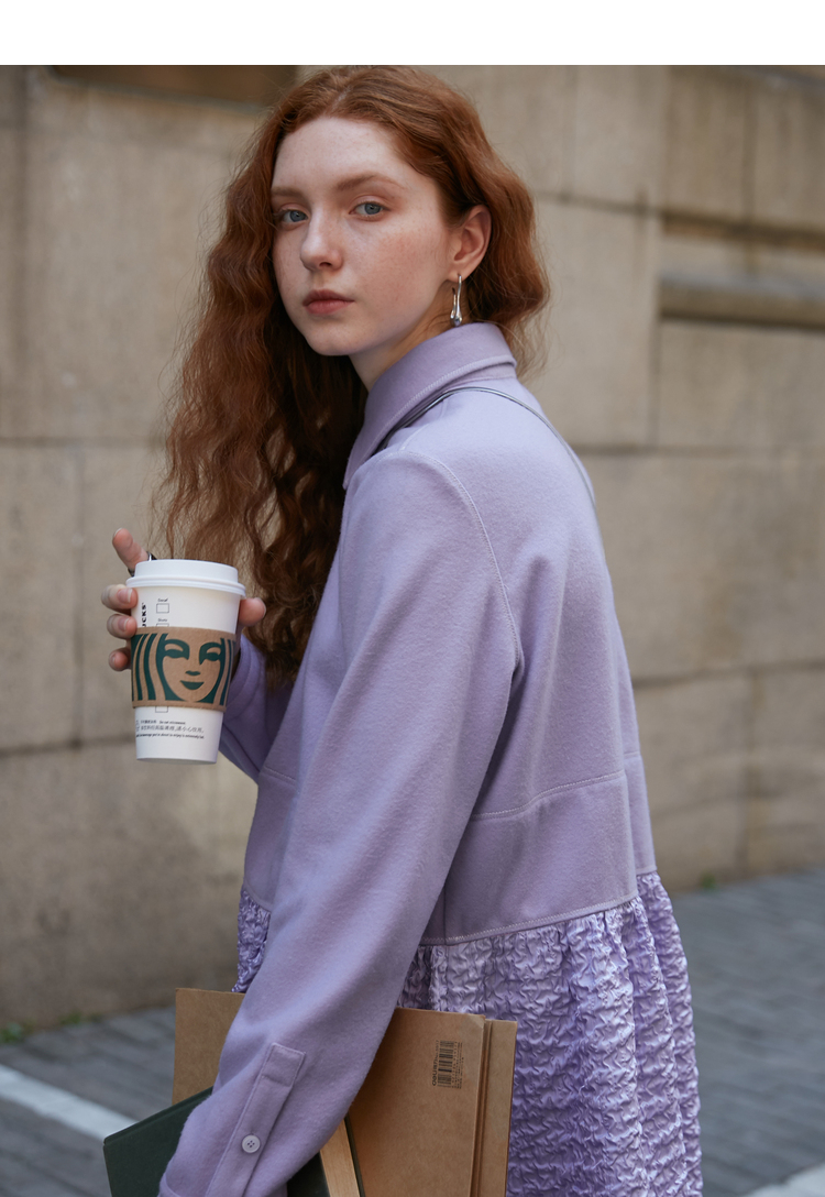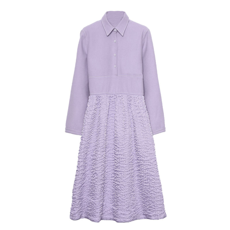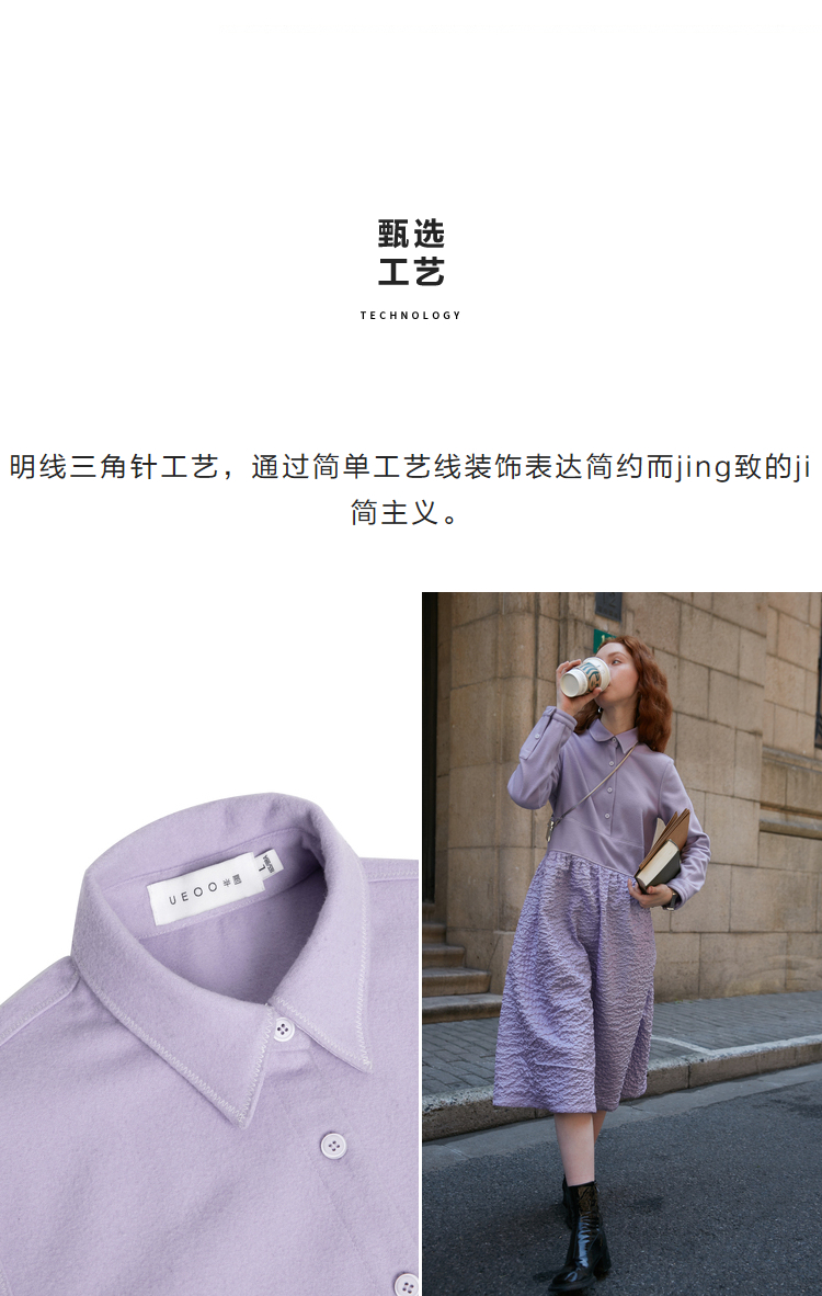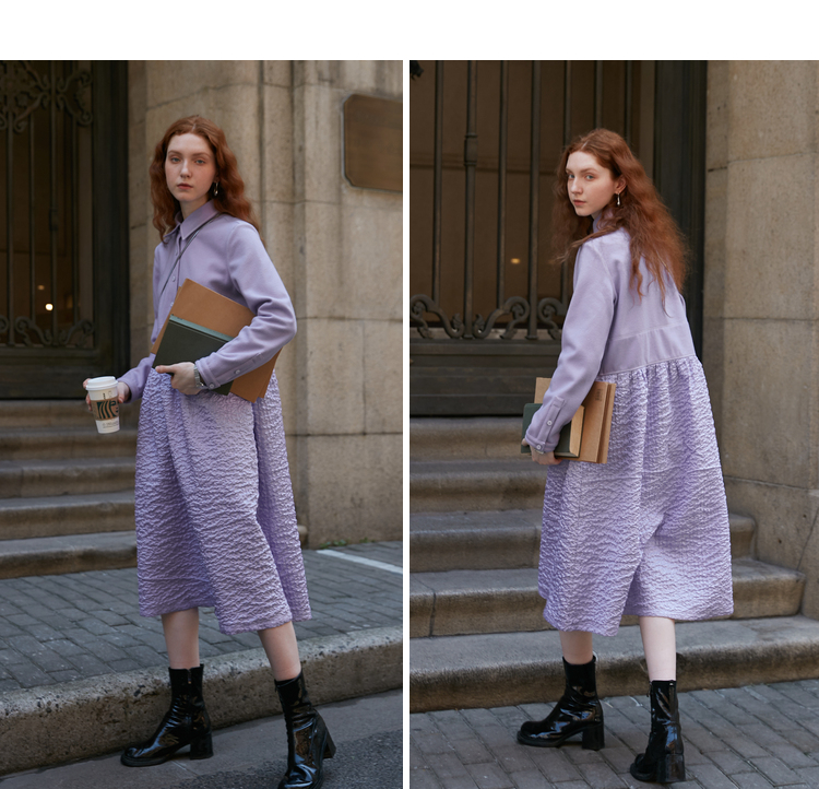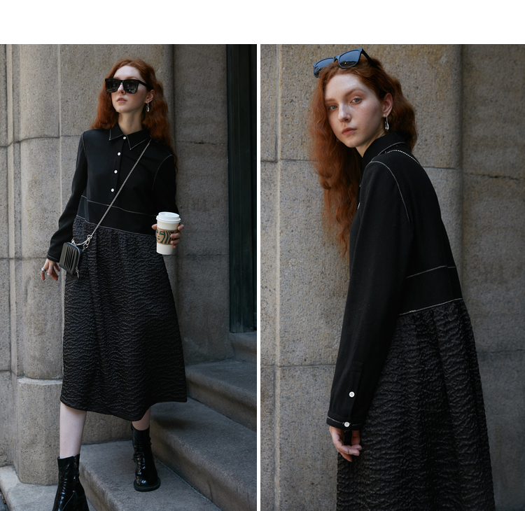 半圓原創設計師女裝2023春秋季新款羊毛呢拼接中長寬鬆襯衫式洋裝
