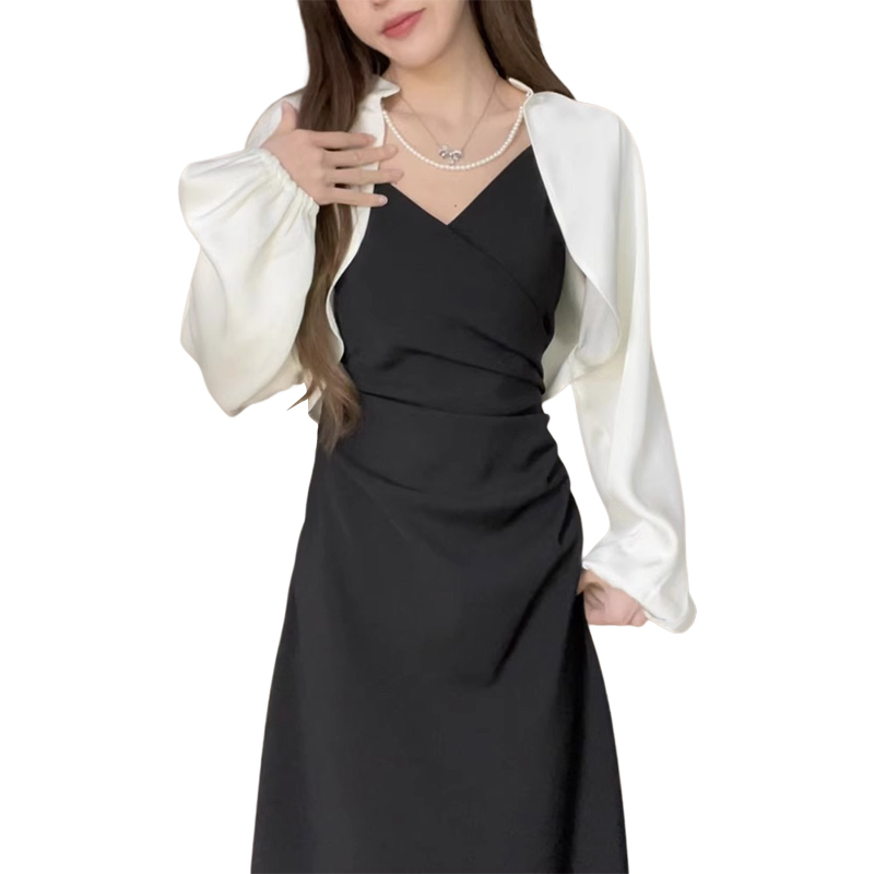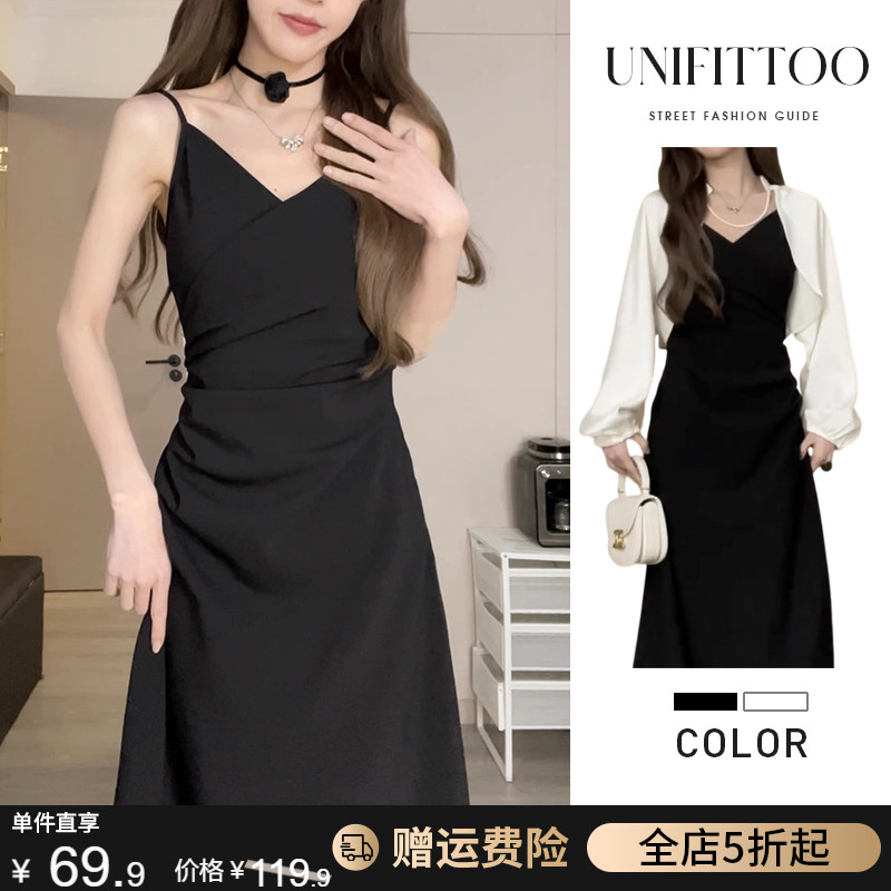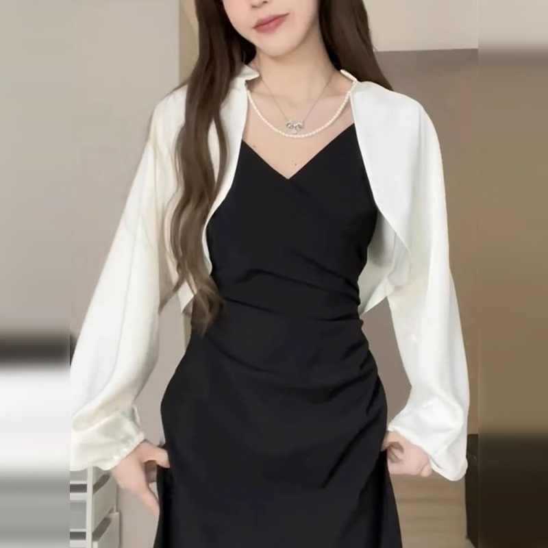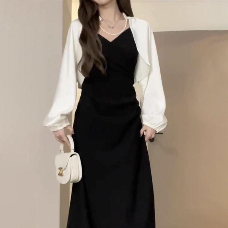 顏色分類 黑色洋裝【單件】【小個子吊帶洋裝/吊帶洋裝質感高級/外穿吊帶洋裝/垂感吊帶洋裝/宴會洋裝/過膝/端莊大氣】 白色開衫+黑色洋裝【套裝】【法式浪漫洋裝/新款洋裝高級感/小個子時尚/辣妹/休閒洋裝/氣質洋裝/別致絕美/通勤/甜辣/超凸顯身材】