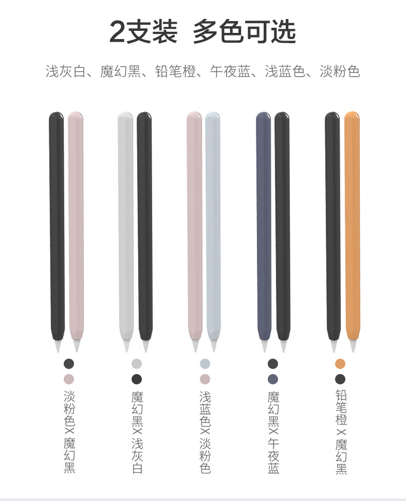 颜色 苹果笔套(2个装 黑+橙),苹果笔套(2个装 午夜蓝+黑),苹果笔套(2个装 浅蓝+午夜蓝),苹果笔套(2个装 粉+黑),苹果笔套(2个装 粉+浅蓝),苹果笔套(2个装 黑+白)