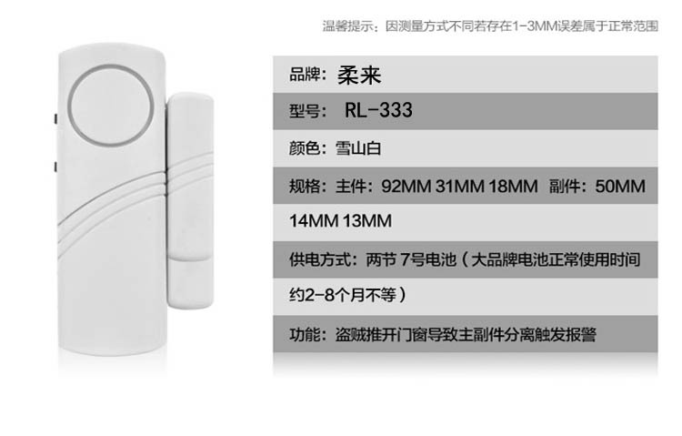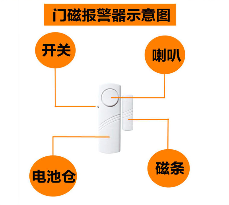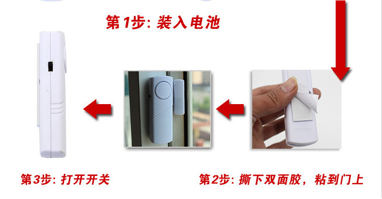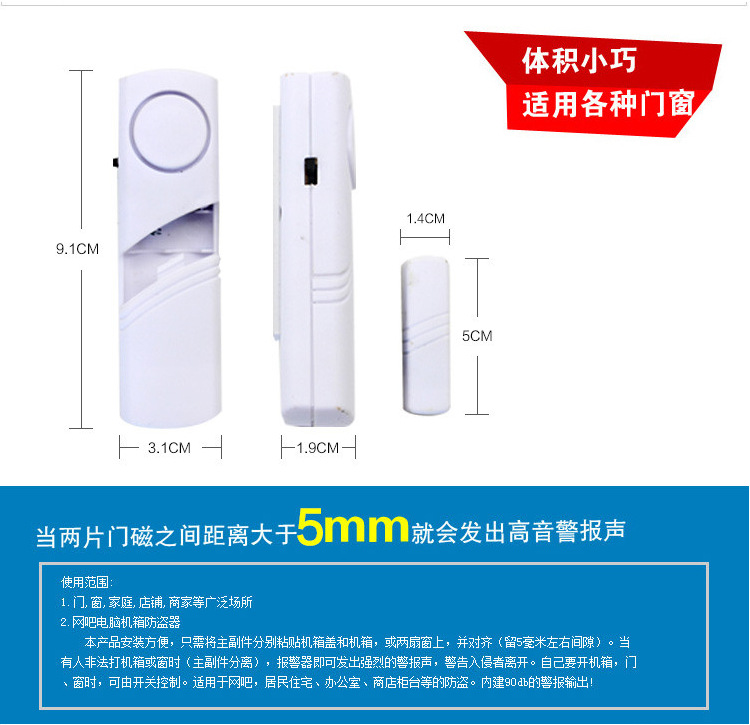 产品小巧玲珑,安装简便,提供的双面胶贴很容易地安装在门或窗上,是一种价廉物美、经济实用的技术防范措施。在我们当地,已得到了居民、商户的充分肯定。只需将主副件分别粘贴于门和门框上,或两扇窗上,并对齐(留5毫米左右间隙)。一旦小偷撬门、撬窗、企图盗窃(主副件分离),报警器即可发出强烈的警报声,吓退盗贼、提醒主人及周围的人抓贼。自己要开门、窗时,可由开关控制。适用于居民住宅、办公室、商店柜台等的防盗。
