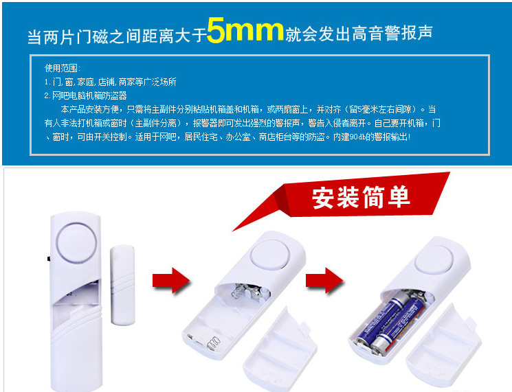 本产品安装方便,只需将主副件分别粘贴机箱盖和机箱,或两扇窗上,并对齐(留5毫米左右间隙)。当有人非法打机箱或窗时(主副件分离),报警器即可发出强烈的警报声,警告入侵者离开。自己要开机箱,门、窗时,可由开关控制。适用于网吧,居民住宅、办公室、商店柜台等的防盗。内建90db的警报输出,使用2×1.5V 7号电池(不包括在机内)