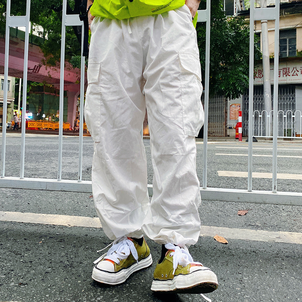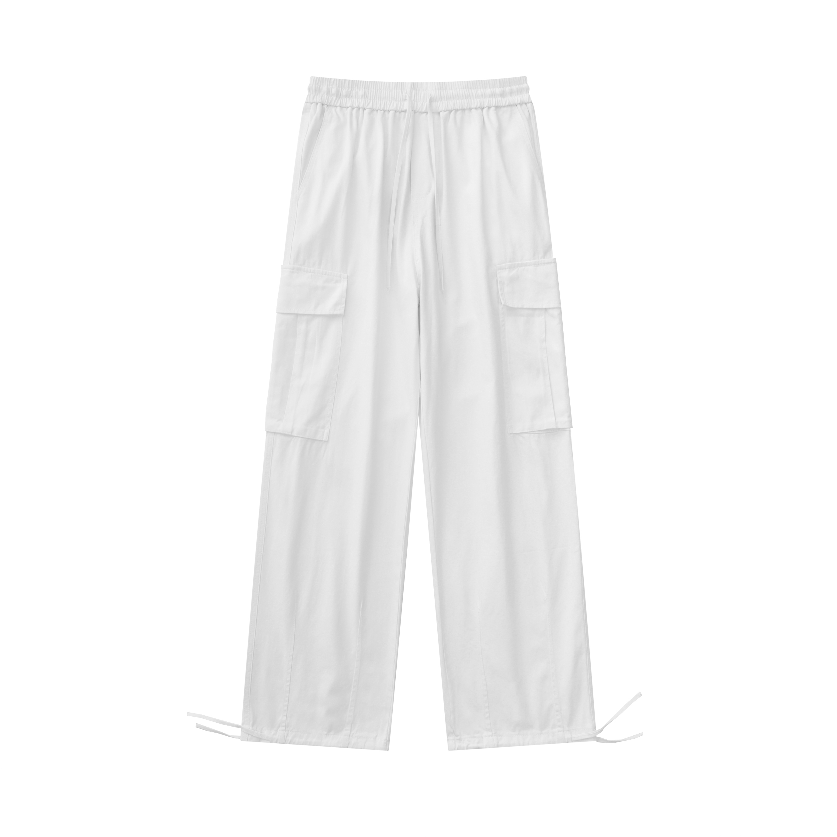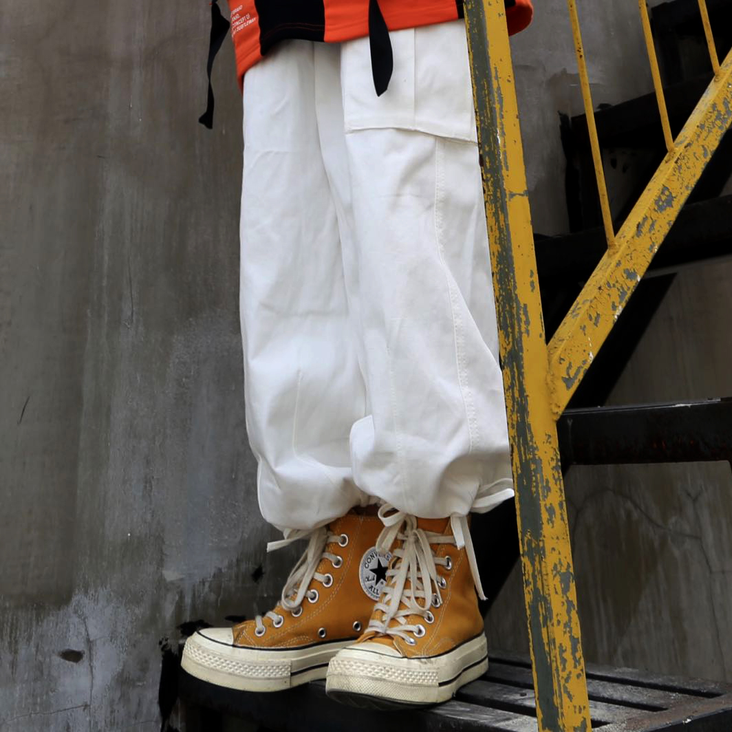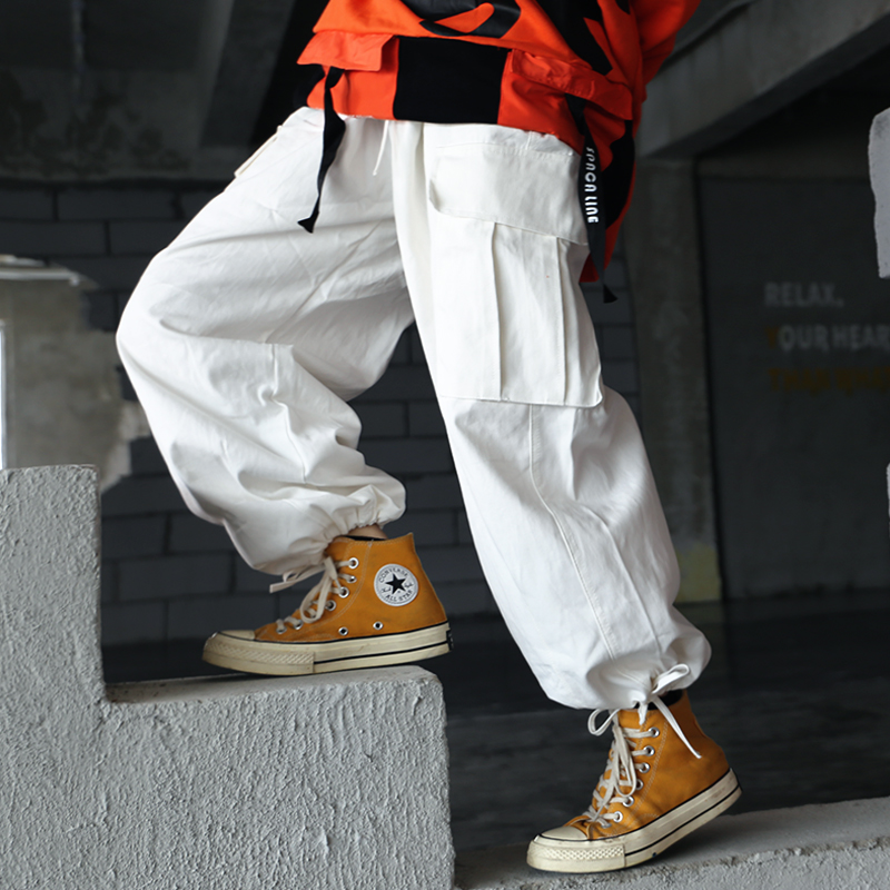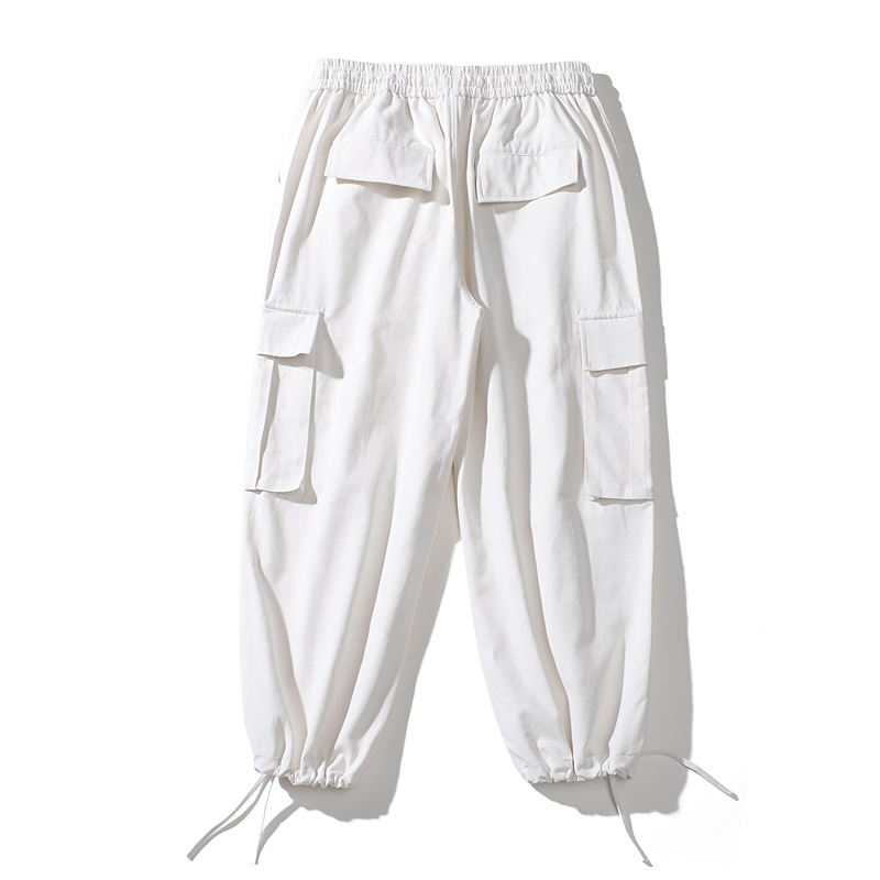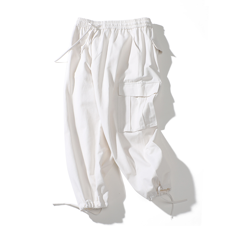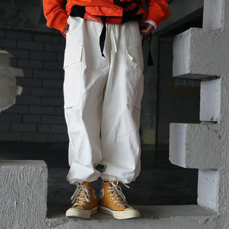 ins白色嘻哈寬鬆遮肉百搭直筒闊腿口袋抽繩可束腳工裝褲男女潮牌