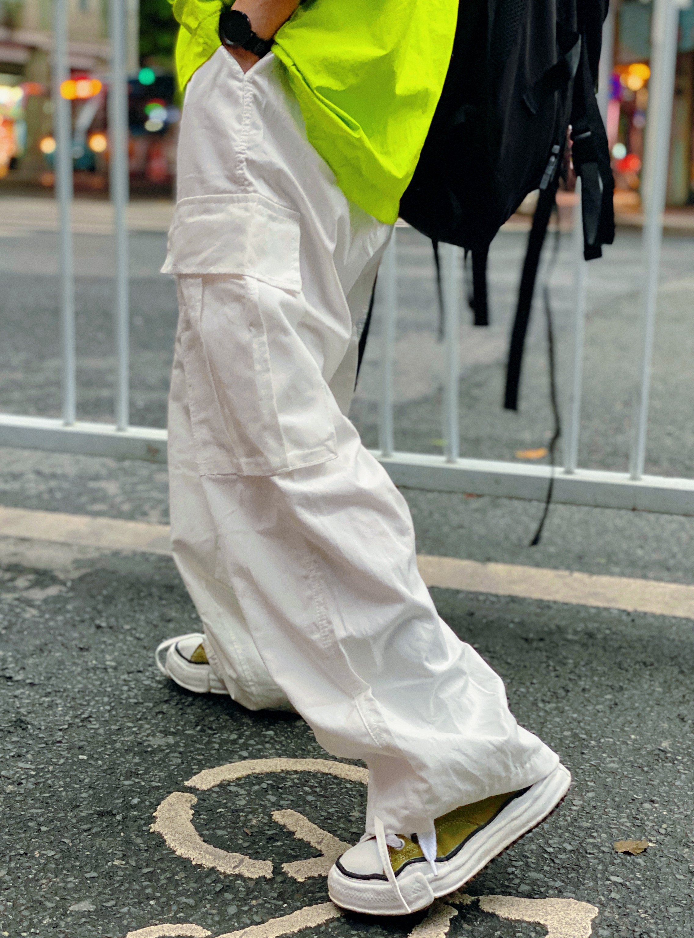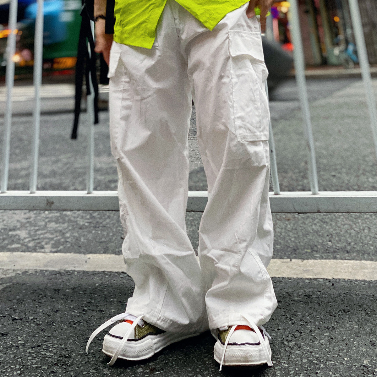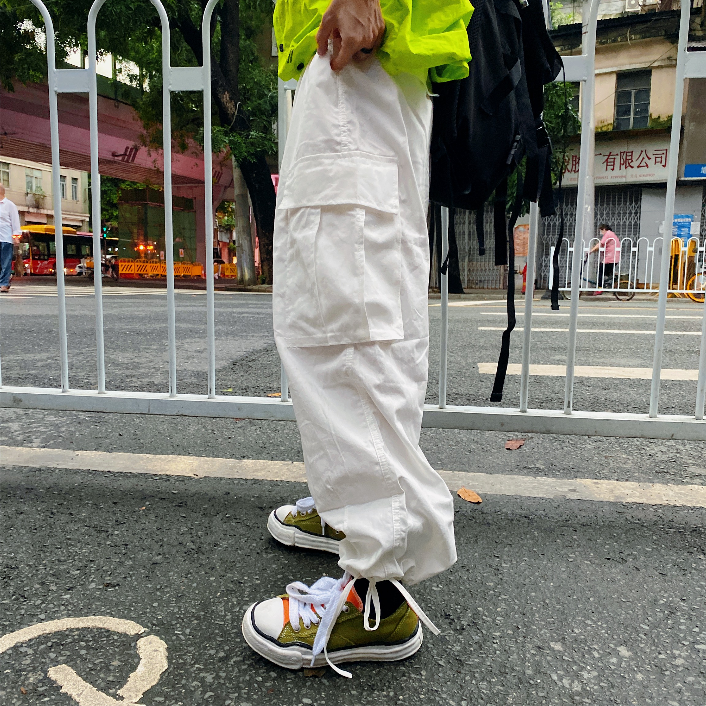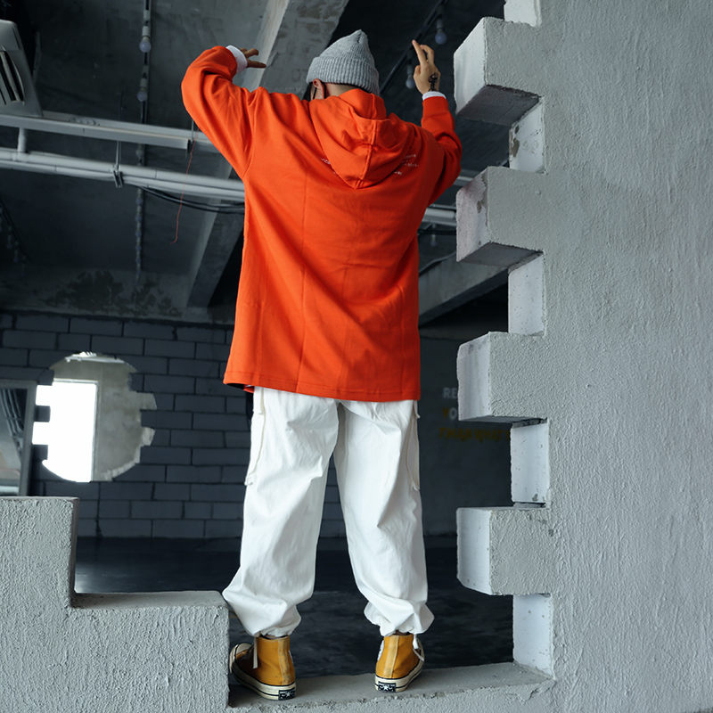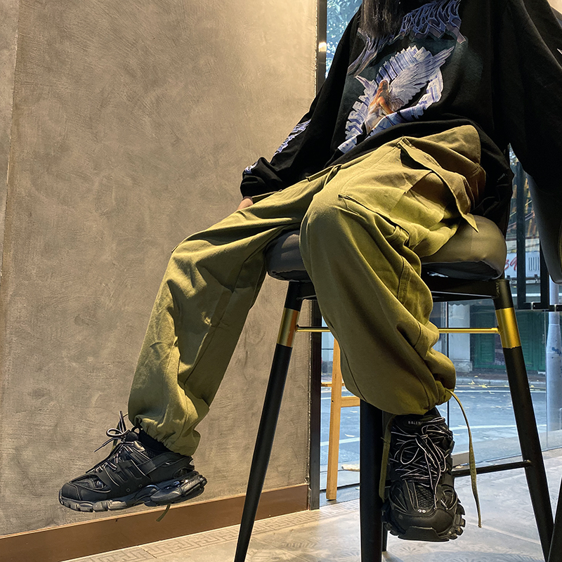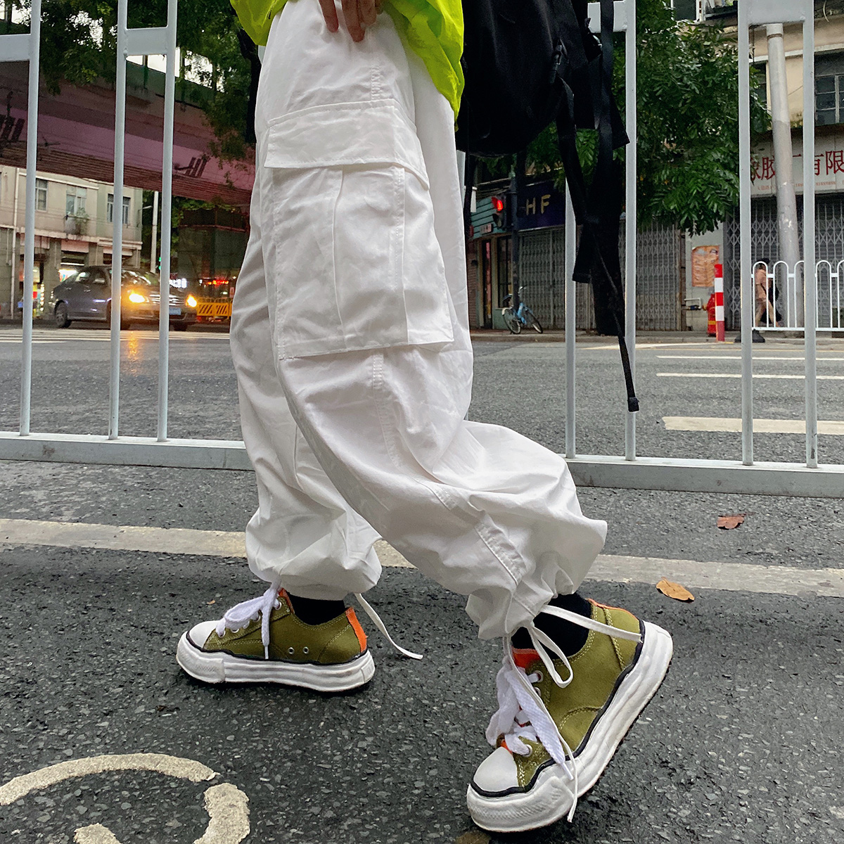 ins白色嘻哈寬鬆遮肉百搭直筒闊腿口袋抽繩可束腳工裝褲男女潮牌