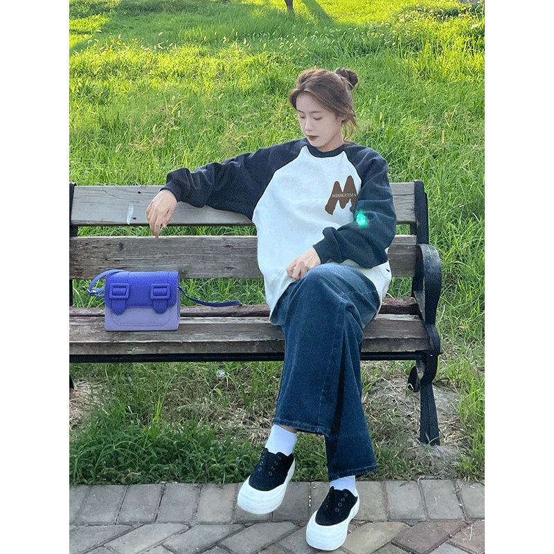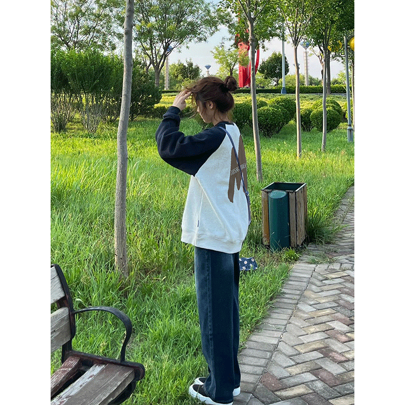 春秋薄款圓領無帽插肩袖衛衣女美式復古重磅國潮牌正肩撞色上衣服
