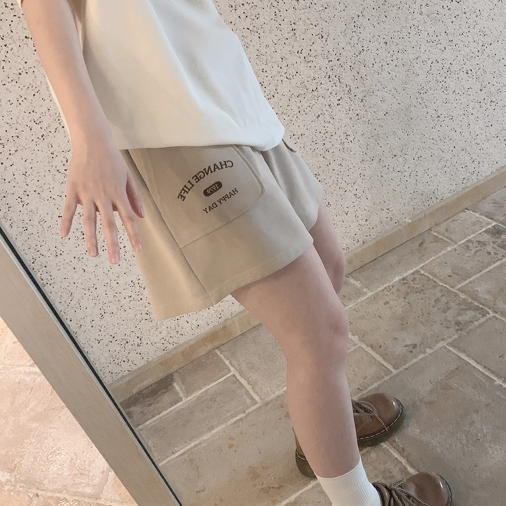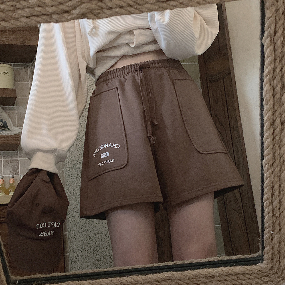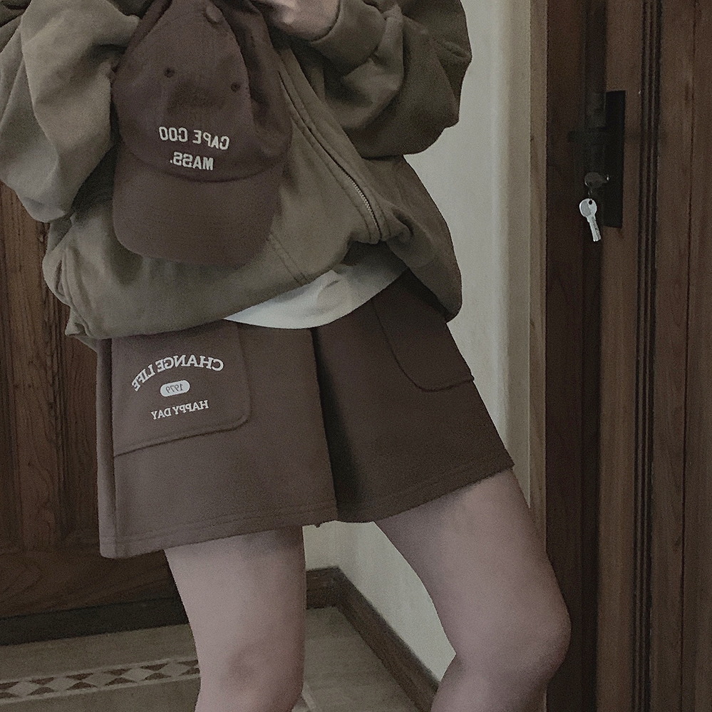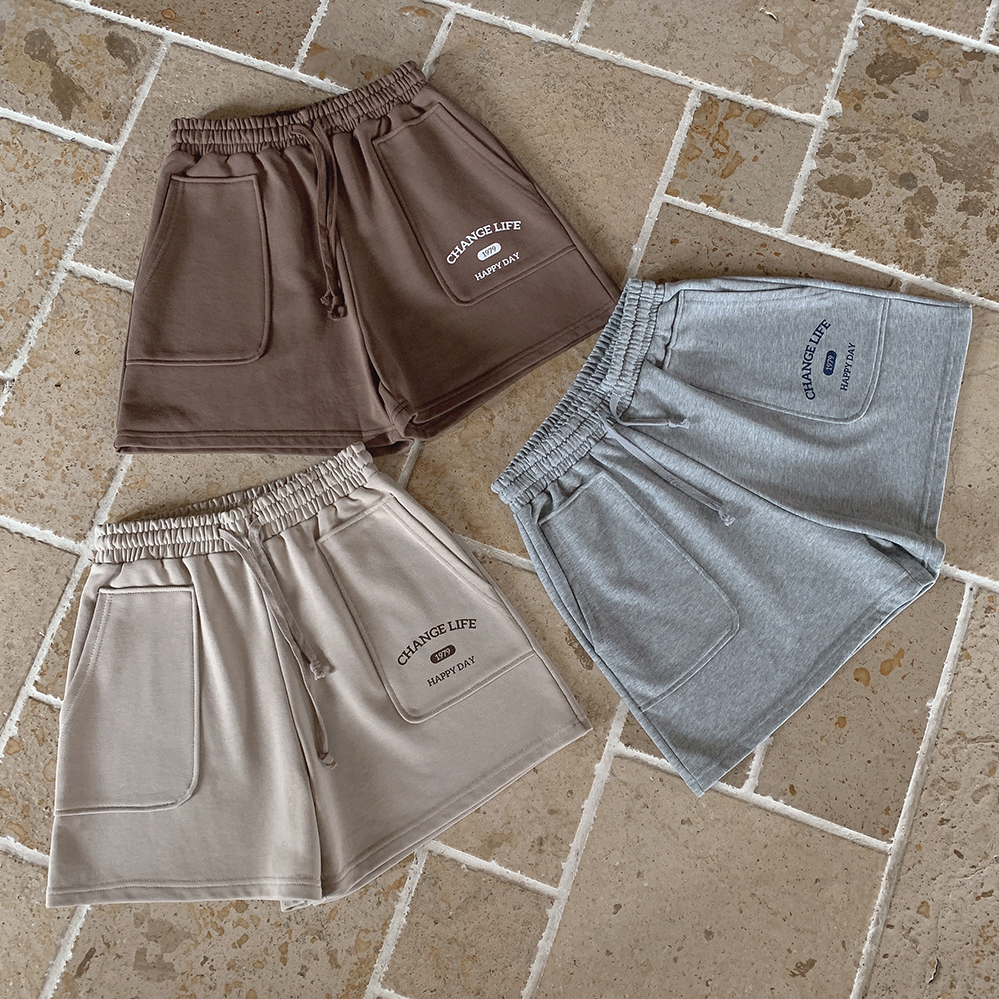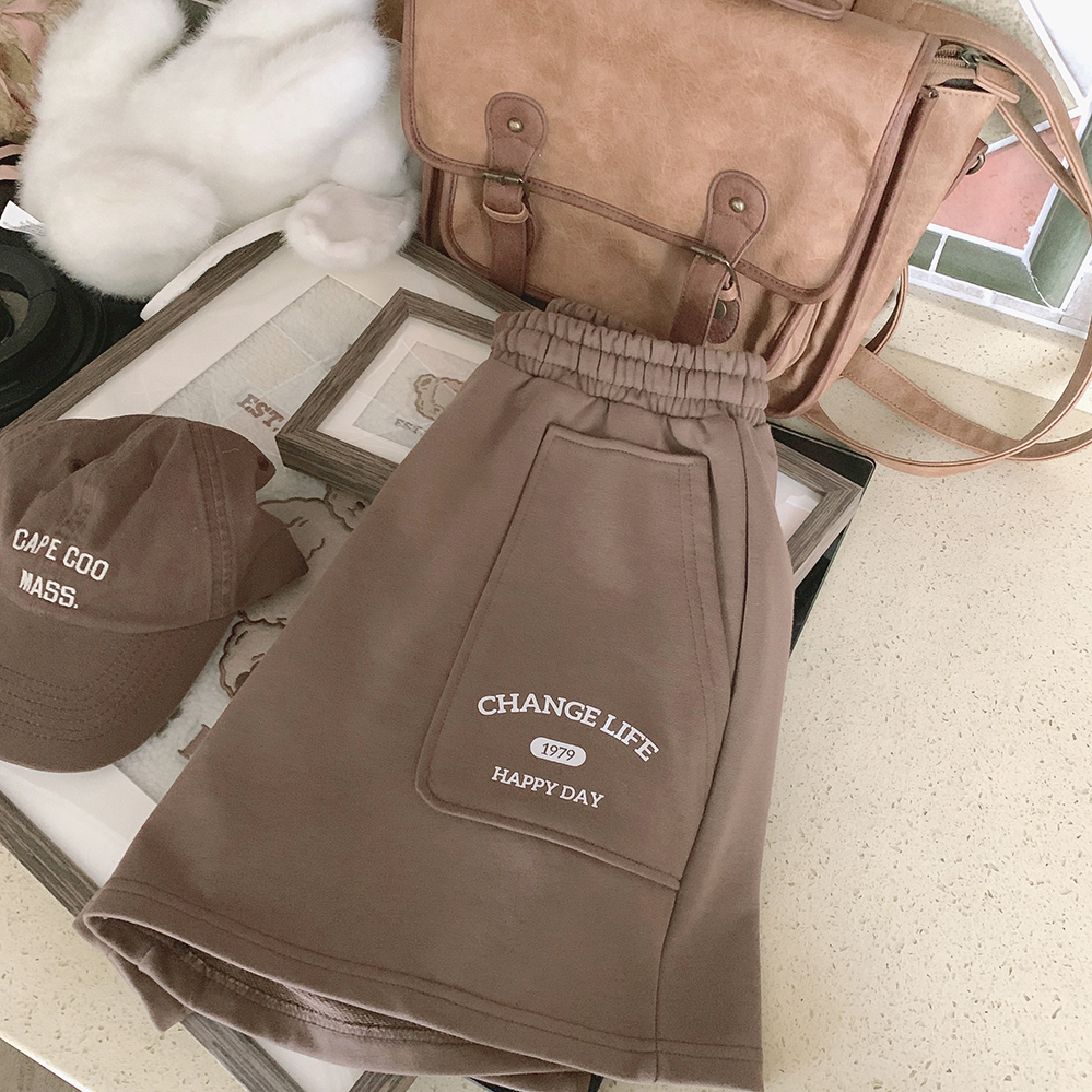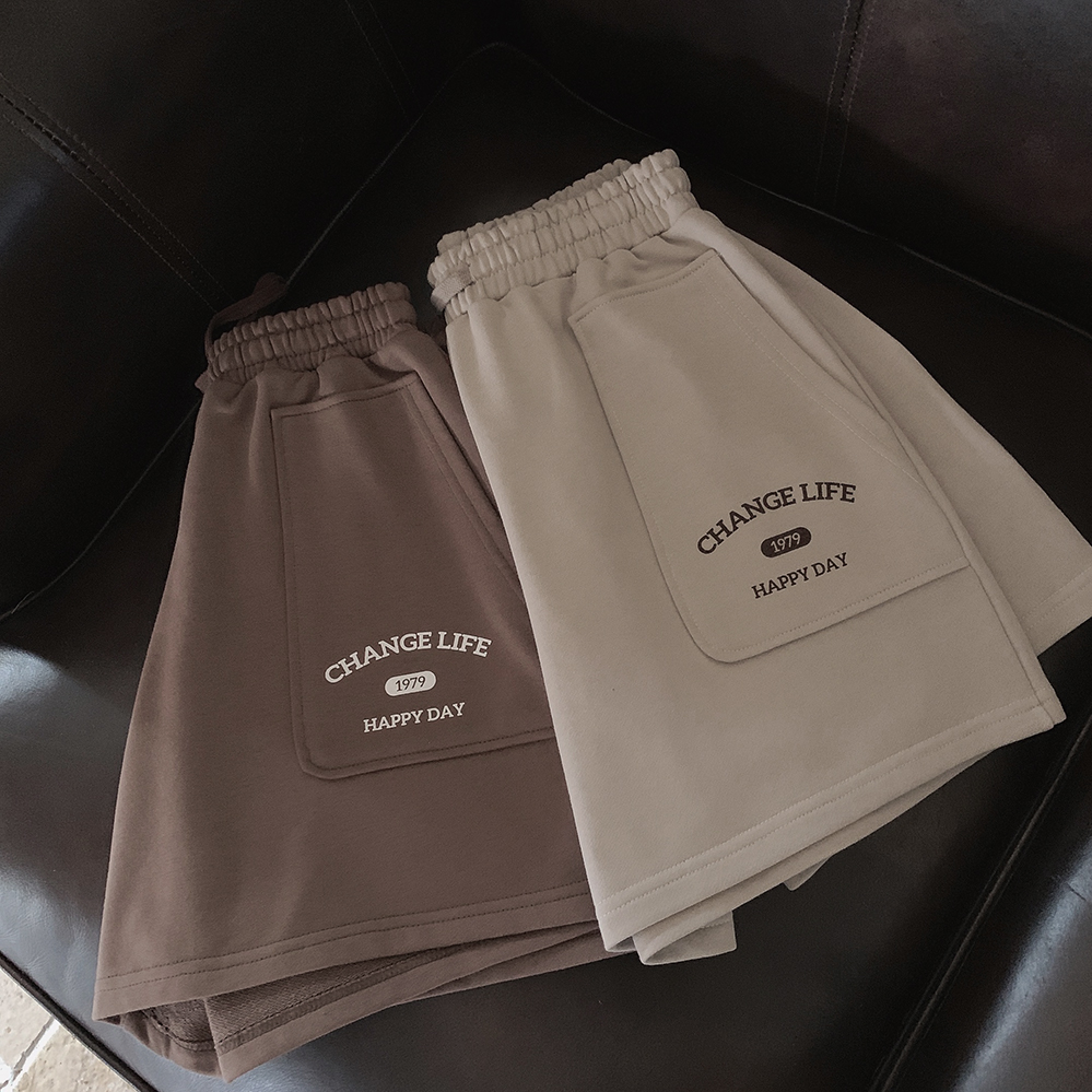 復古字母印花 麻灰色咖色 鬆緊腰 運動少女 闊腿毛圈短褲 W