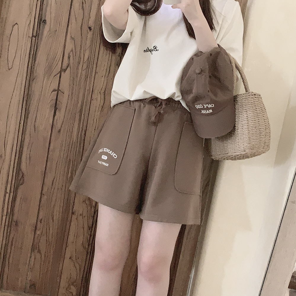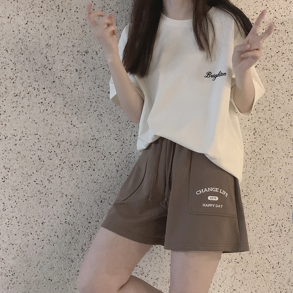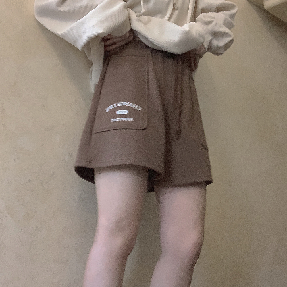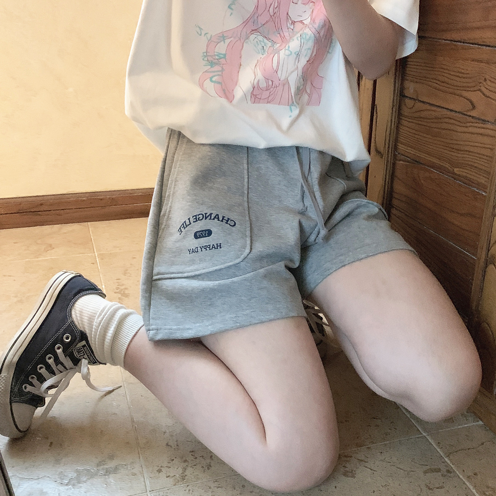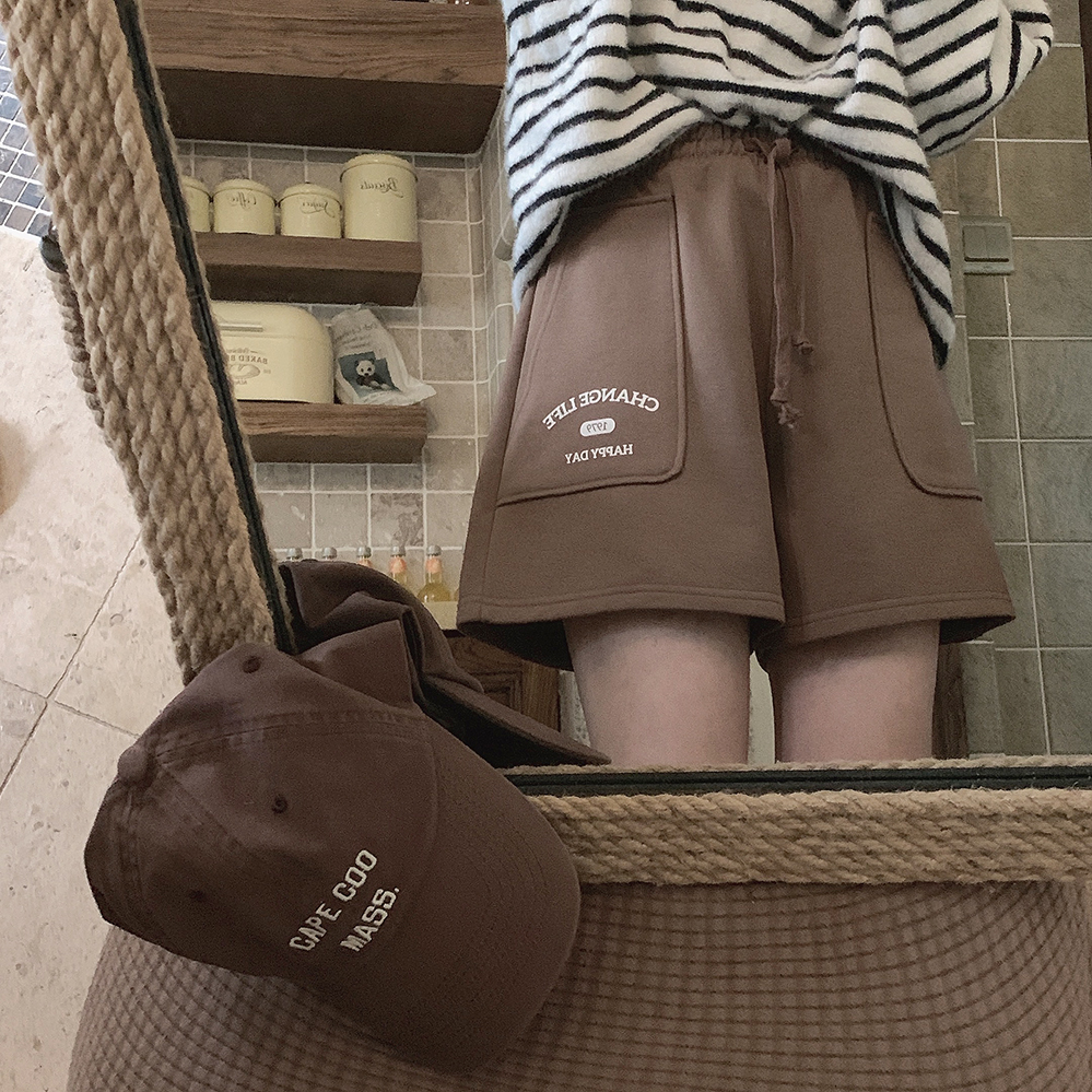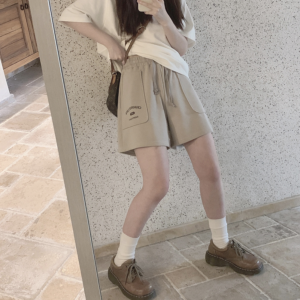 復古字母印花 麻灰色咖色 鬆緊腰 運動少女 闊腿毛圈短褲 W