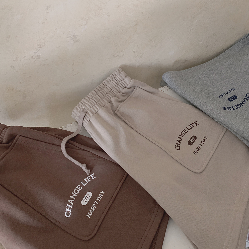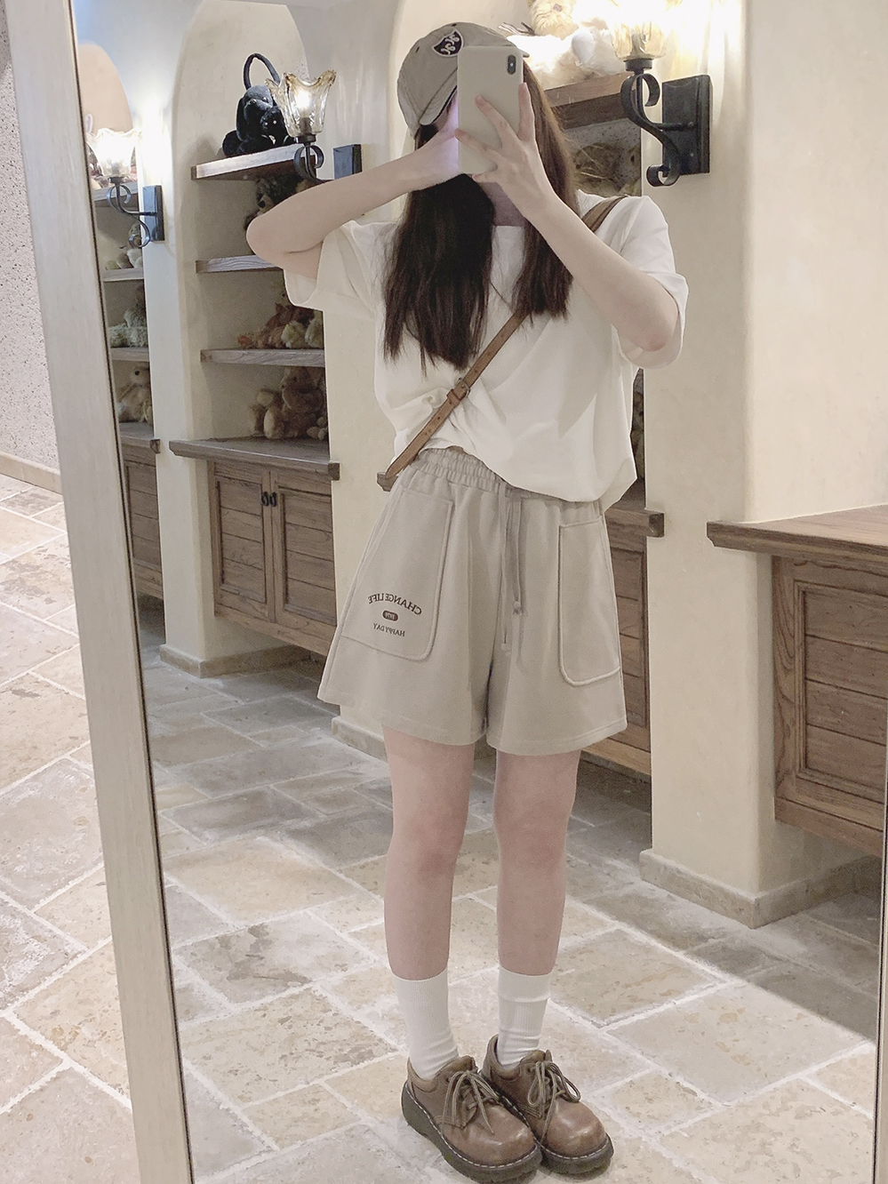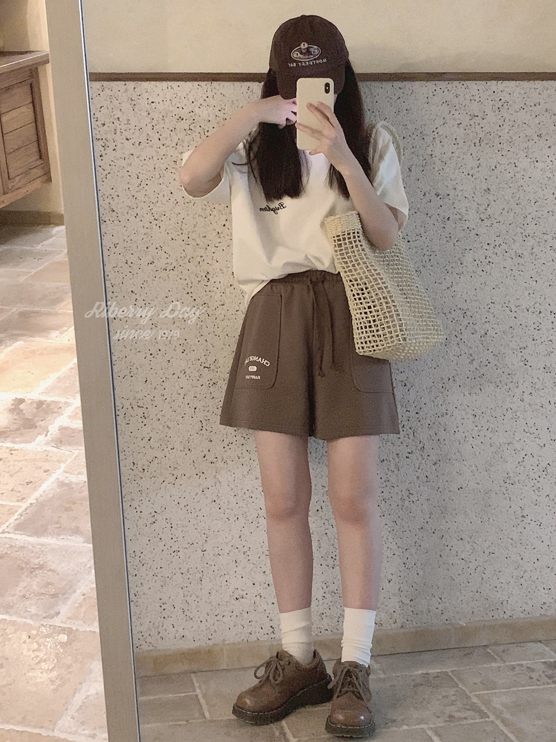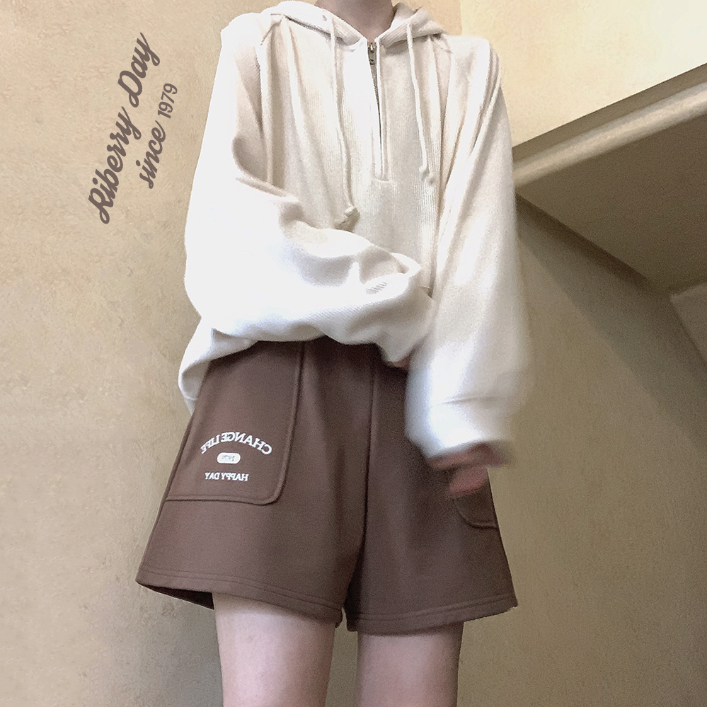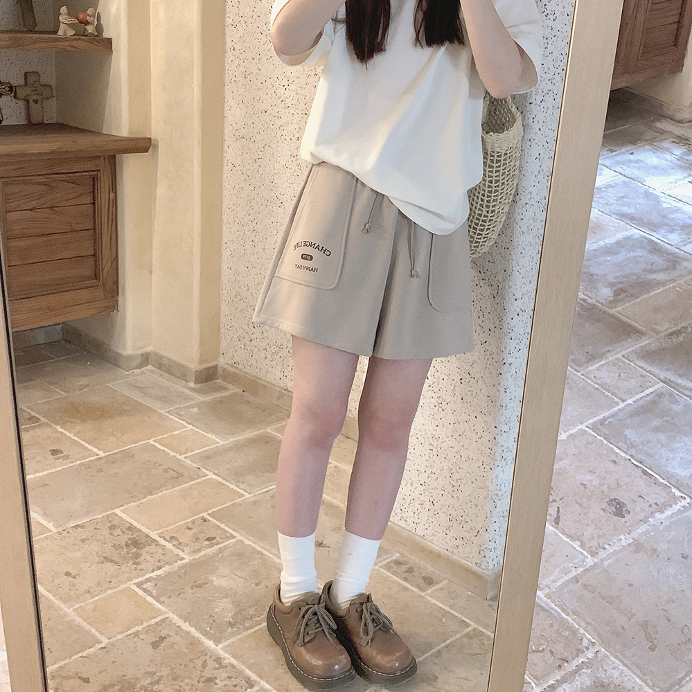 復古字母印花 麻灰色咖色 鬆緊腰 運動少女 闊腿毛圈短褲 W