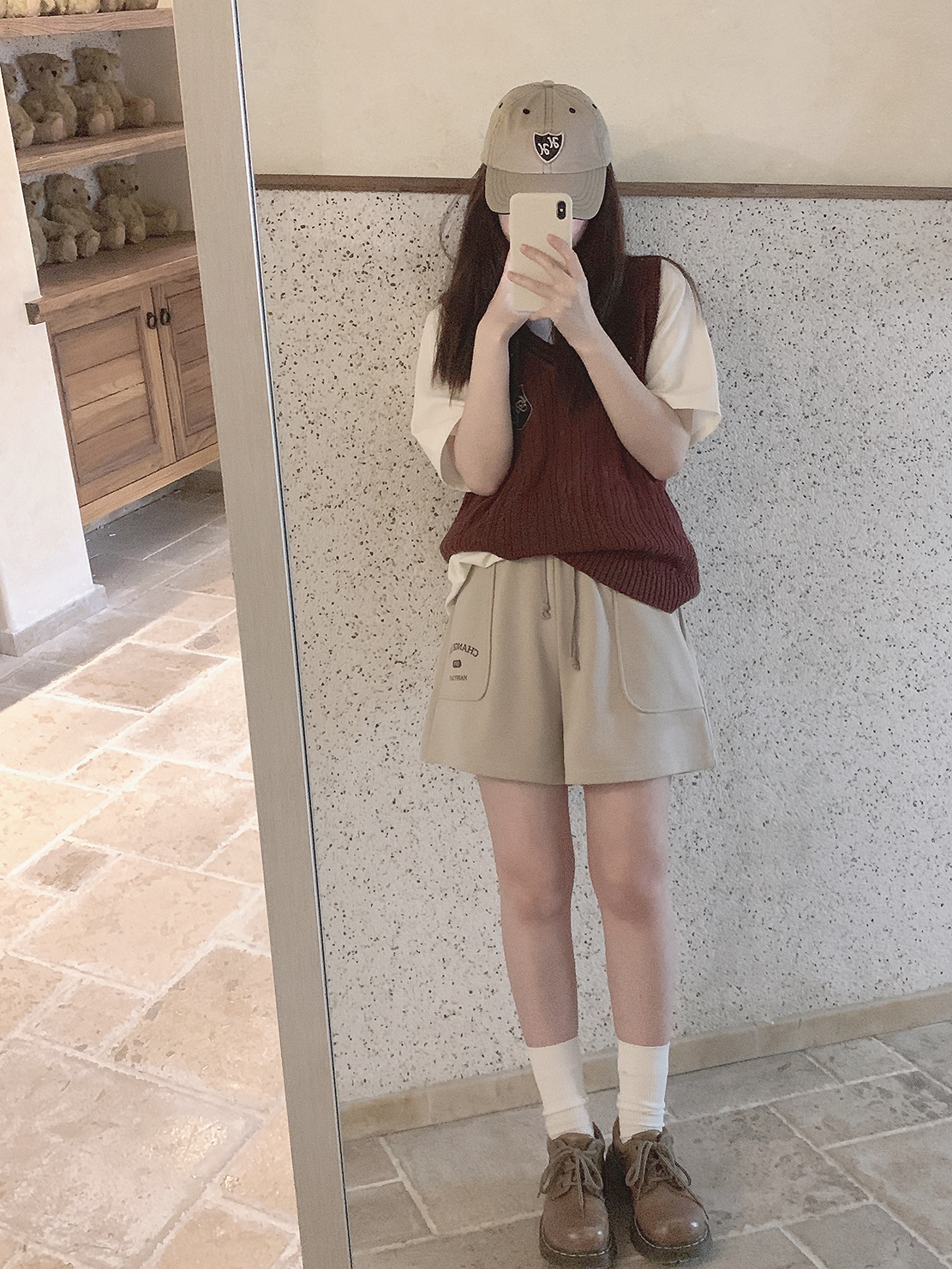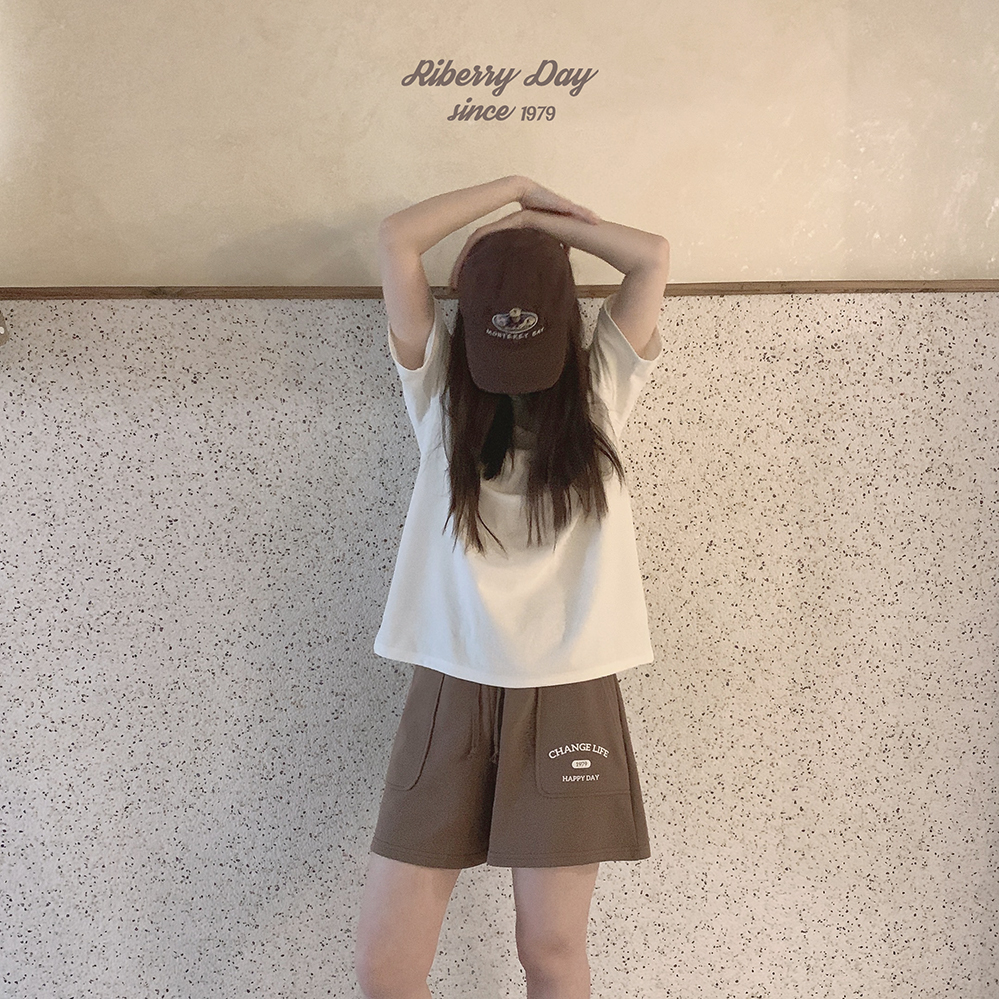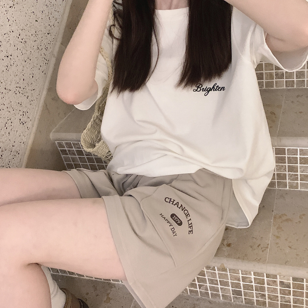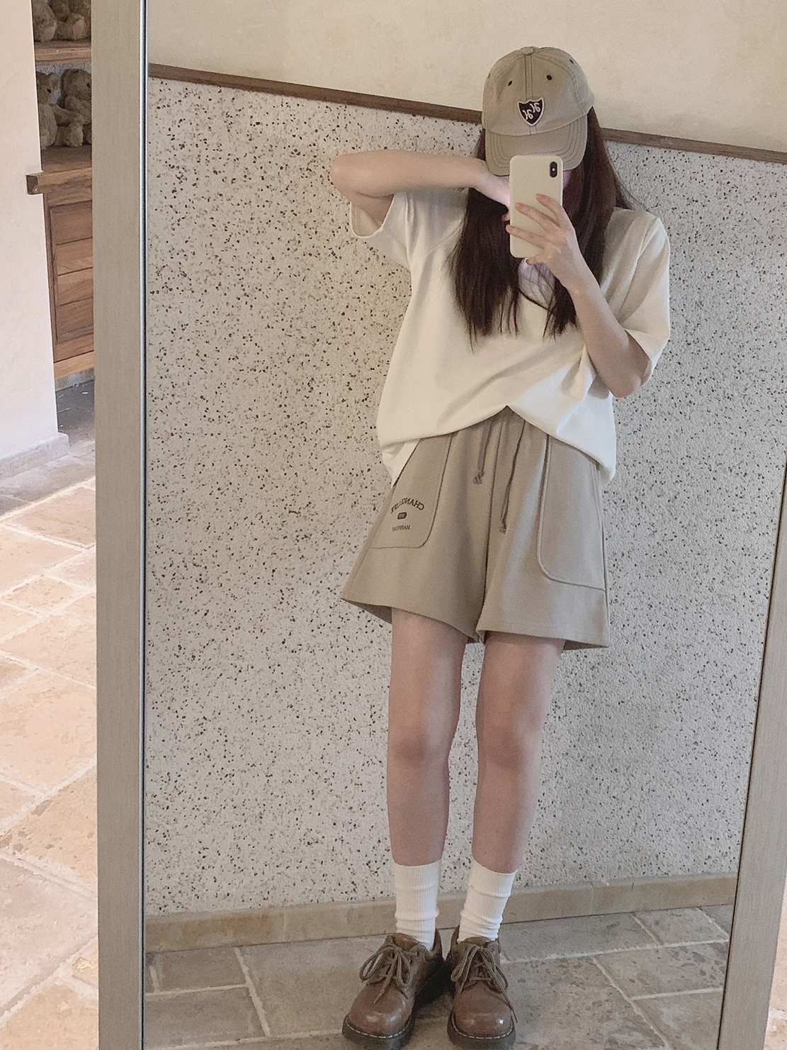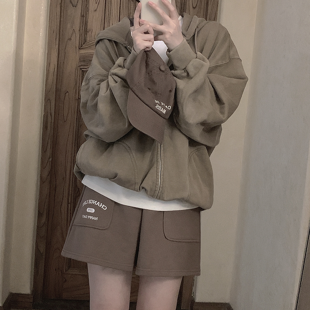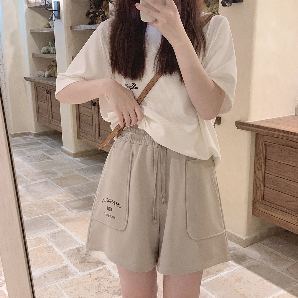 復古字母印花 麻灰色咖色 鬆緊腰 運動少女 闊腿毛圈短褲 W