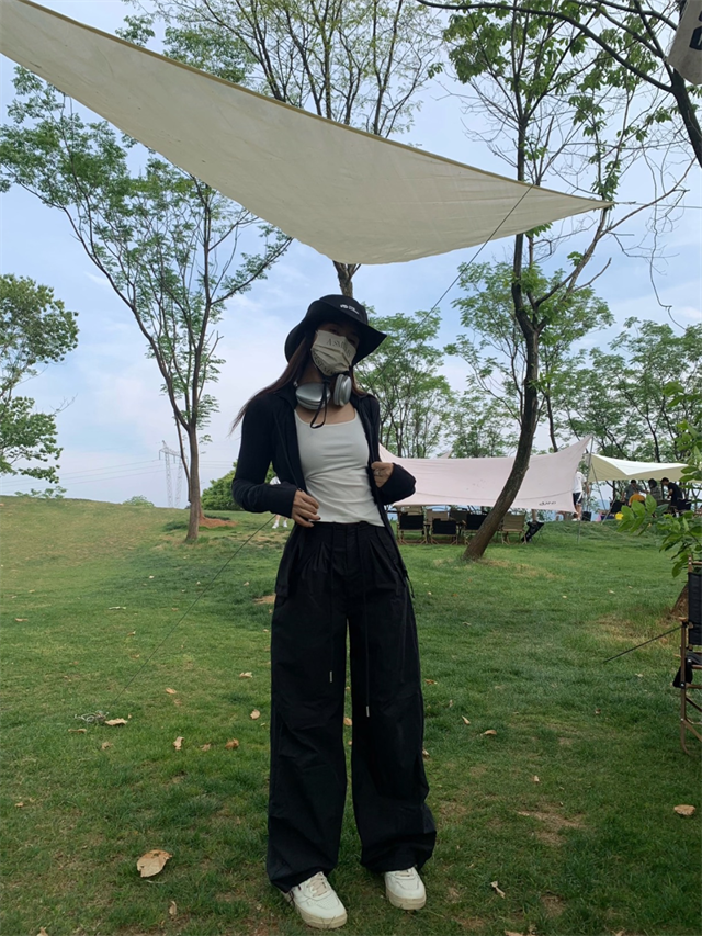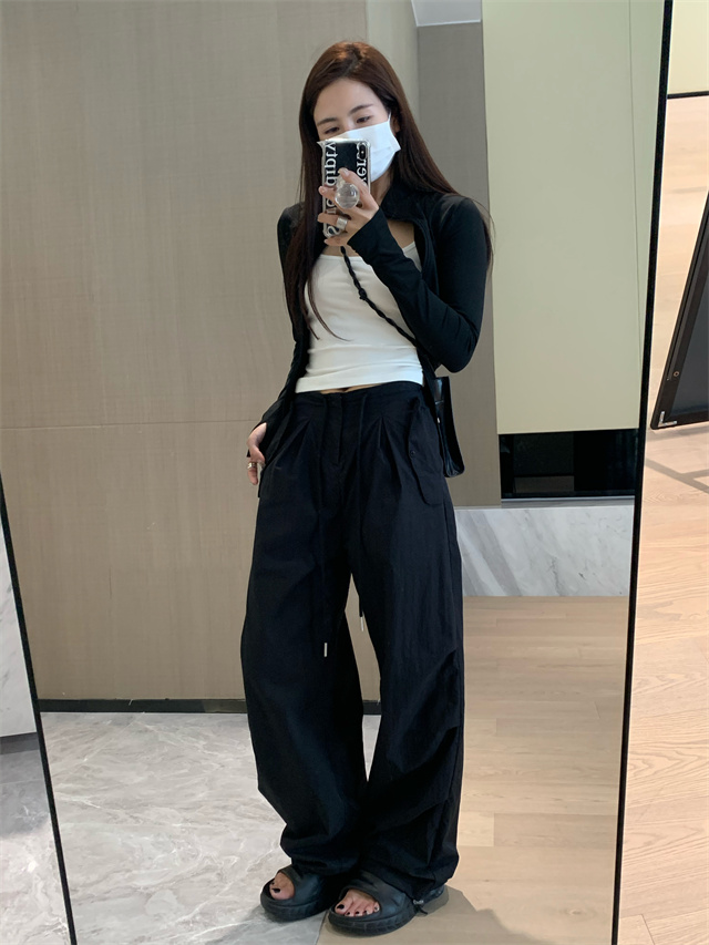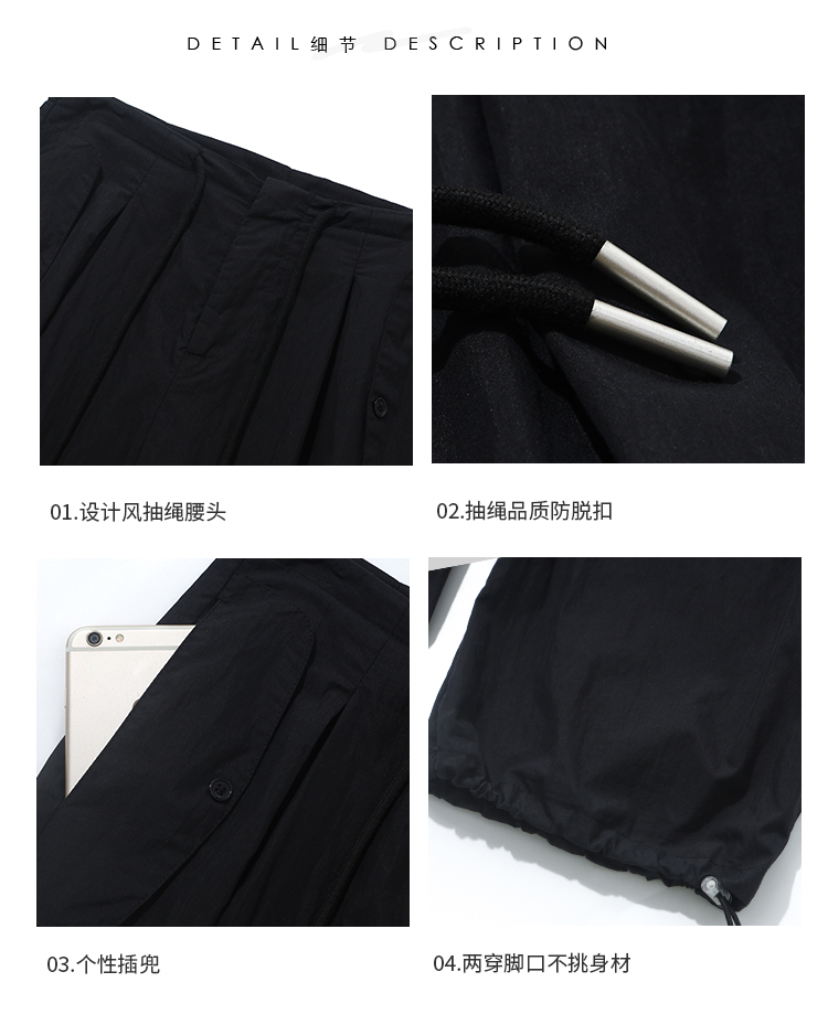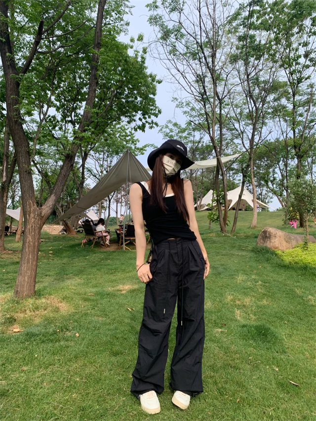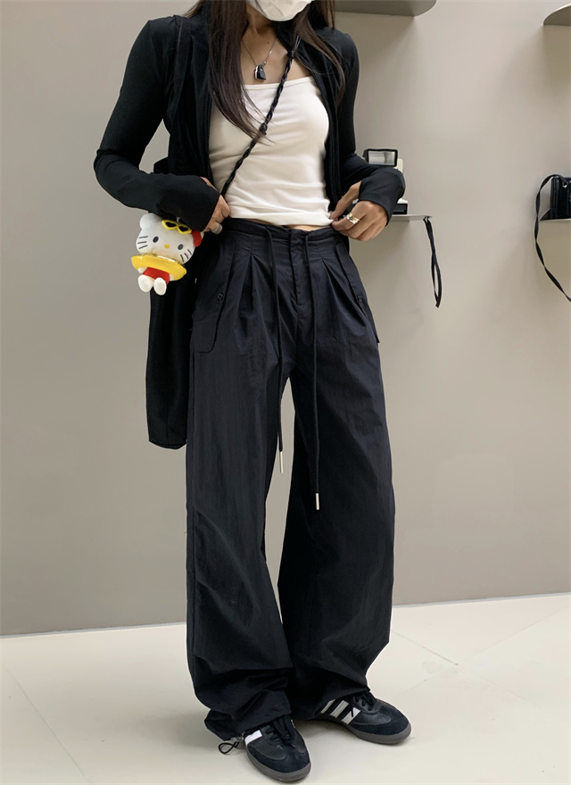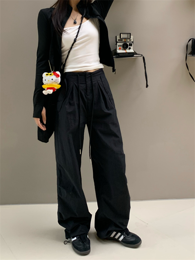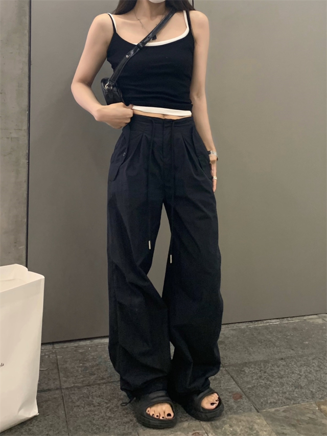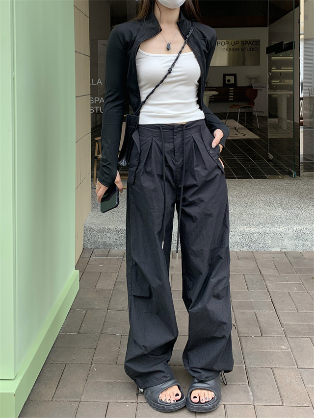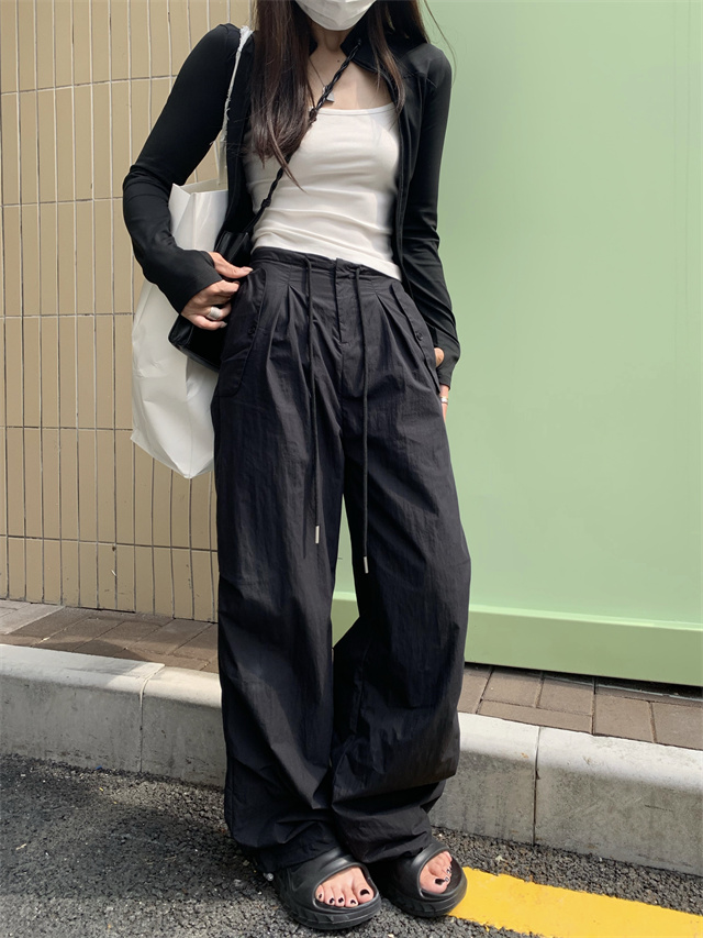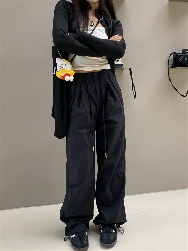 留下 1992 夏季黑色降落傘美式工裝褲女百搭薄款抽繩兩穿直筒褲女