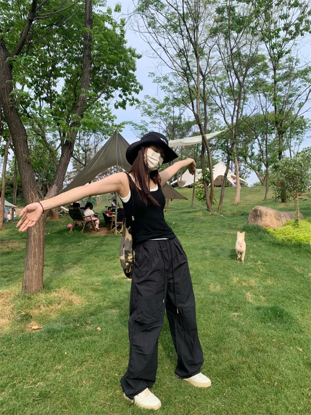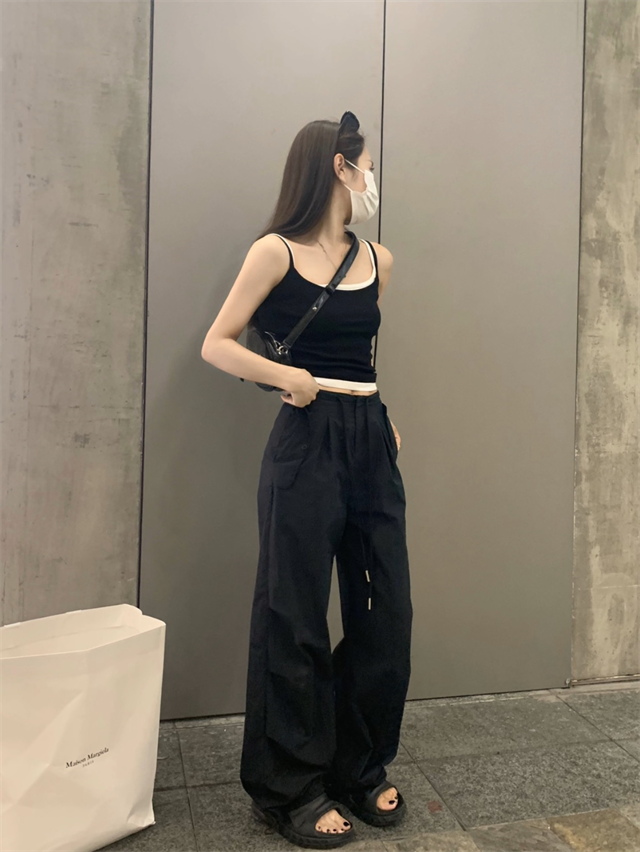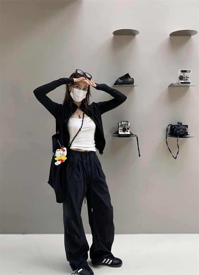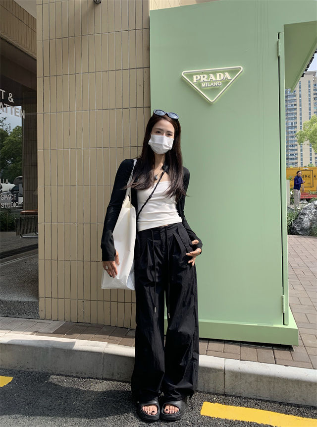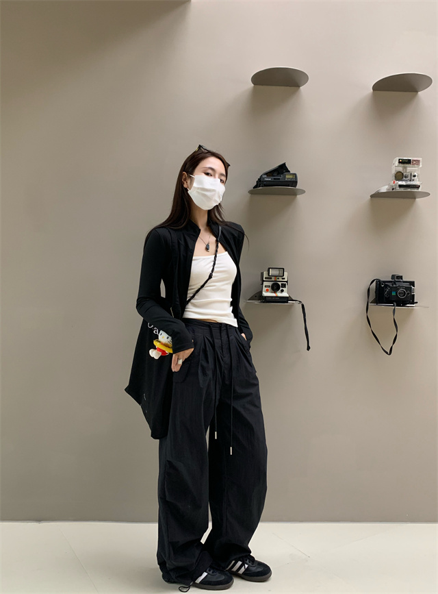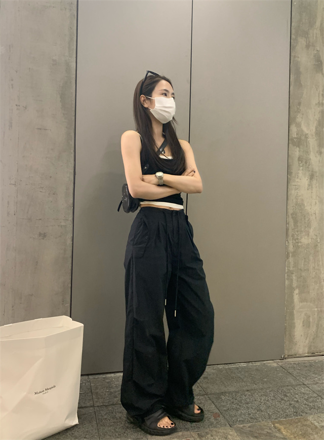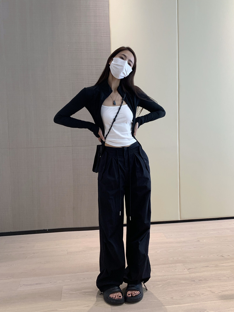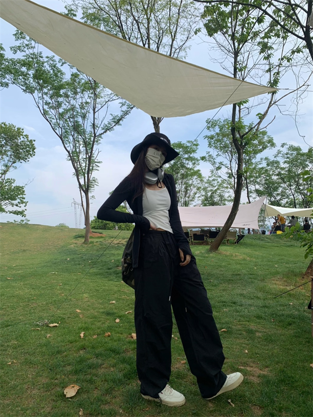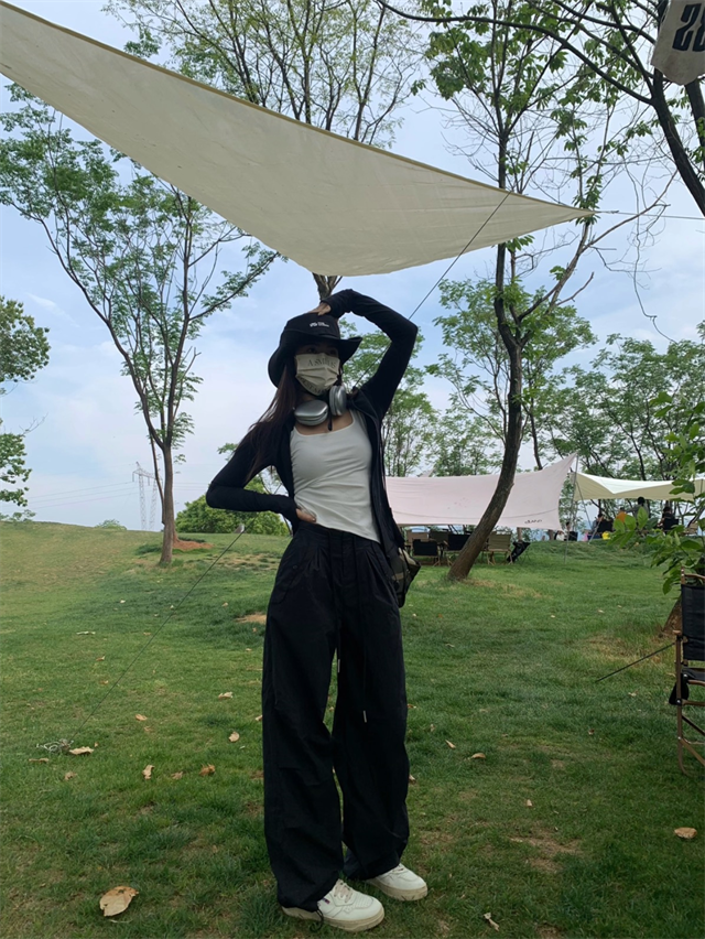留下 1992 夏季黑色降落傘美式工裝褲女百搭薄款抽繩兩穿直筒褲女