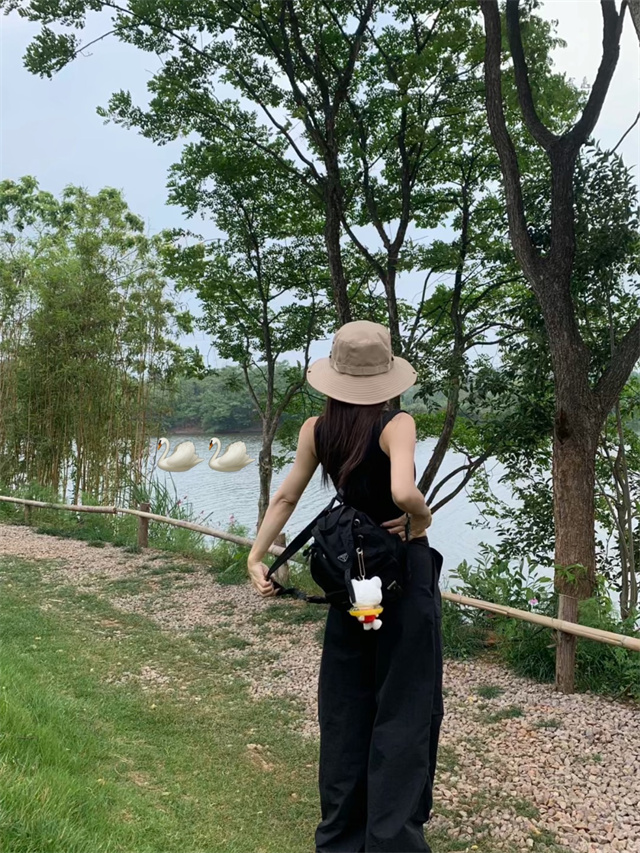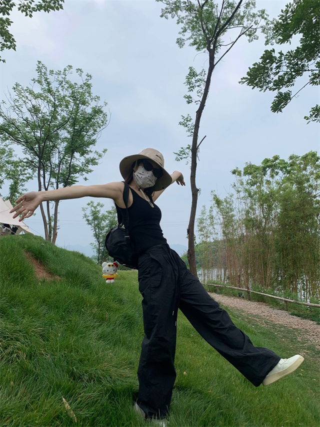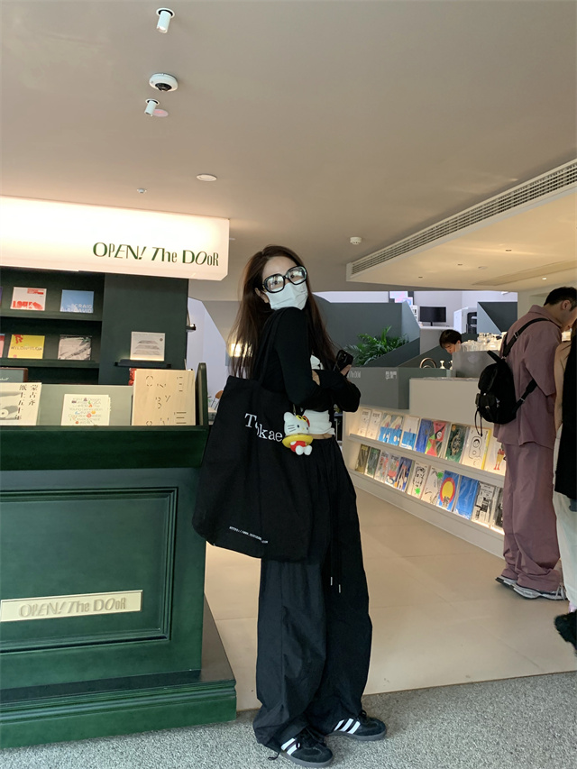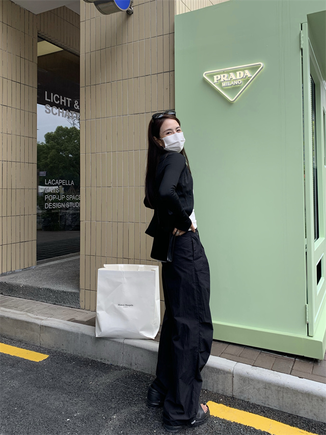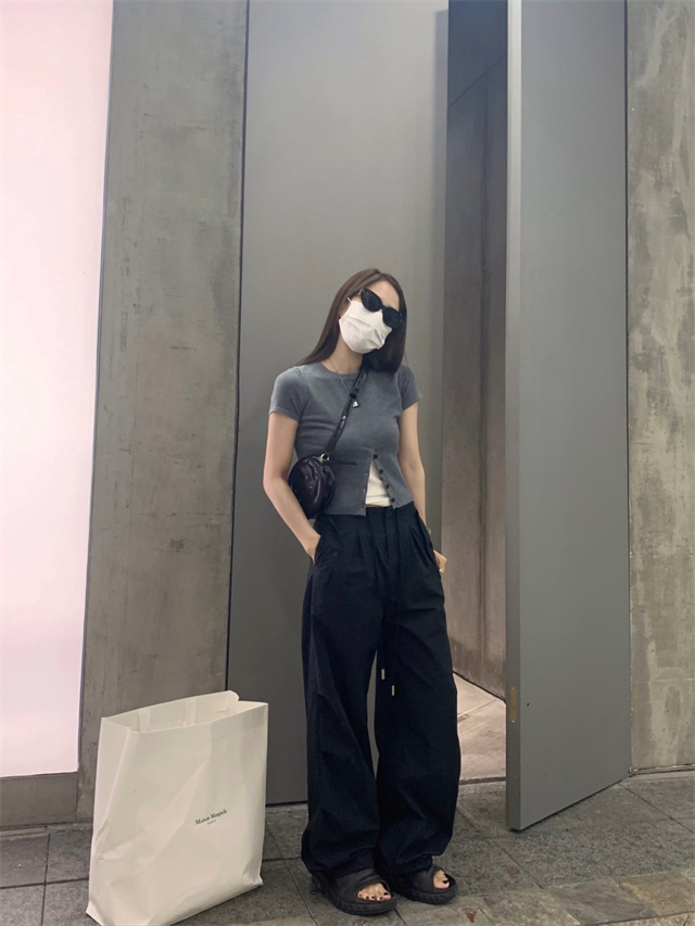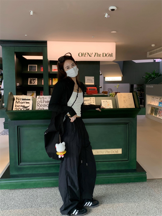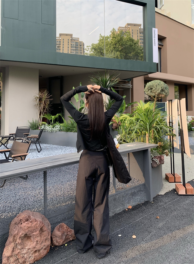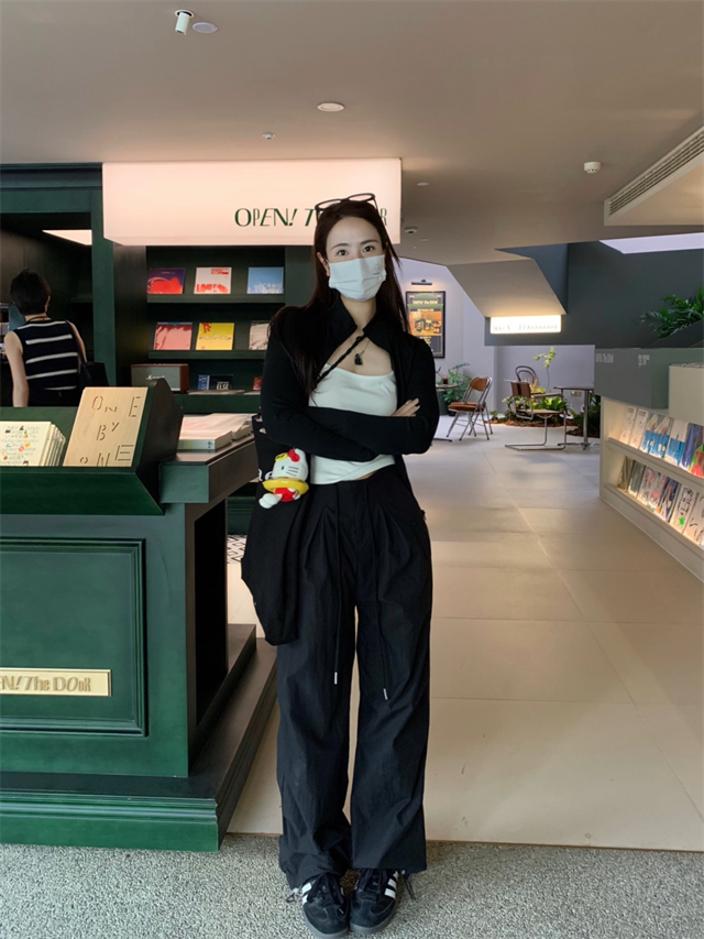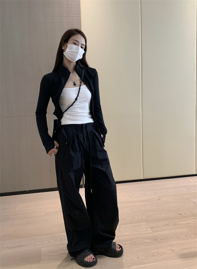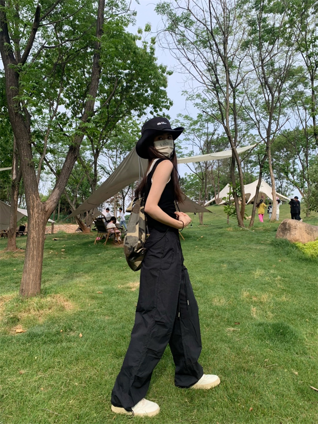 留下 1992 夏季黑色降落傘美式工裝褲女百搭薄款抽繩兩穿直筒褲女
