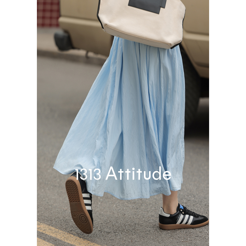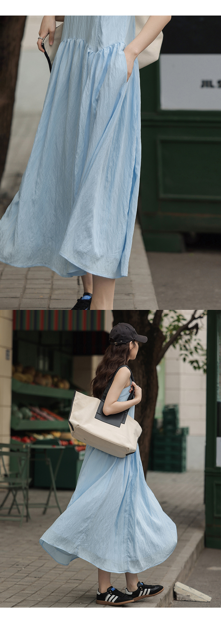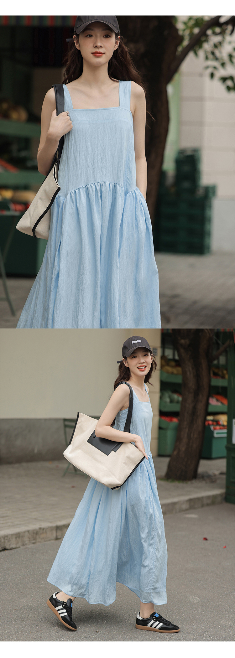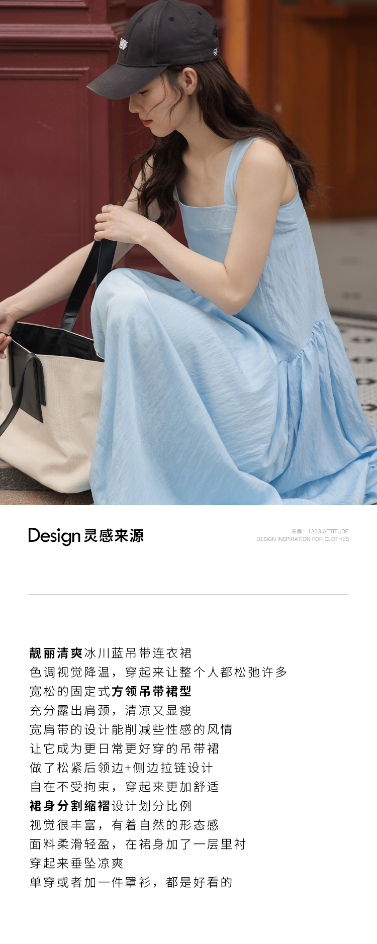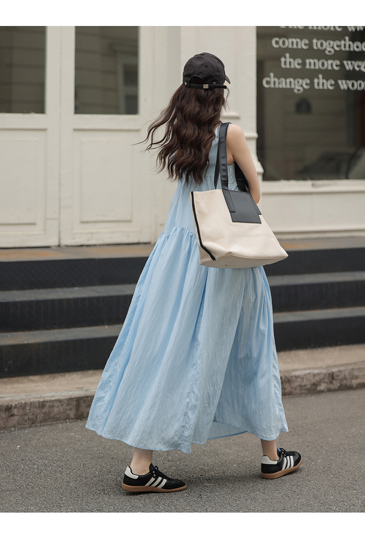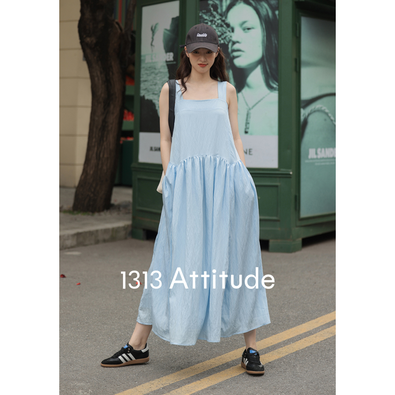 1313靚麗清爽!冰川藍吊帶洋裝夏女方領寬鬆休閒垂墜大擺長裙子