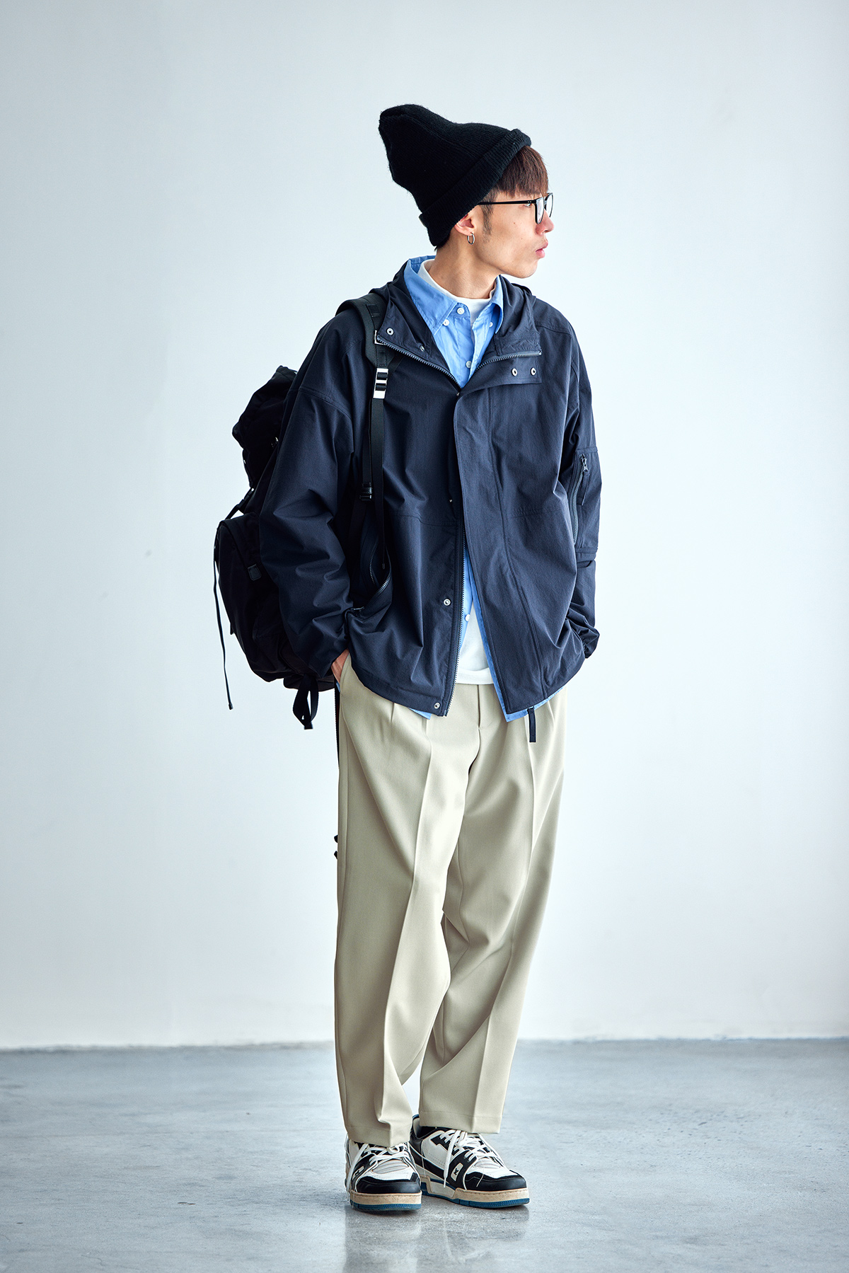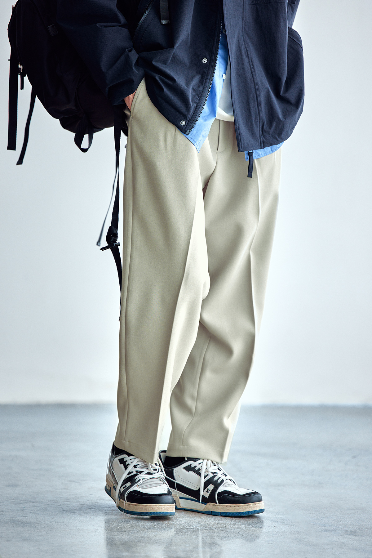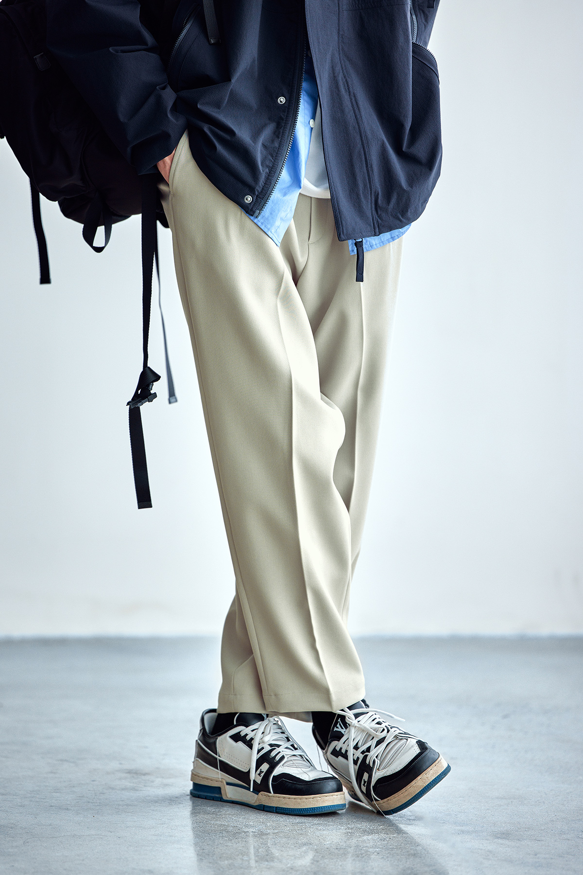 版型方面采用了微宽松微锥形直筒版型 ,配合中骨熨烫处理,裁剪上采用了双褶设定加上NO BREAK CUT 的裤长裁剪,着用时裤长刚刚到鞋面。无论是任何身材都能轻松驾驭。可轻易搭配各种款式的鞋款,轻松融入各种款式的服装中。腰部后部还配有松紧带,给人一种舒适感,无需系腰带即可轻松穿着。