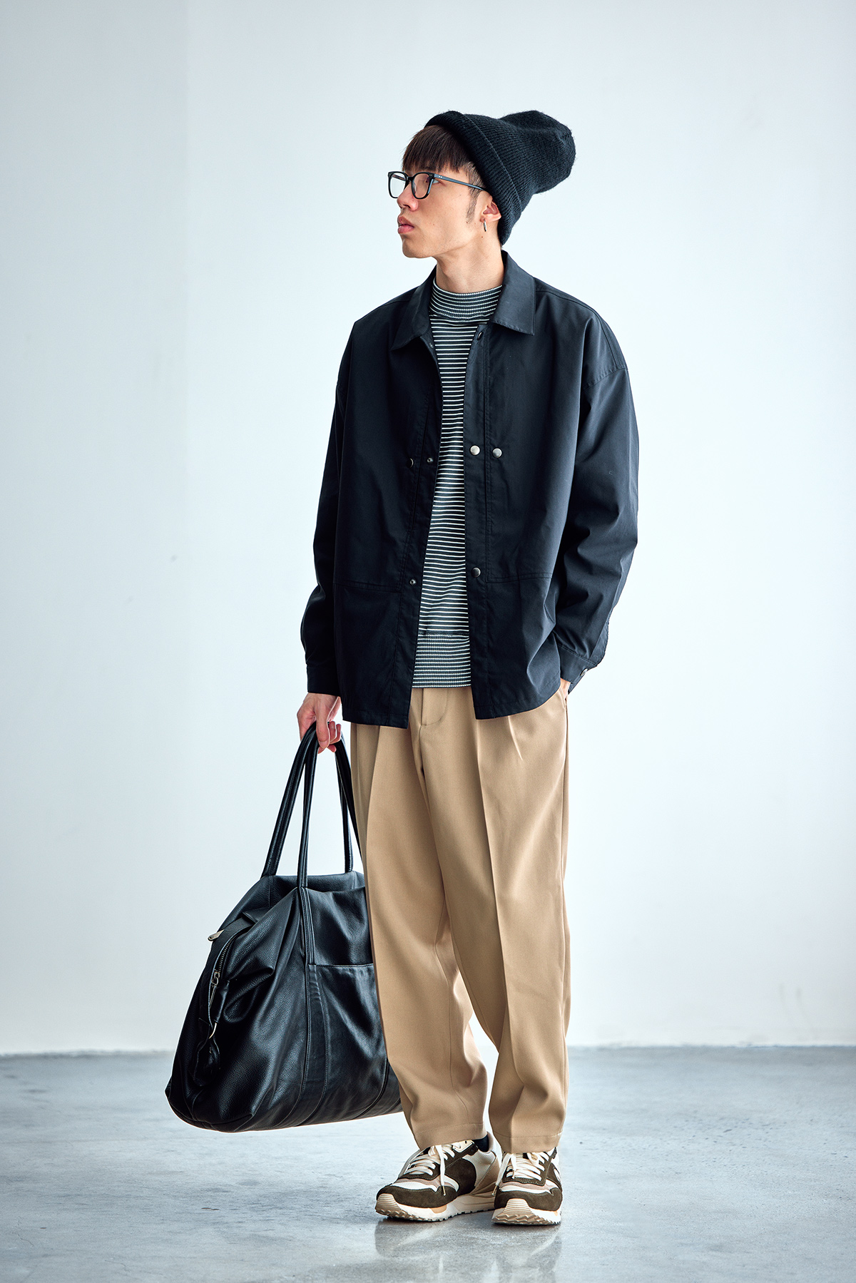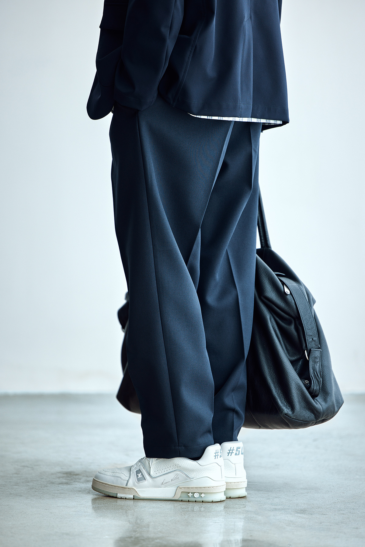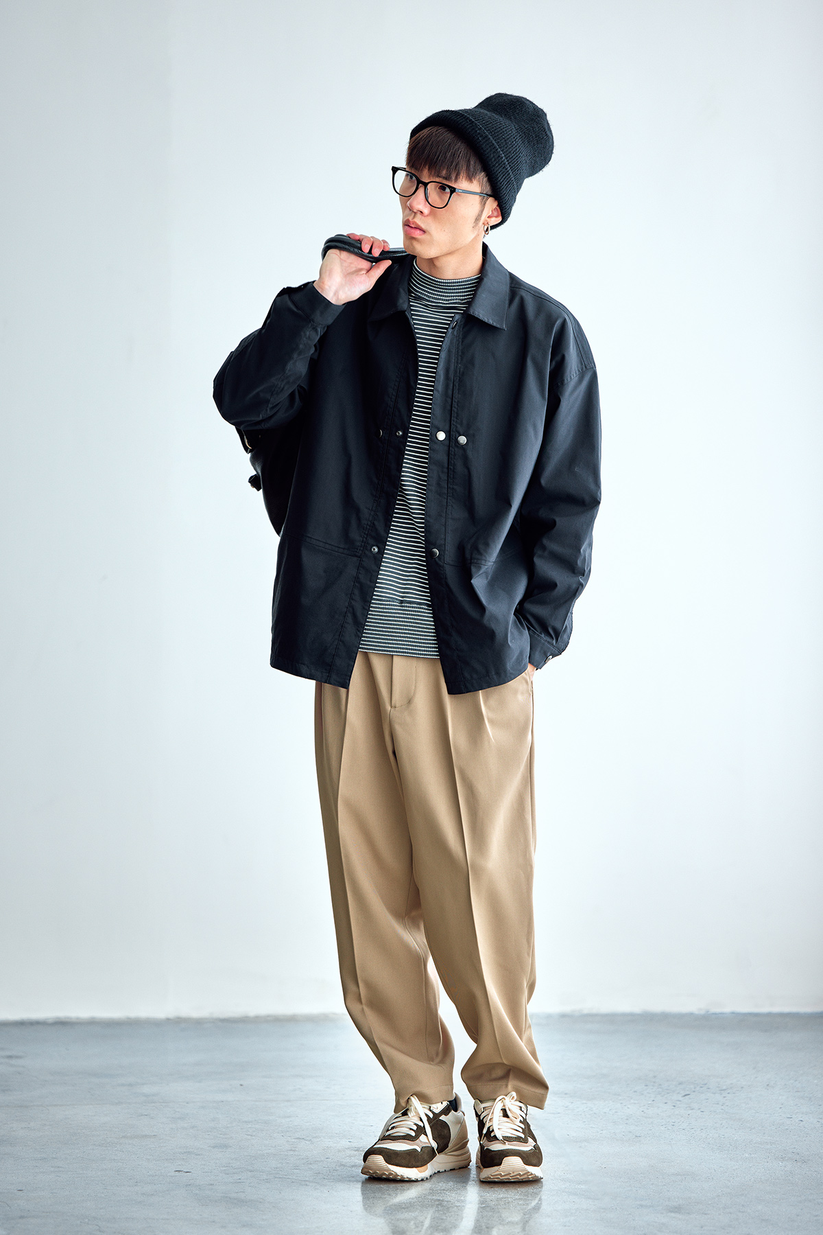 版型方面采用了微宽松微锥形直筒版型 ,配合中骨熨烫处理,裁剪上采用了双褶设定加上NO BREAK CUT 的裤长裁剪,着用时裤长刚刚到鞋面。无论是任何身材都能轻松驾驭。可轻易搭配各种款式的鞋款,轻松融入各种款式的服装中。腰部后部还配有松紧带,给人一种舒适感,无需系腰带即可轻松穿着。