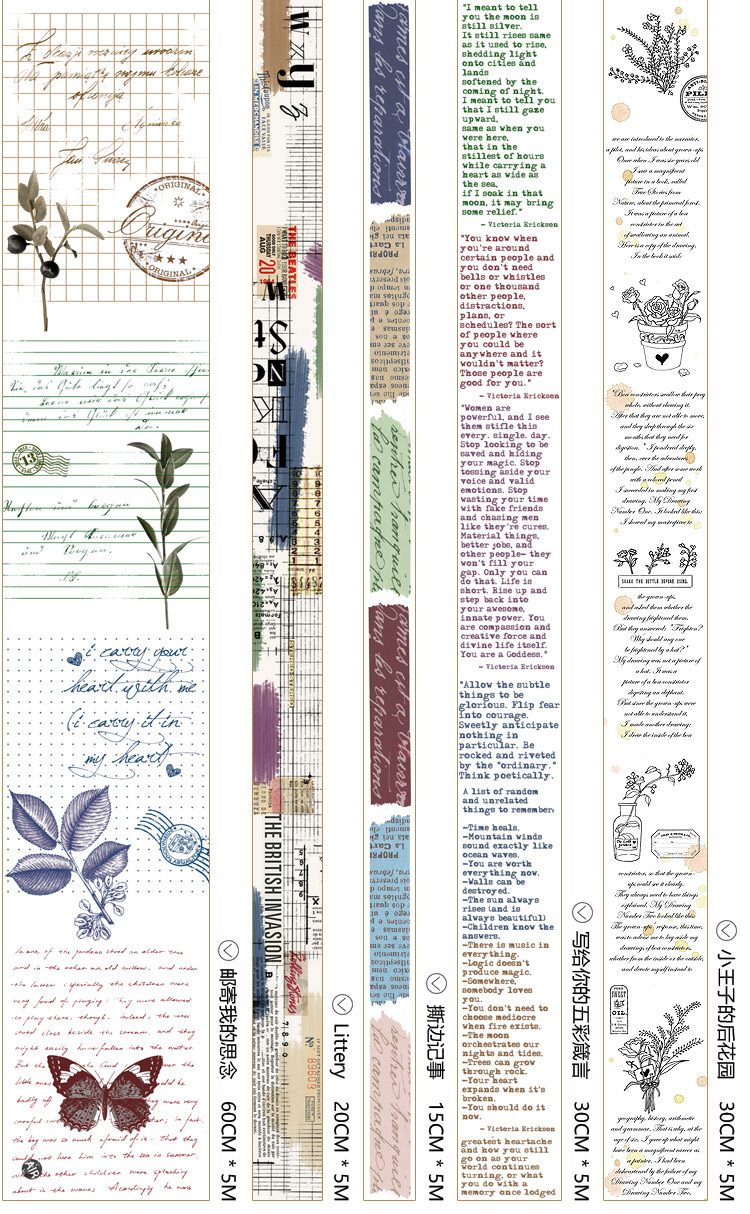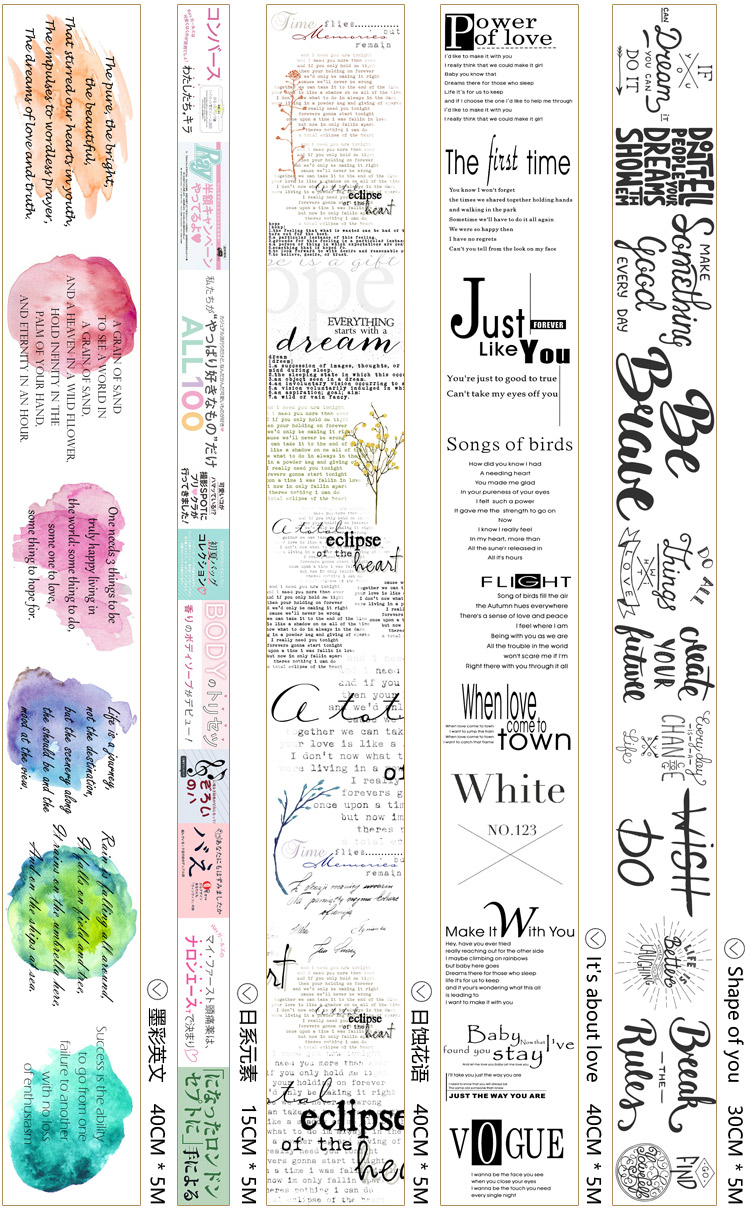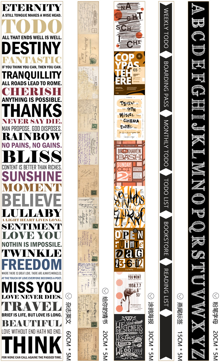 颜色 燕尾标签15*5,日系元素15*5,撕边记事15*5,粉笔字母20*5,LITTERY20*5,给你的情书20*5,写给你的五彩箴言30*5,SHAPE OF YOU30*5,涂鸦海报30*5,小王子的后花园30*5,墨彩英文40*5,日蚀花语40*5,IT'ABOUTLOVE40*5,邮寄我的思念60*5,杂志英文60*5