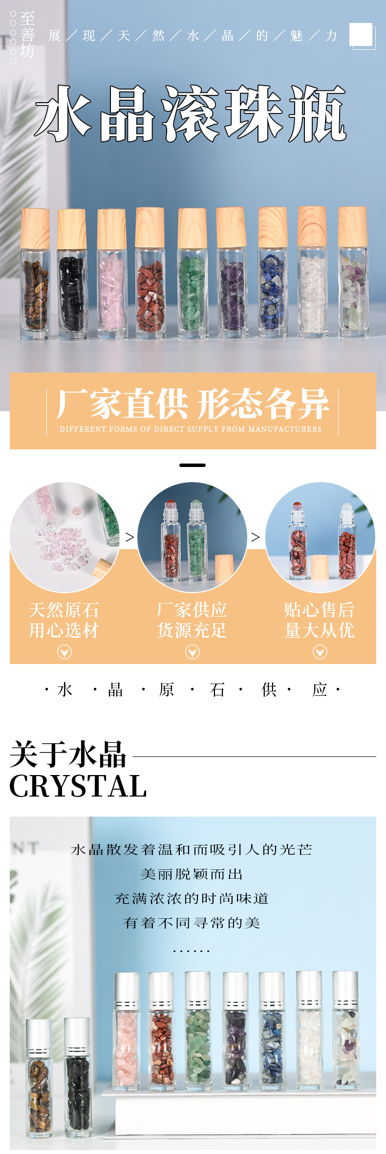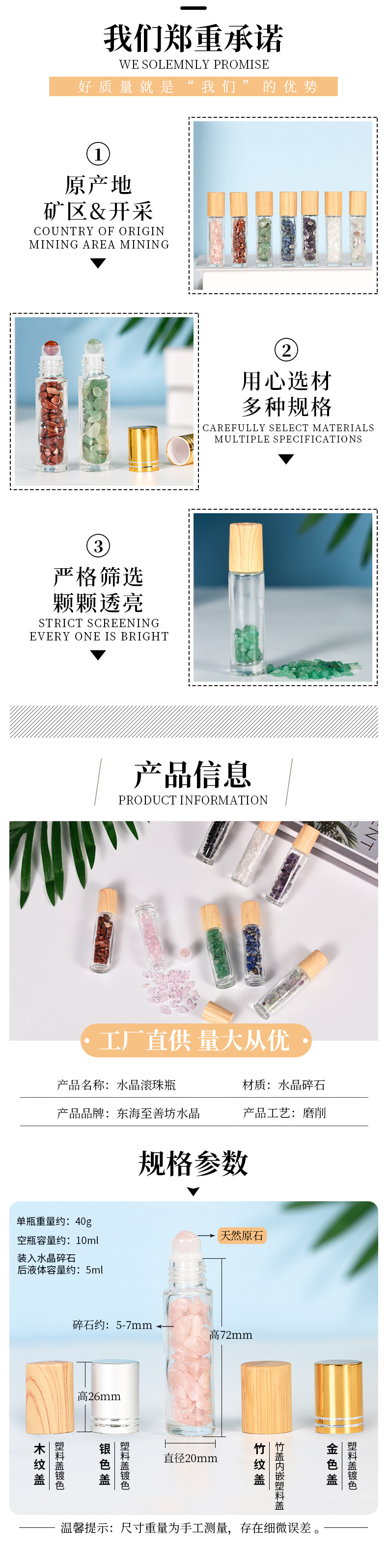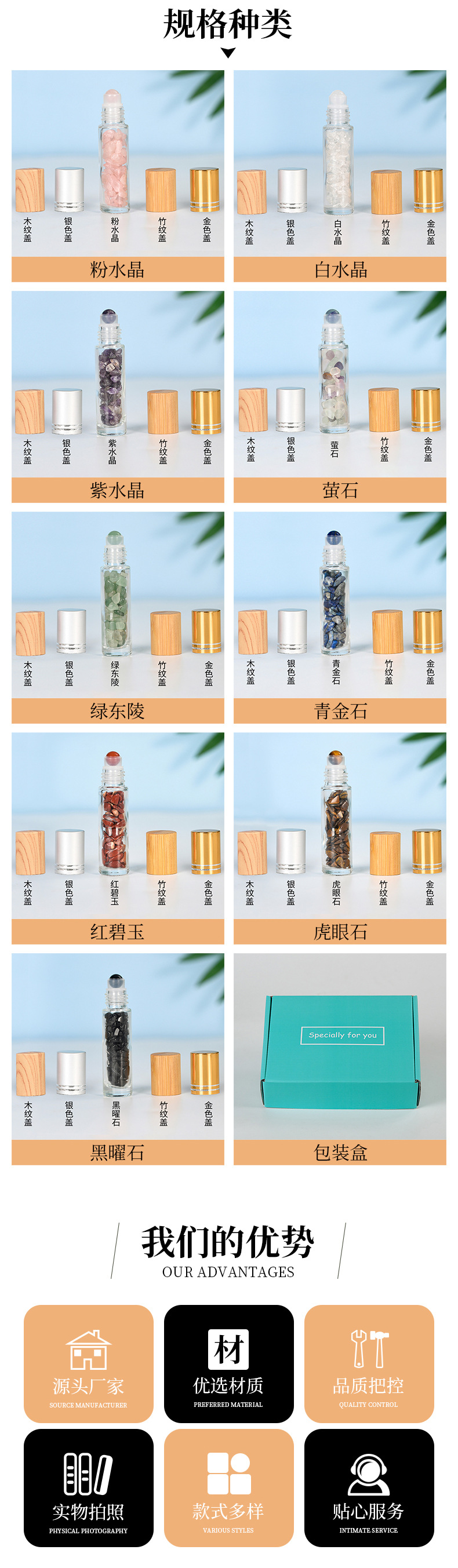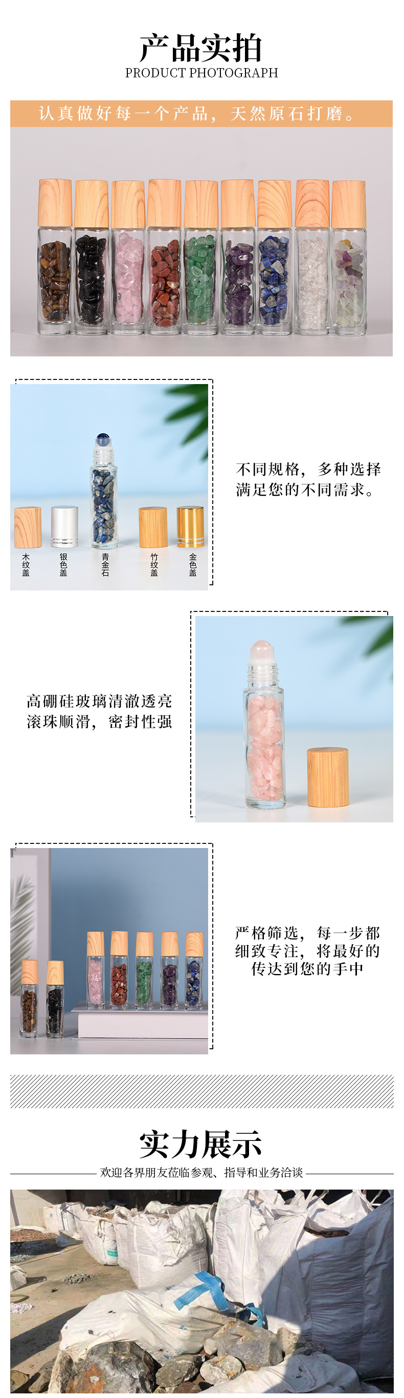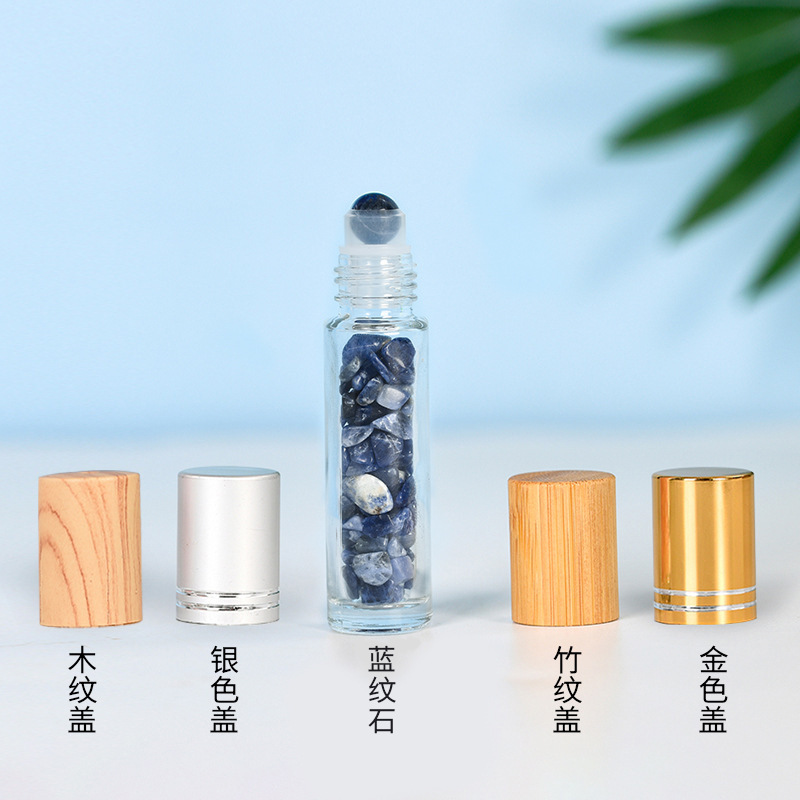 厂家热销现货10ml木纹盖精油走珠瓶香水分装瓶水晶碎石玉石滚珠瓶