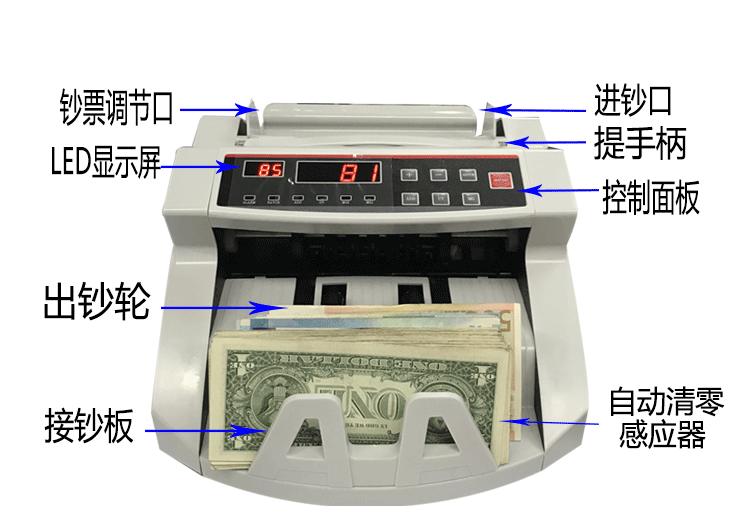 2108外币点钞机:289X255X180MM能快速鉴别钱币真假,LED灯清晰显示数字等多功能,遇到假钱自动报警停机,本机鉴别率高、速度快、点数准确。操作简单,方便使用. 。