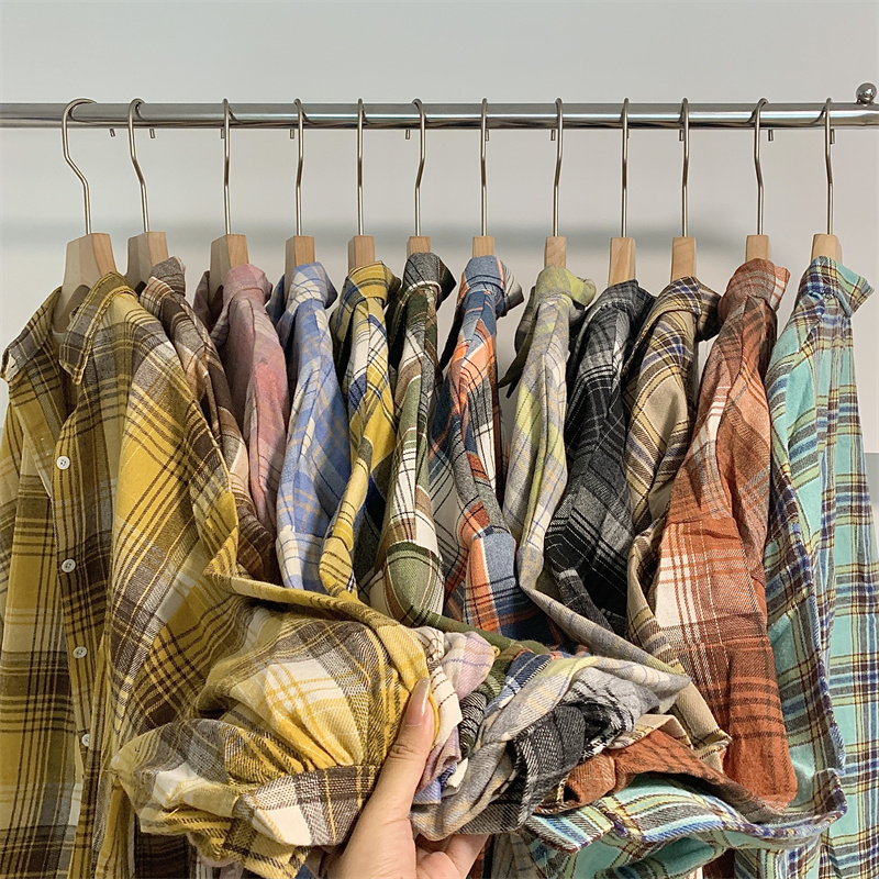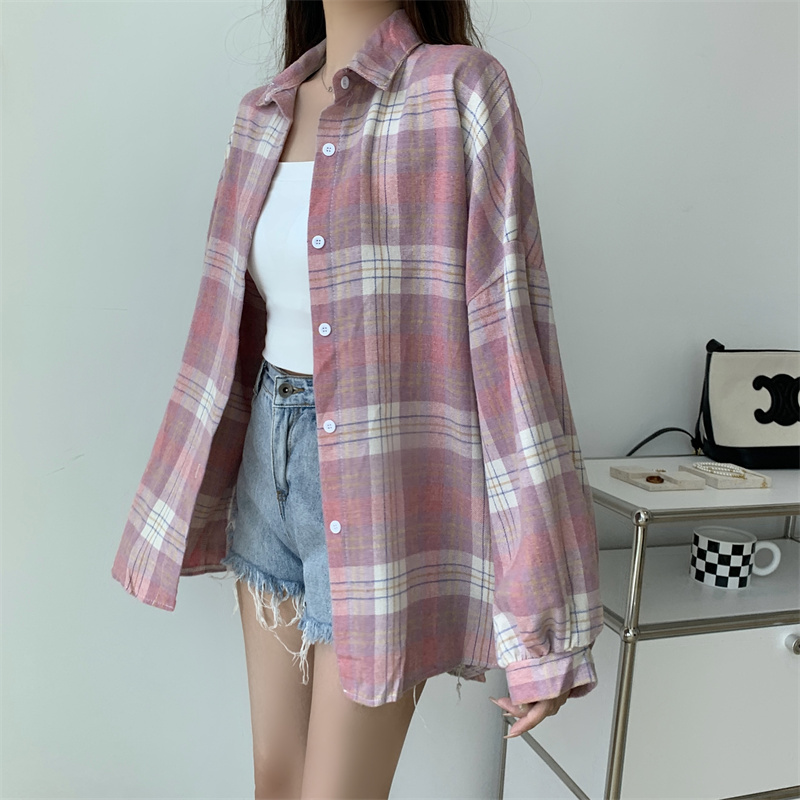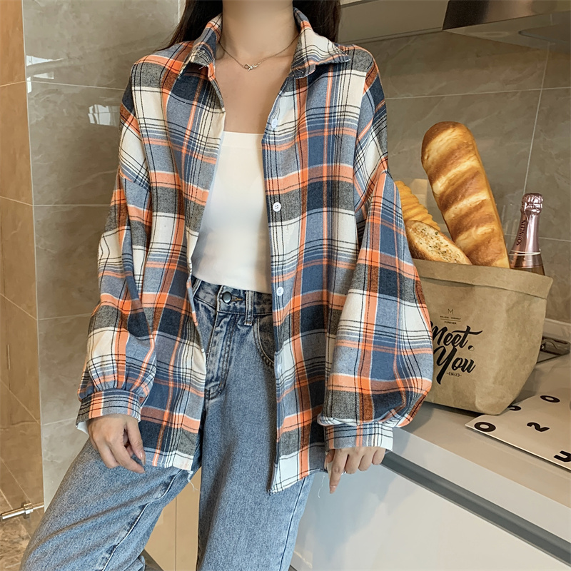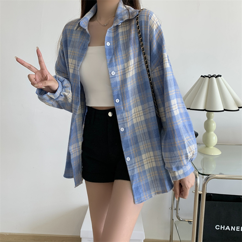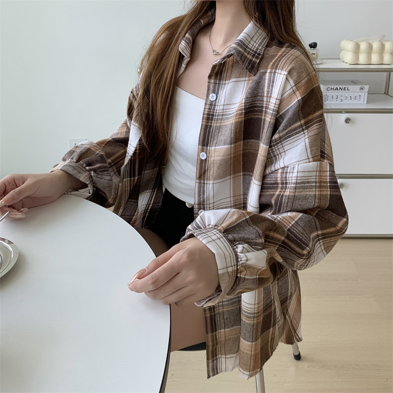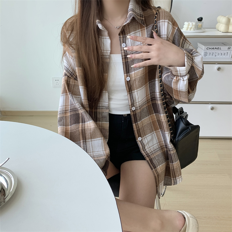 美式復古長袖格子襯衫外套女春秋設計感小眾寬鬆別致絕美襯衫上衣
