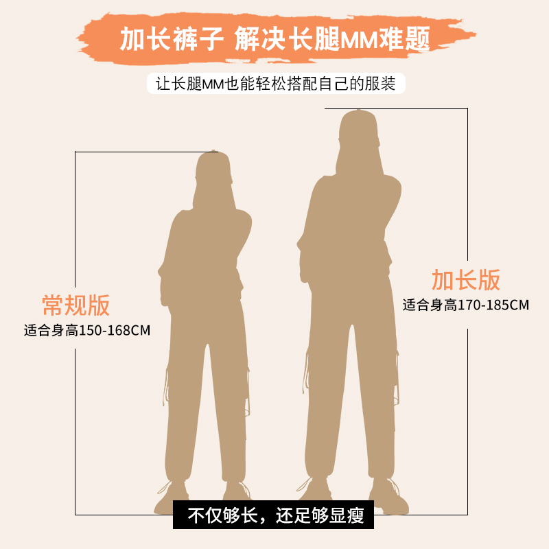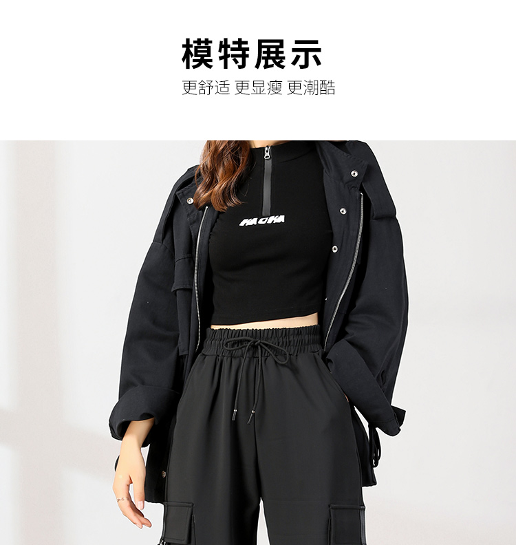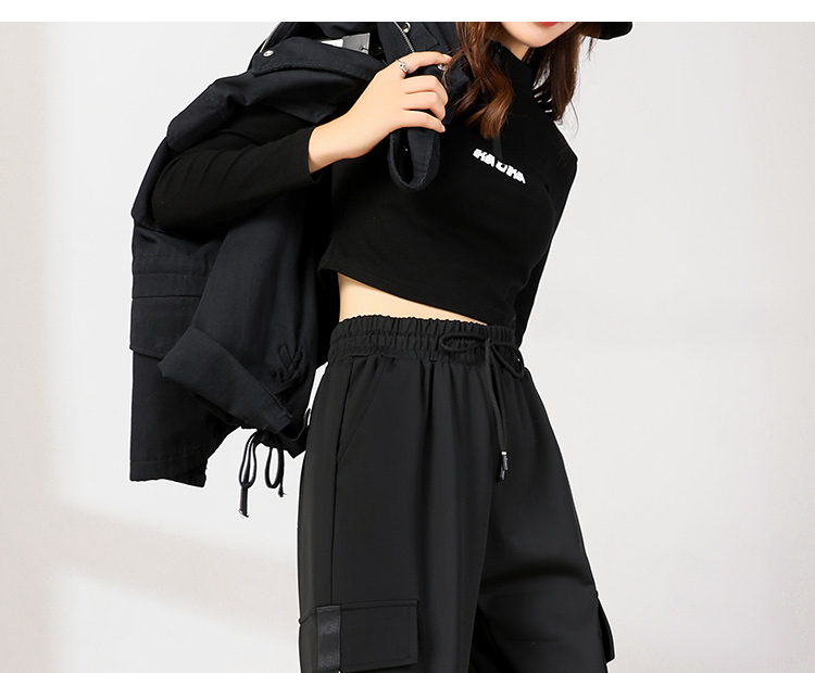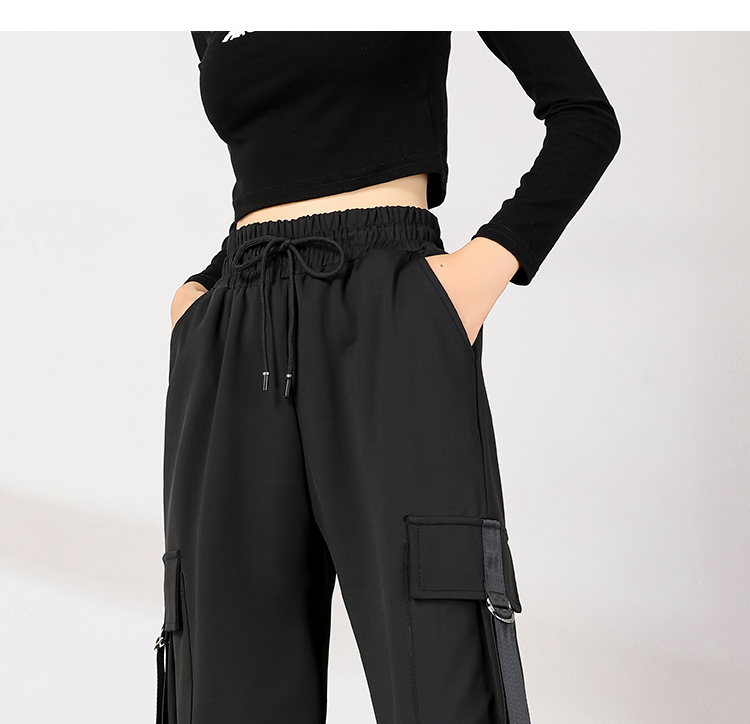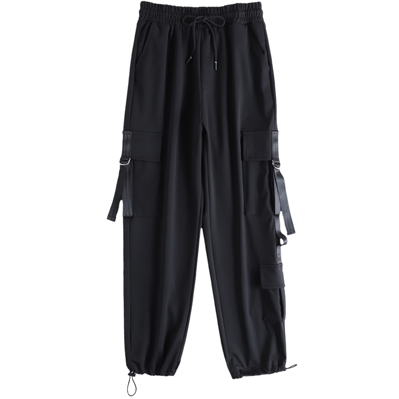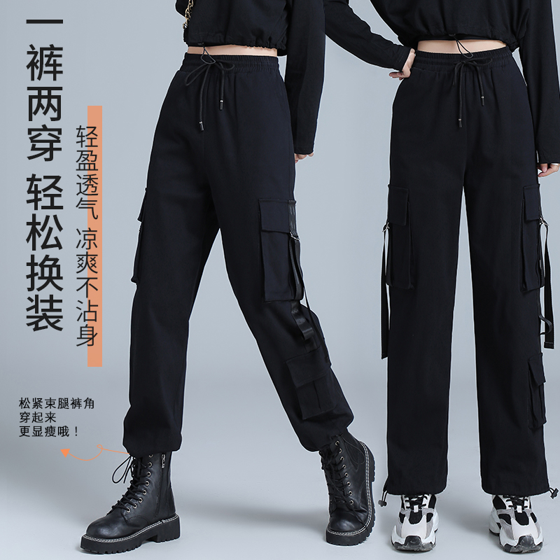美式束腳工裝褲女春秋2023新款抽繩高腰寬鬆顯瘦黑色加長休閒直筒