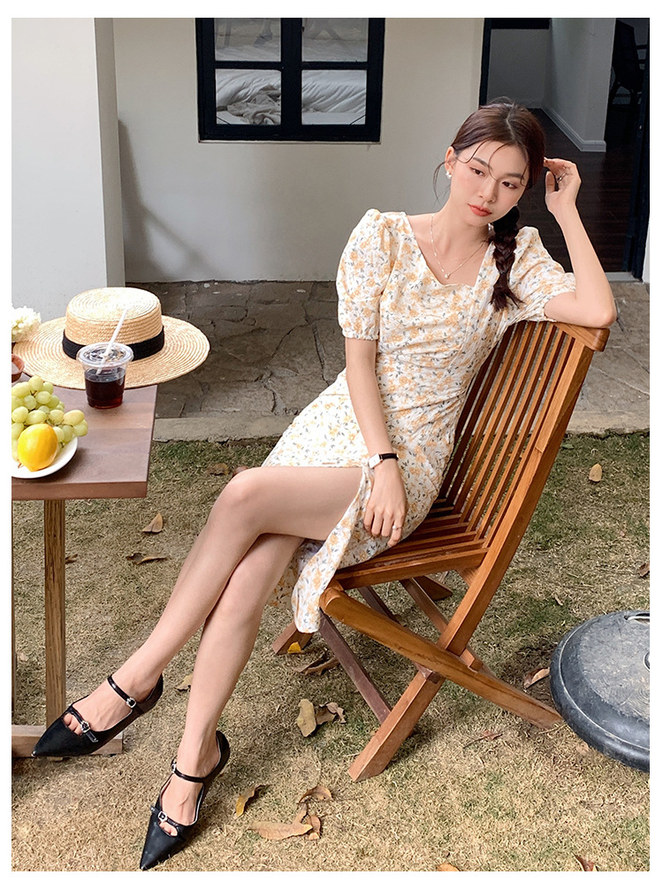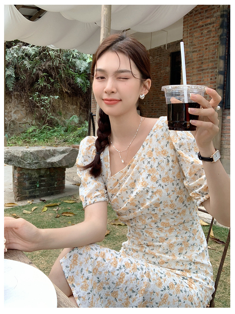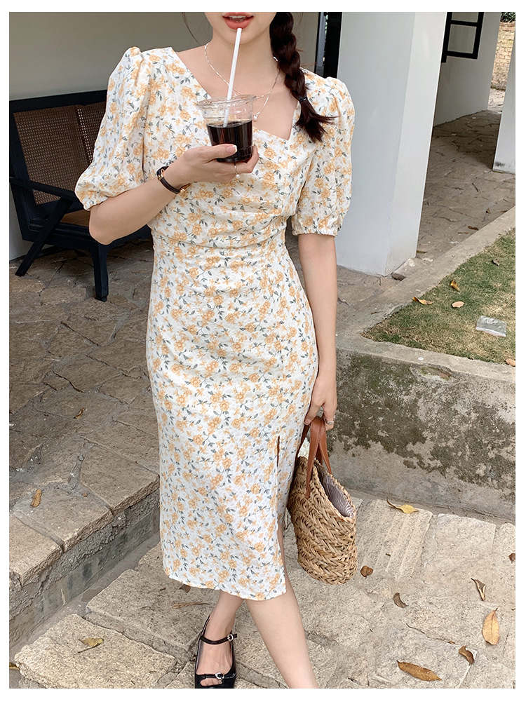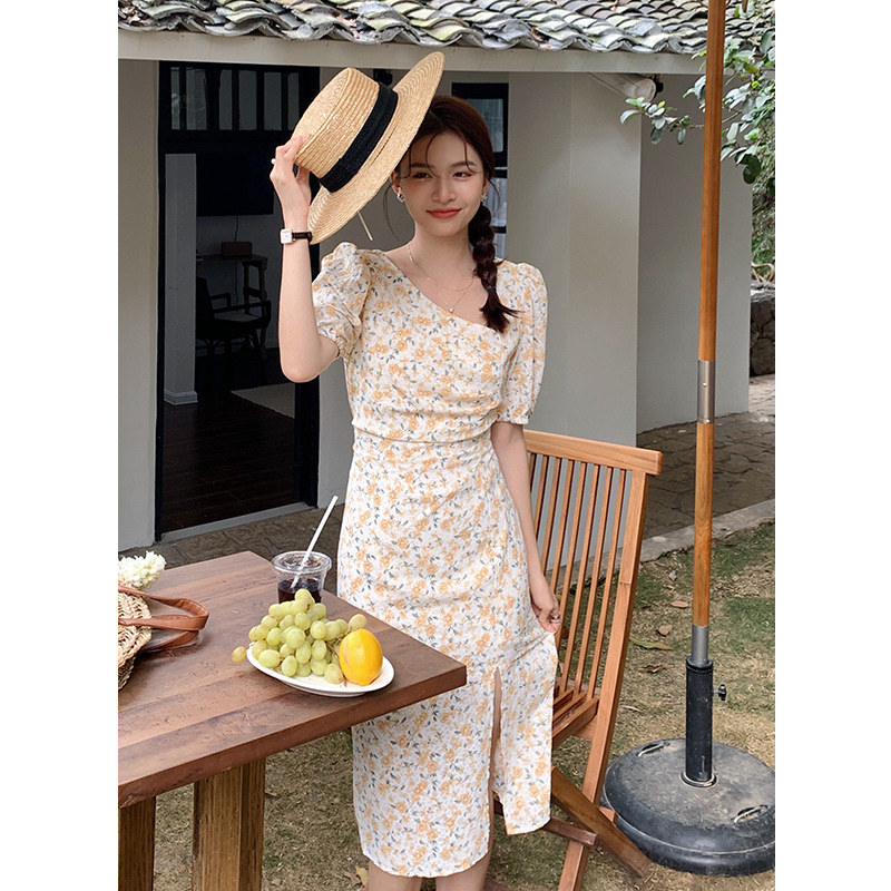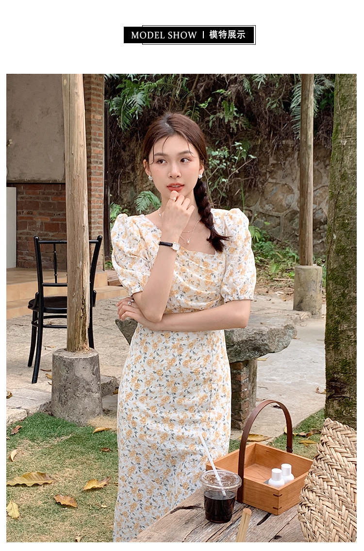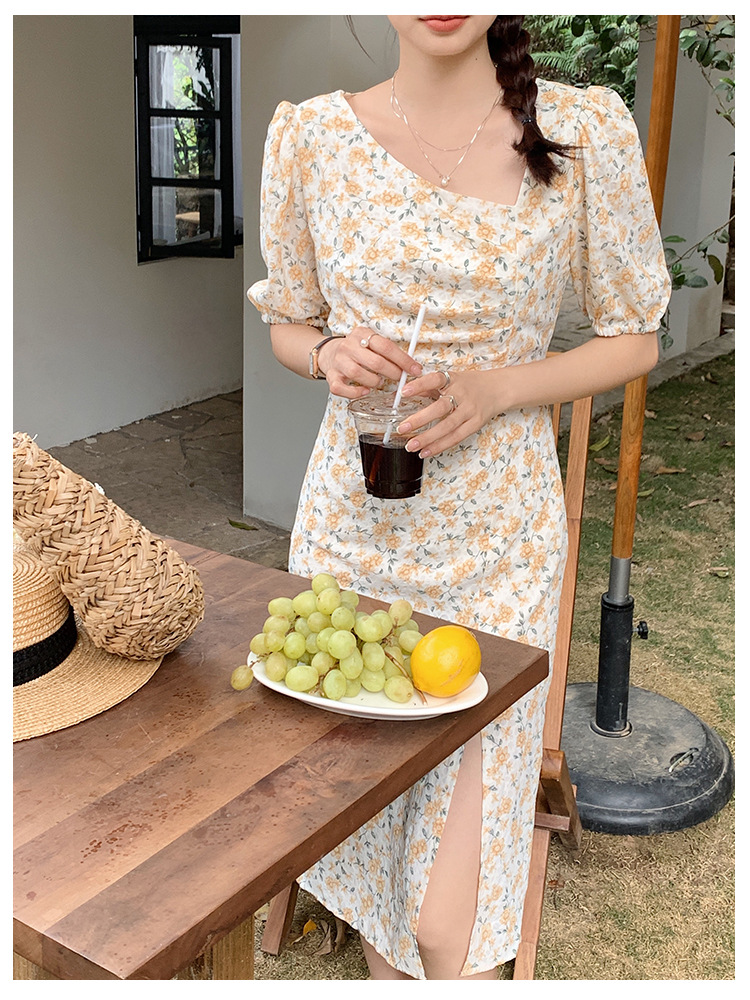 雪纺泡泡袖短袖斜领碎花连衣裙女法式气质中长款印花开叉A字茶歇