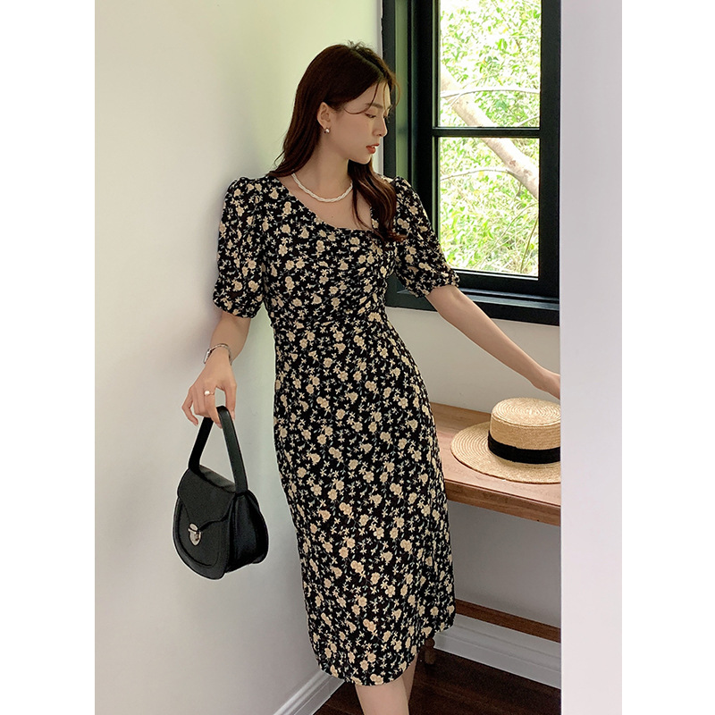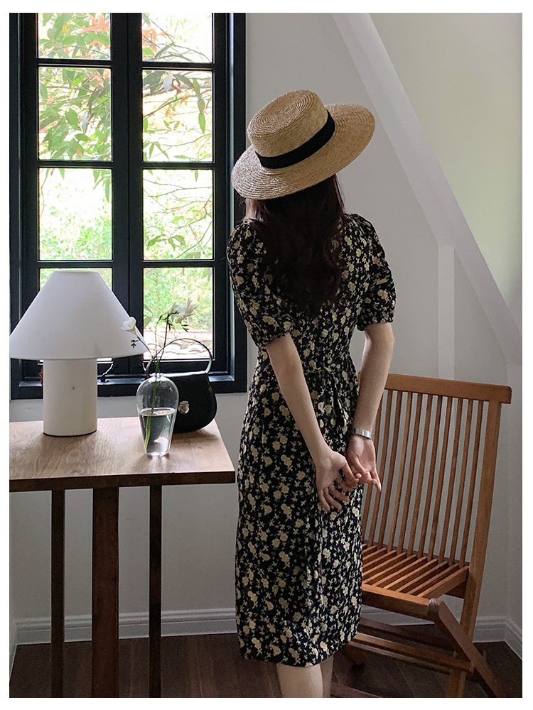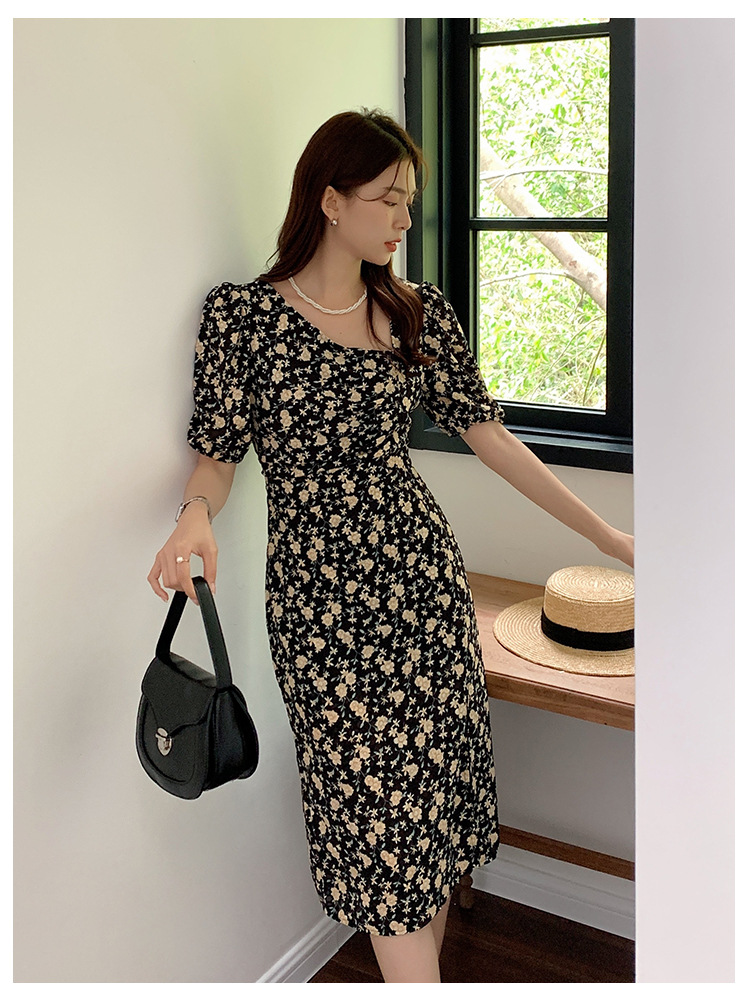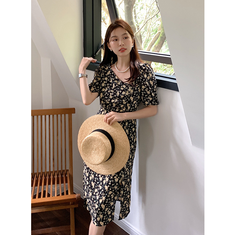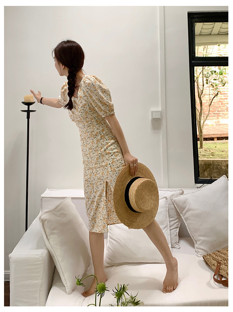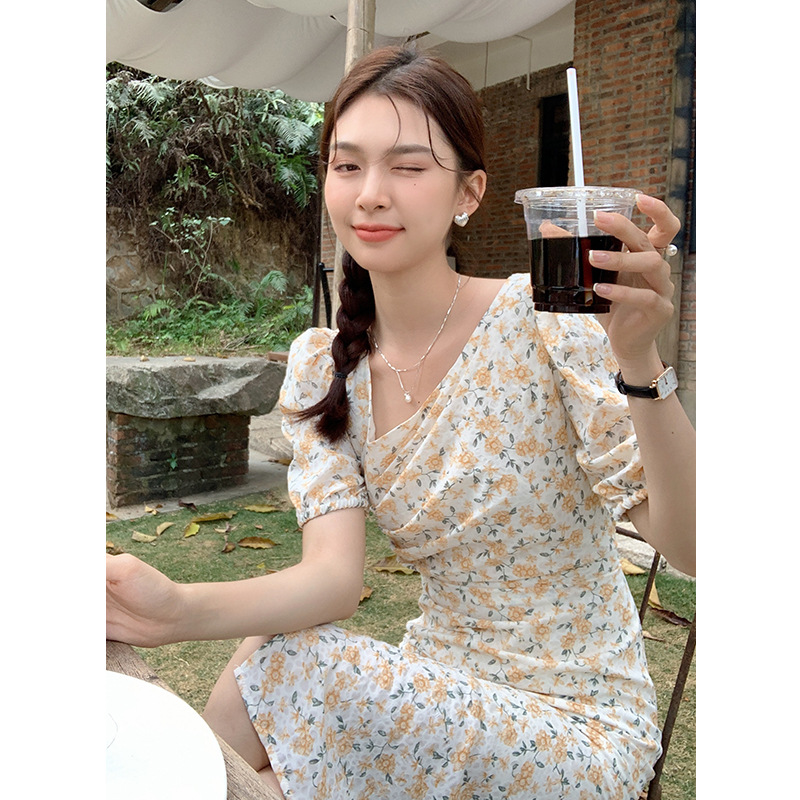 雪纺泡泡袖短袖斜领碎花连衣裙女法式气质中长款印花开叉A字茶歇