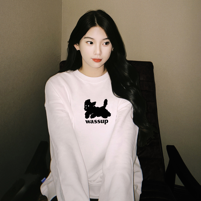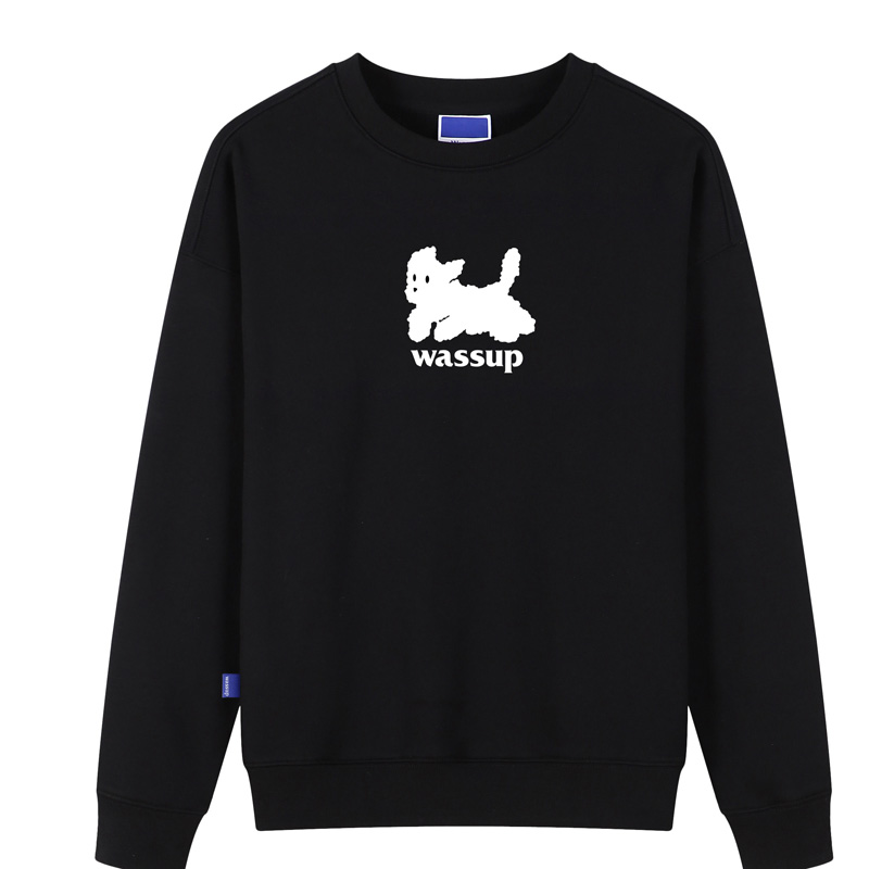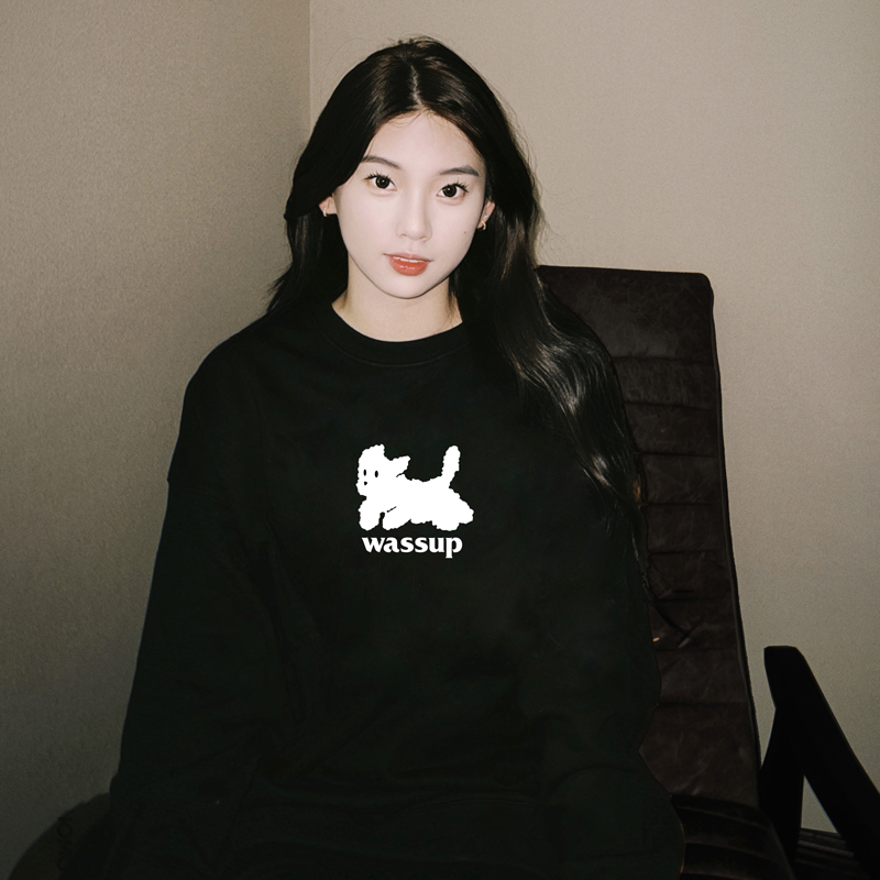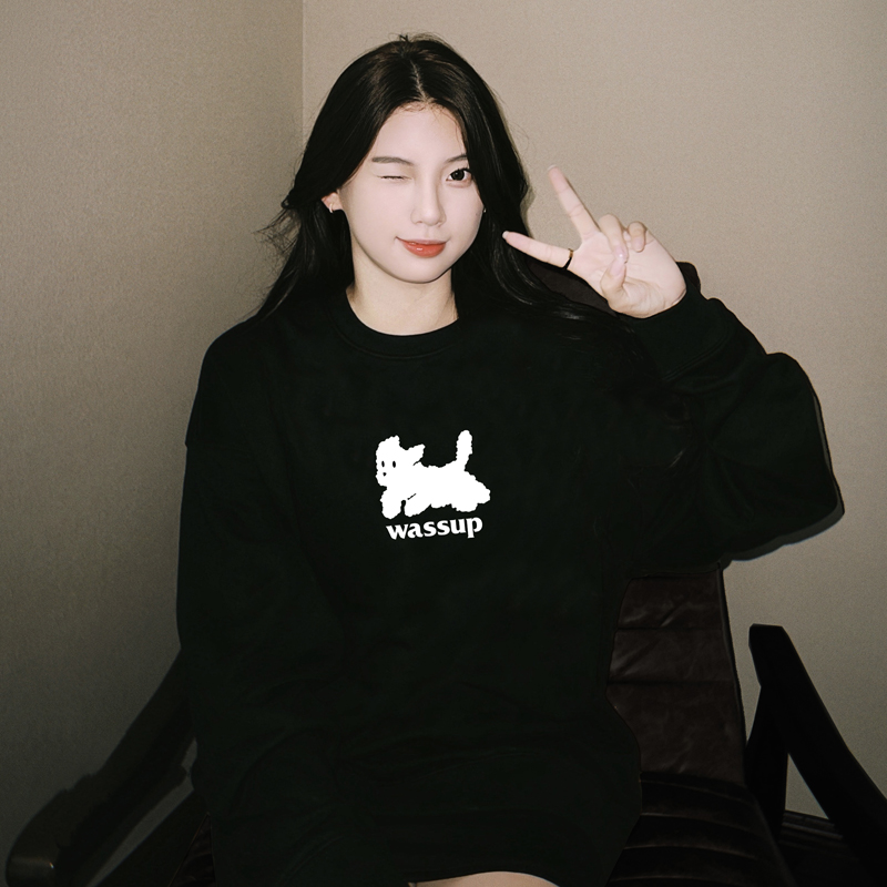 WASSUP HEART衛衣女款秋冬重磅純棉圓領無帽美式黑色套頭情侶上衣