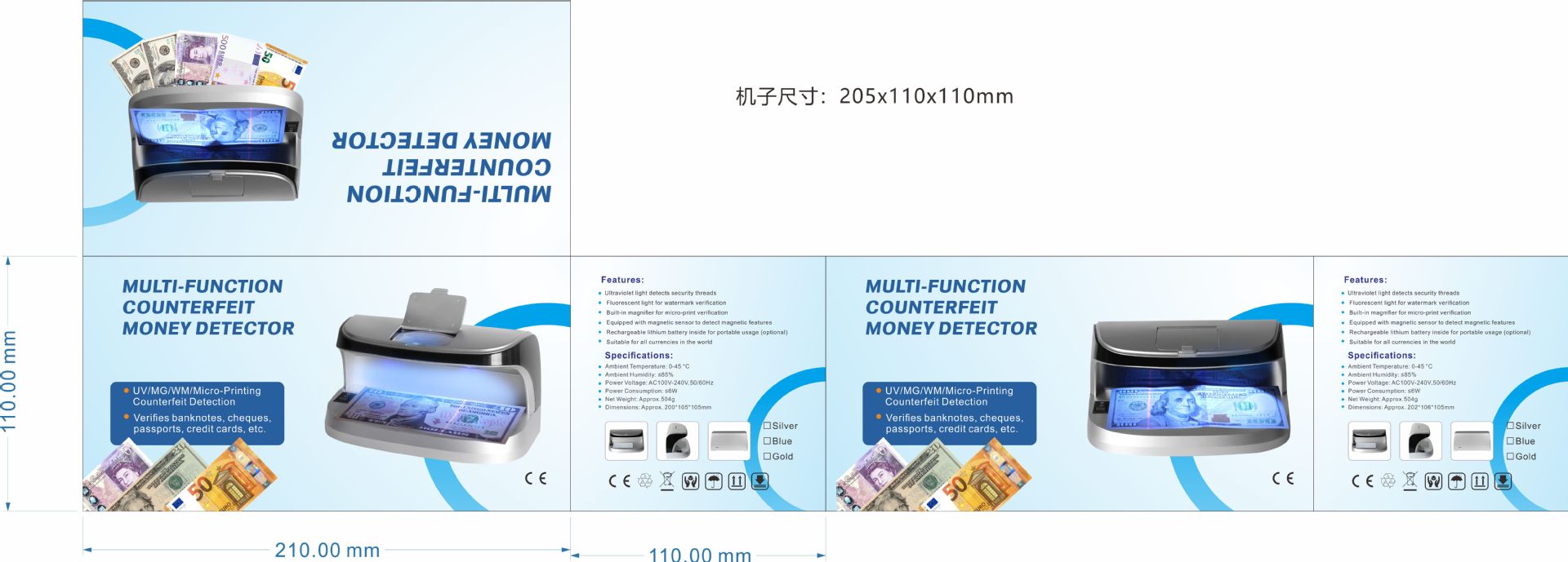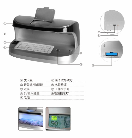 打包清单:验钞器:1台,说明书1本,USB数据线:1条