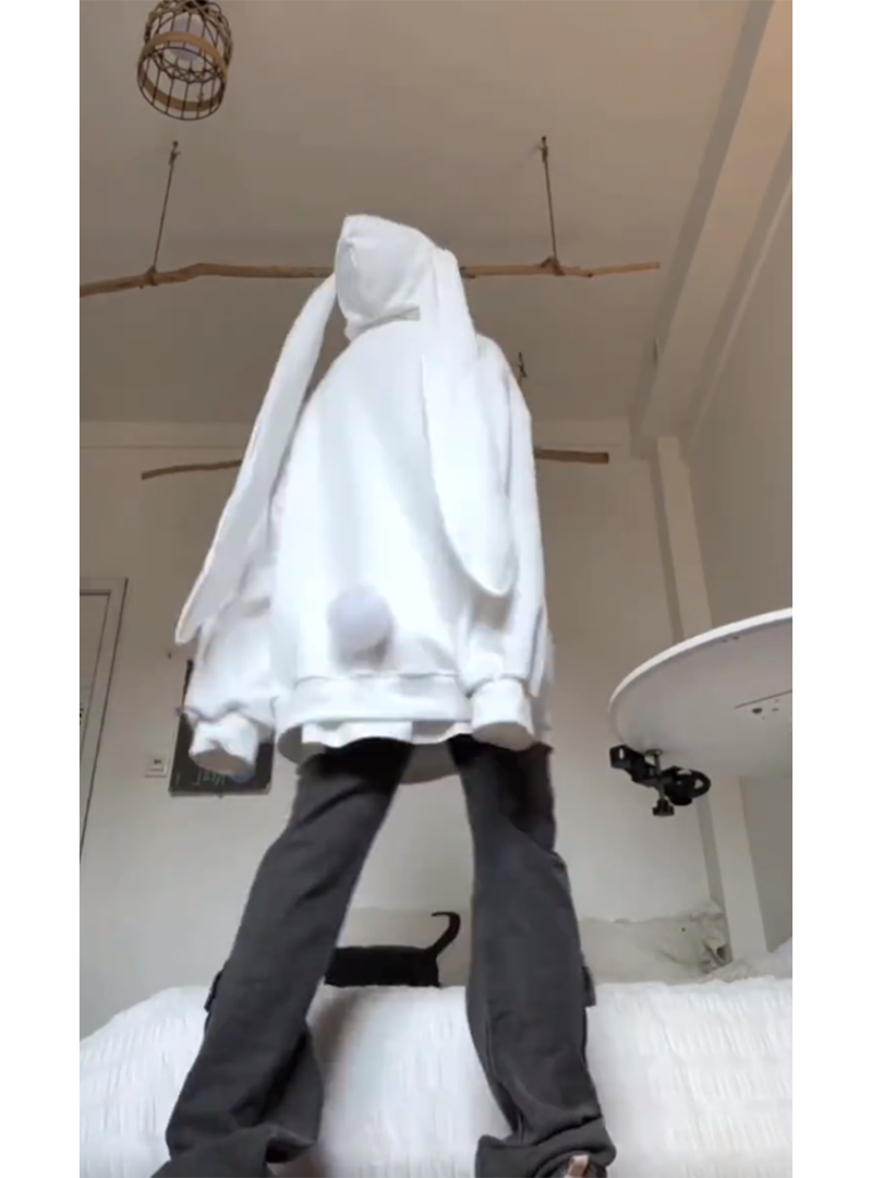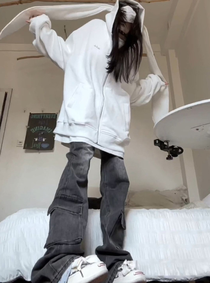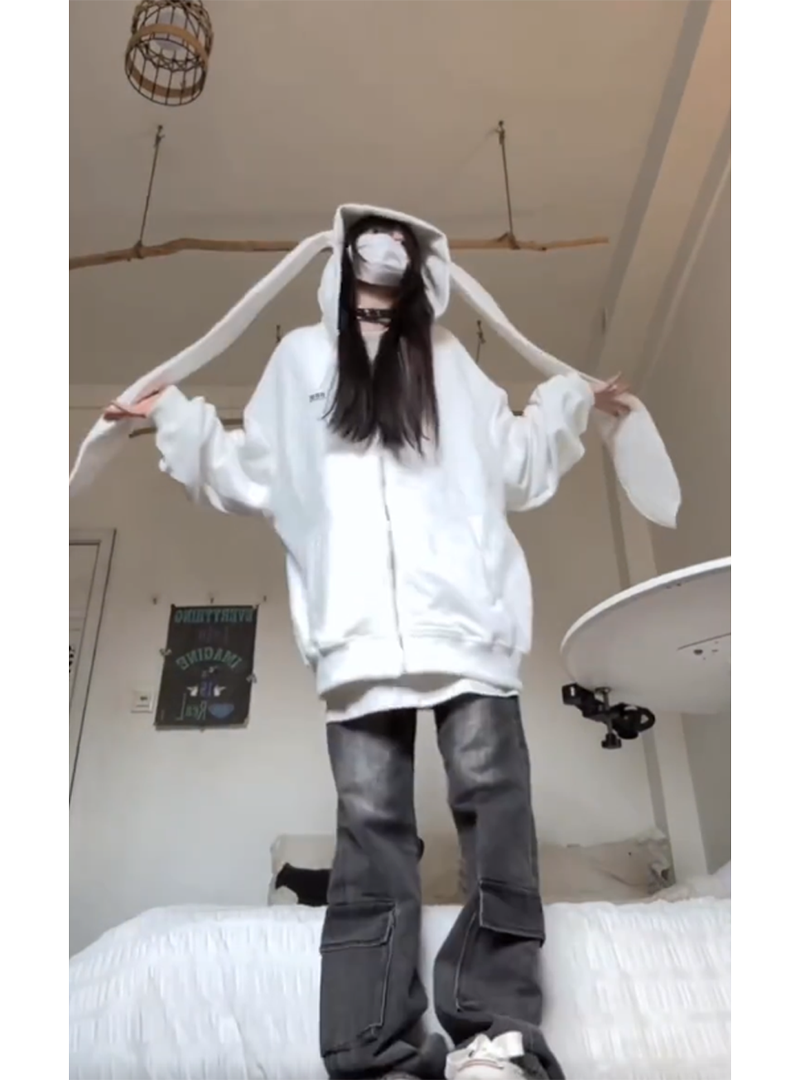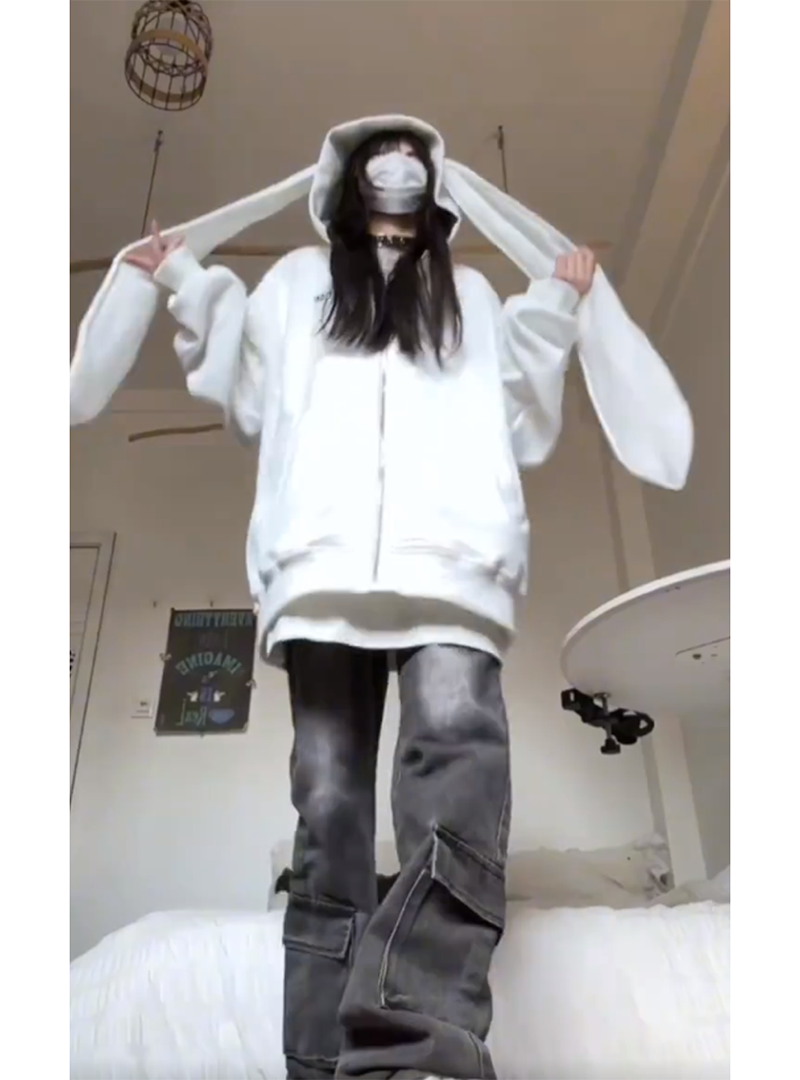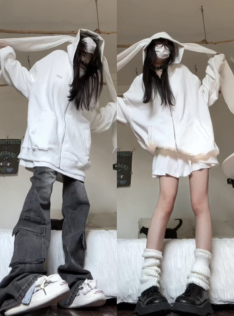 美式高街兔耳朵連帽運動衫女春秋薄款寬鬆慵懶風休閒百搭開衫外套潮