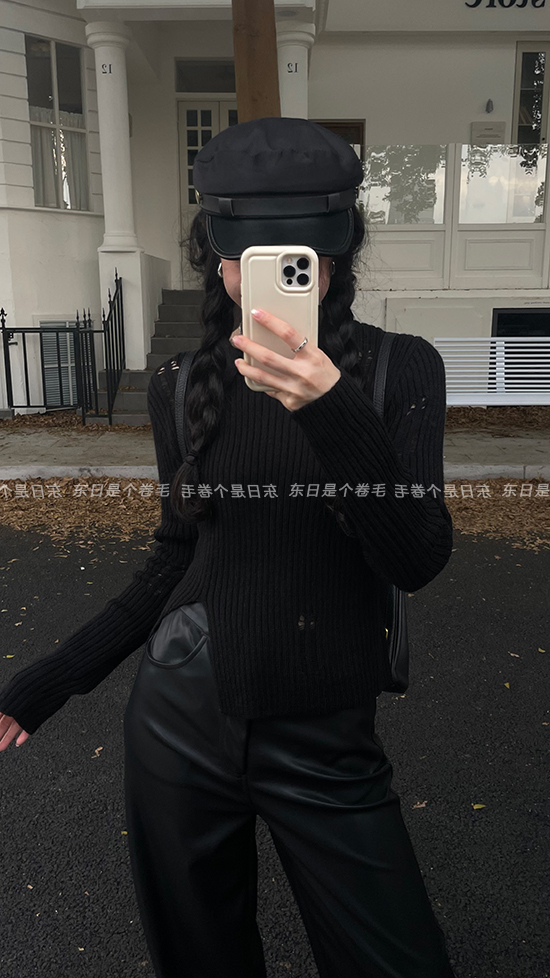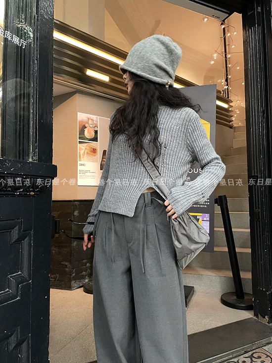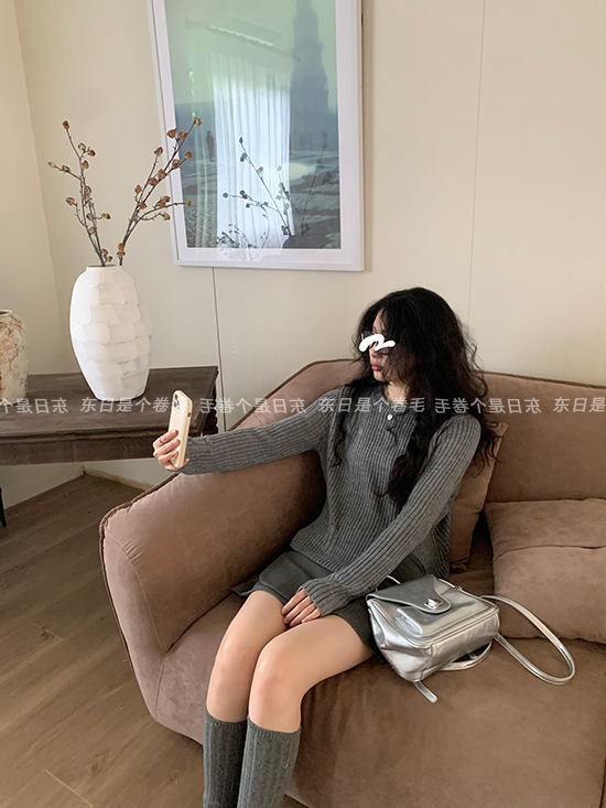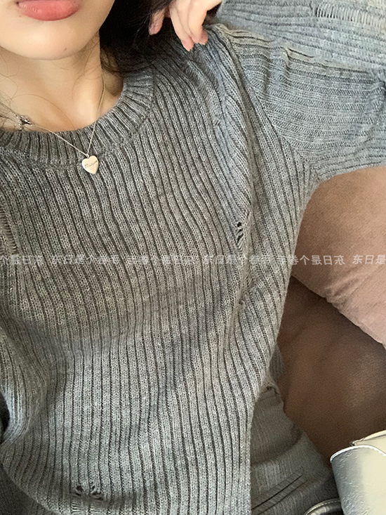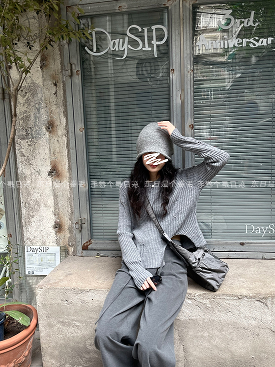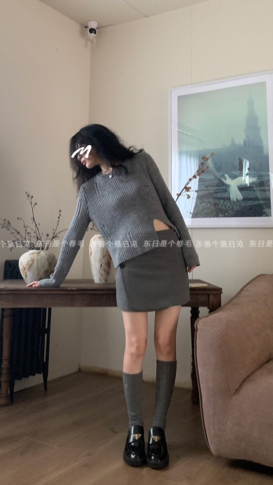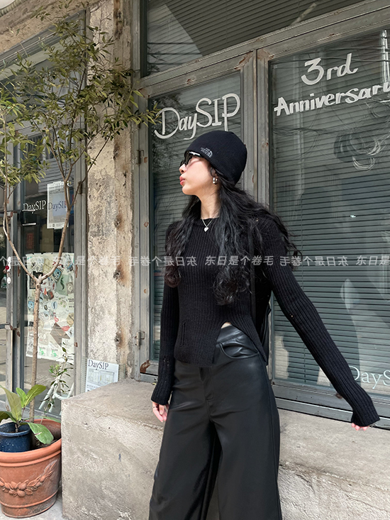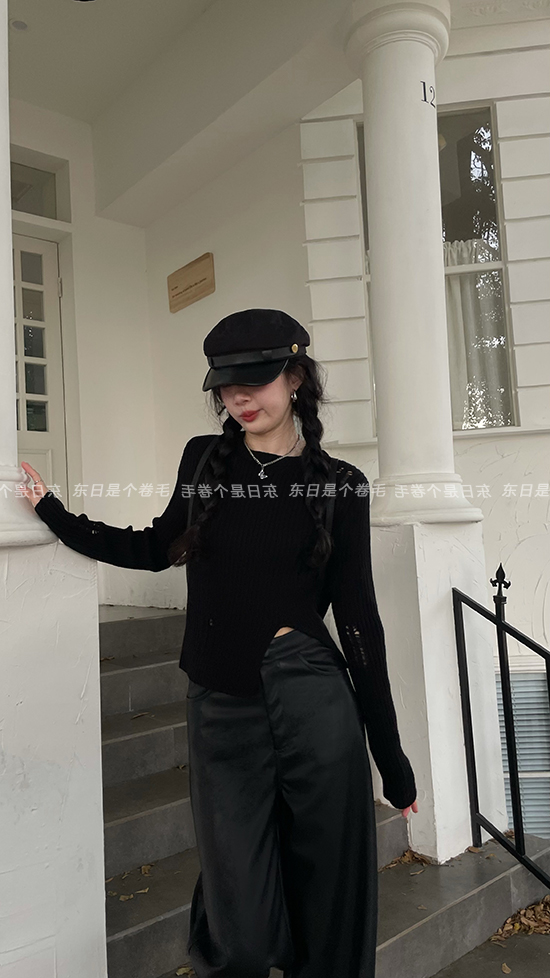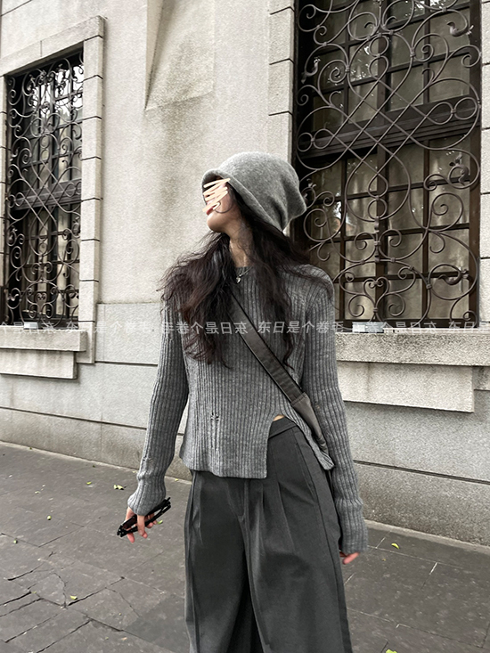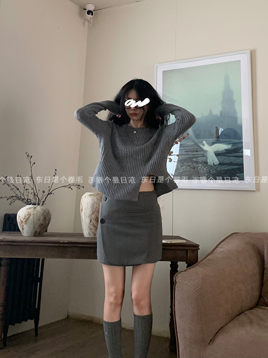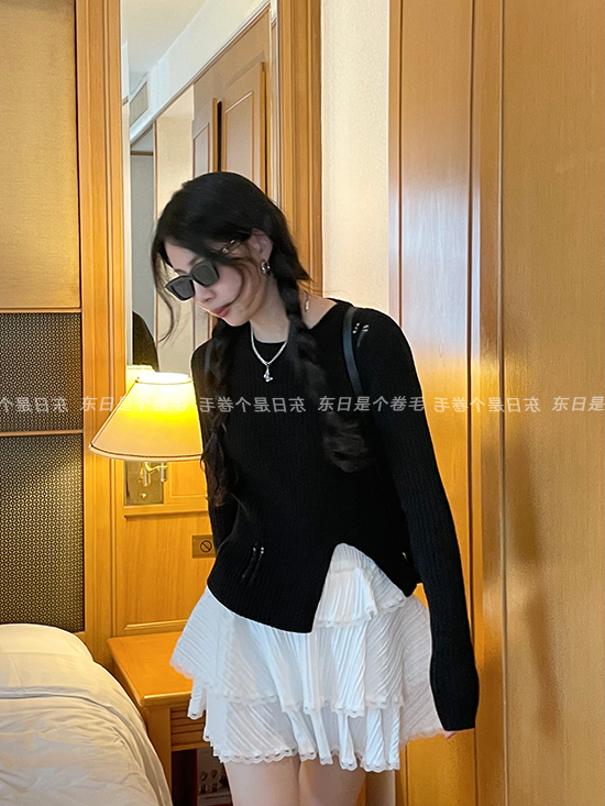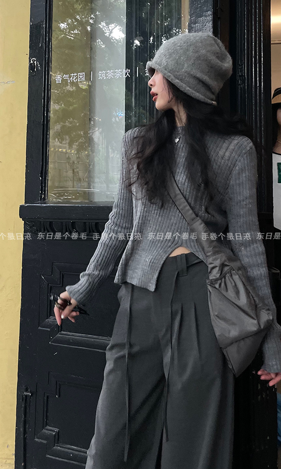 東日是個捲毛 藝術系學姐 圓領設計感毛衣女秋季套頭長袖針織上衣