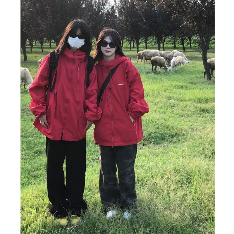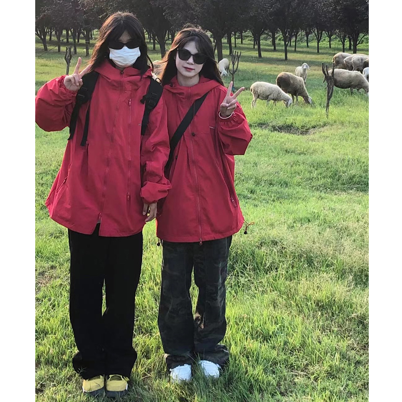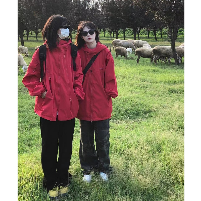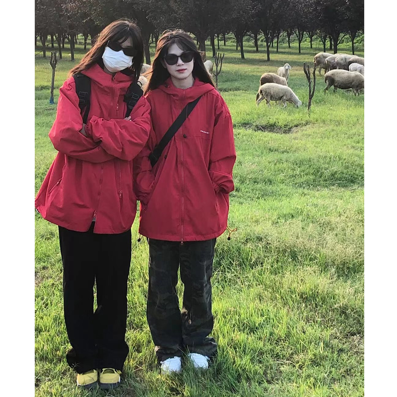 美式vintage紅色衝鋒衣女春秋款拉鍊連帽hiphop情侶寬鬆外套ins潮