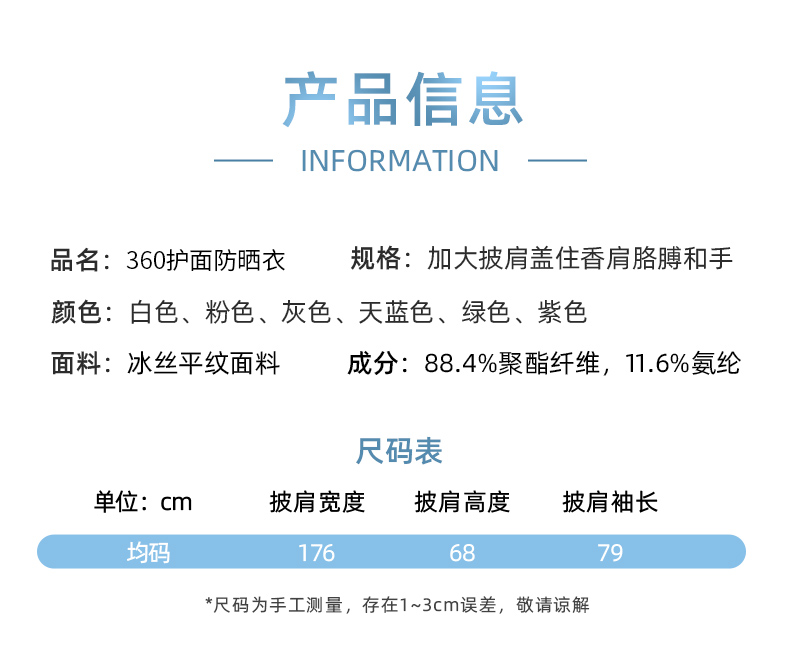 顏色分類 360護面防曬衣-淺灰,360護面防曬衣-白,360護面防曬衣-淺藍,360護面防曬衣-芭比粉,360護面防曬衣-果綠,360護面防曬衣-西瓜紅,360護面防曬衣-摩卡灰,全面防護帽+面紗+袖套(黑),全面防護帽+面紗+袖套(米白),全面防護帽+面紗+袖套(淺粉),全面防護帽+面紗+袖套(淺灰),全面防護帽+面紗+袖套(淺藍)