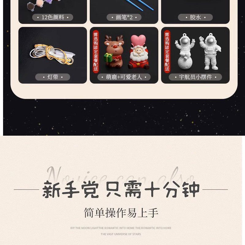 灯光颜色 COB款调亮度(所有材料)+宇航员款,COB款调亮度(所有材料)+小王子款,COB款调亮度+材料包+支架,COB三色切换+调亮度+宇航员款,LED三色切换+调亮度+宇航员款,LED单色款(所有材料)+宇航员款,LED常规款+材料包+支架