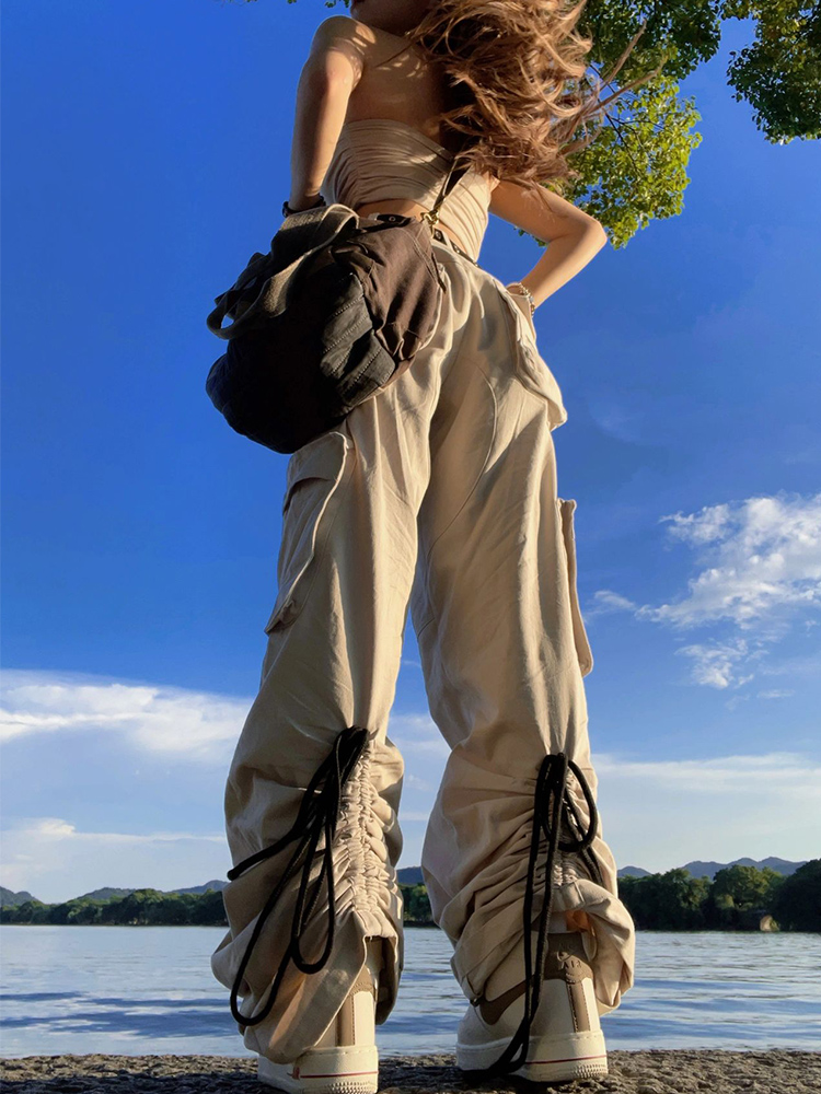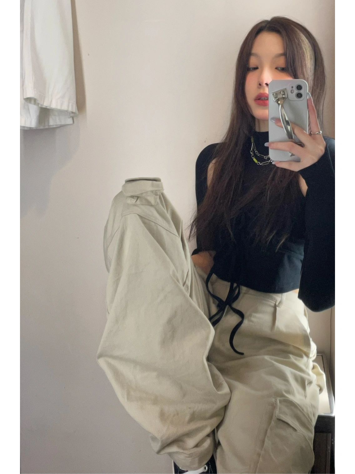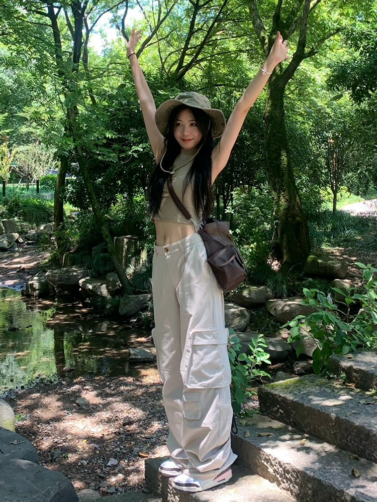 貓仕美式工裝褲女2023夏季新款復古高腰設計感小眾闊腿登山長褲子