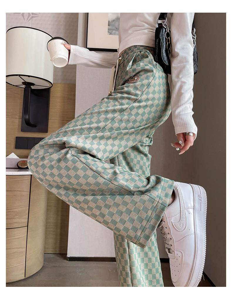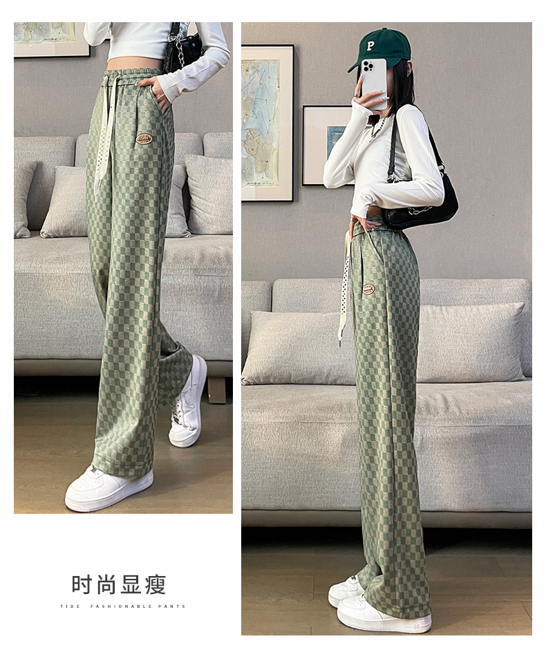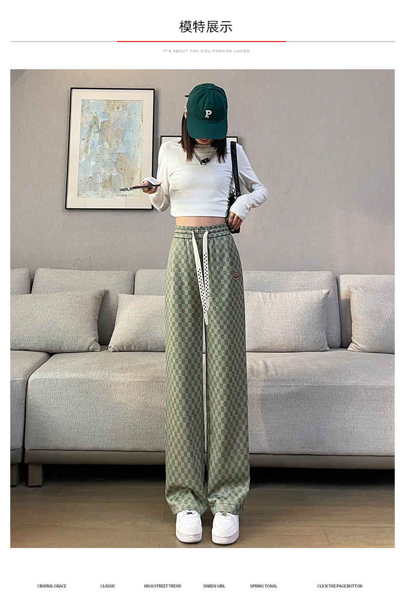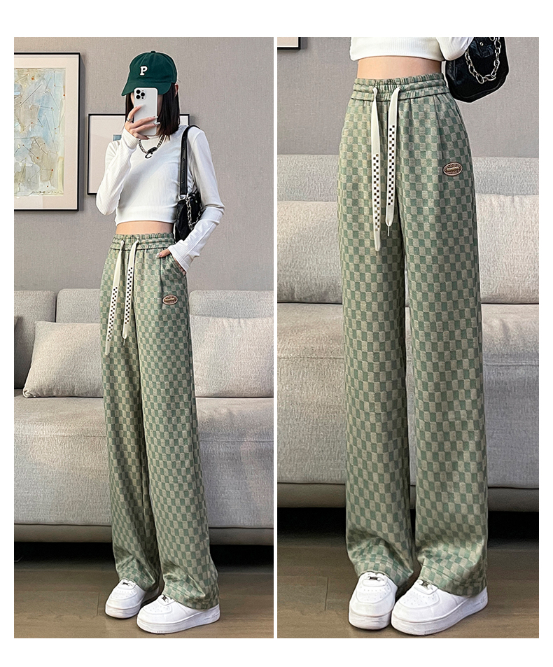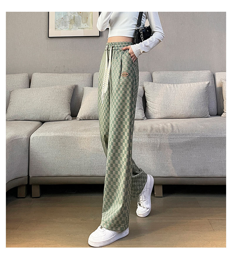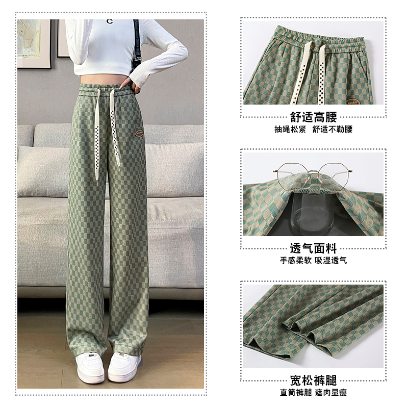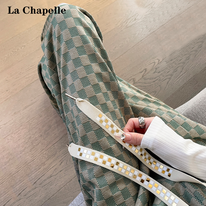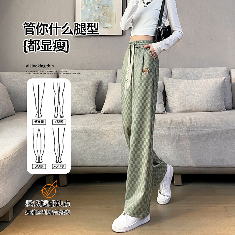 拉夏貝爾高腰寬褲女春秋款復古寬鬆休閒垂感拖地直筒棋盤格子褲