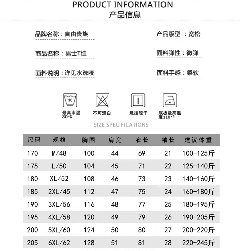 尺碼 165/S 170/M 175/L 180/XL 185/2XL 190/3XL 195/4XL 200/5XL 205/6XL
